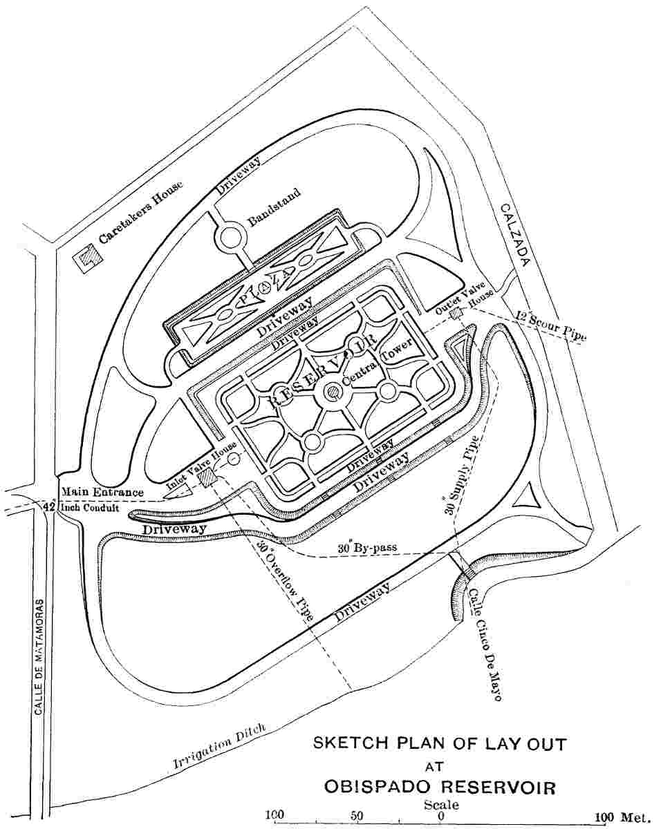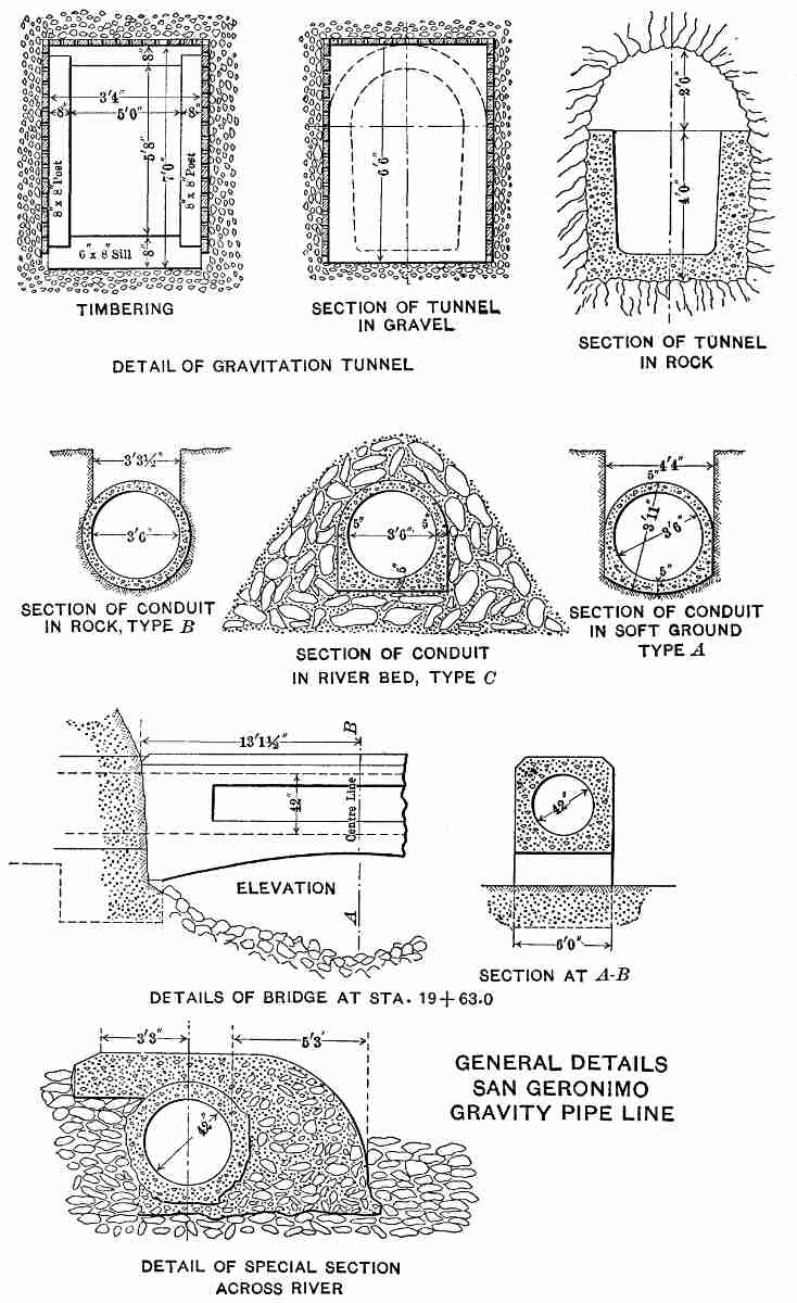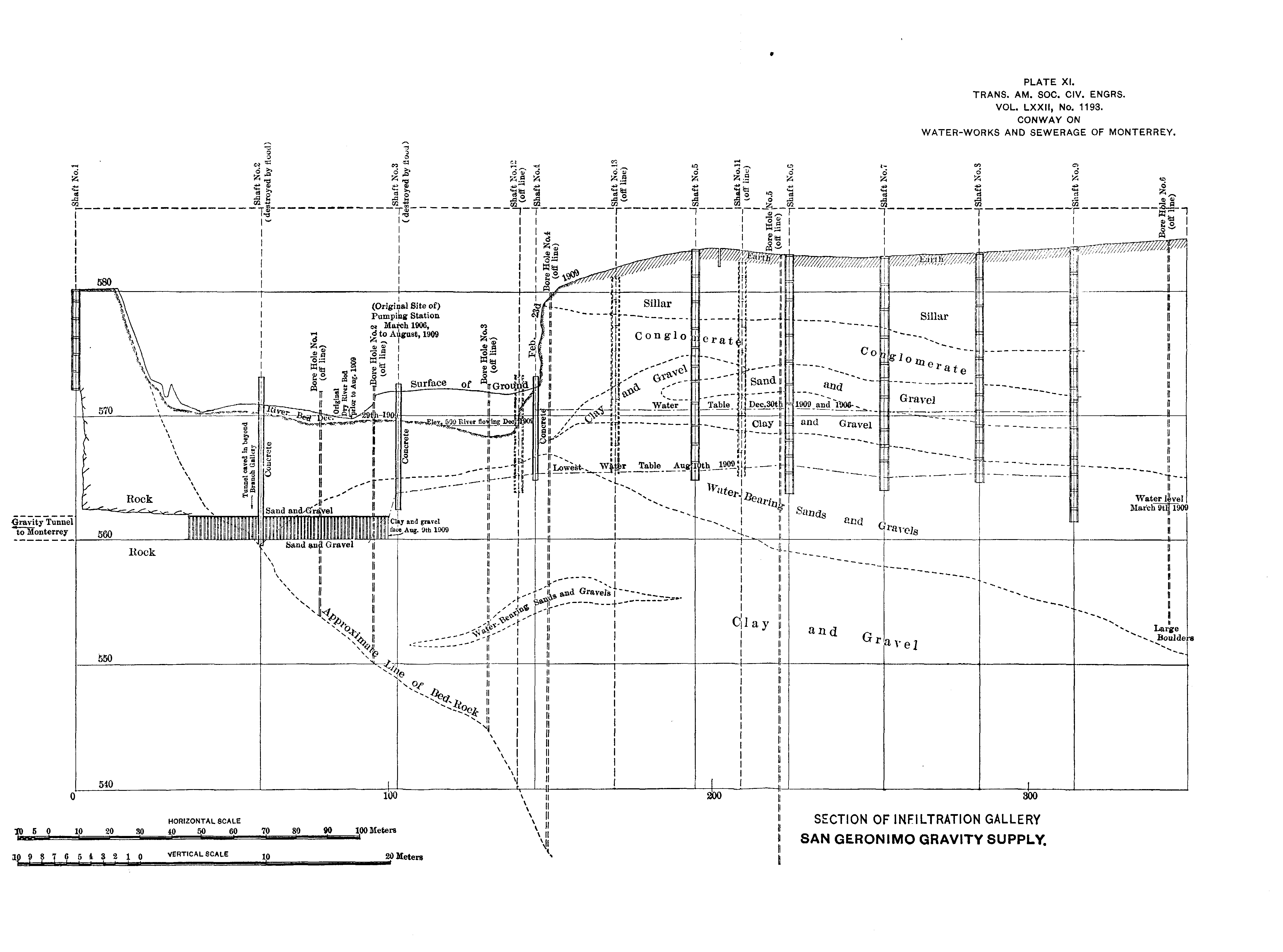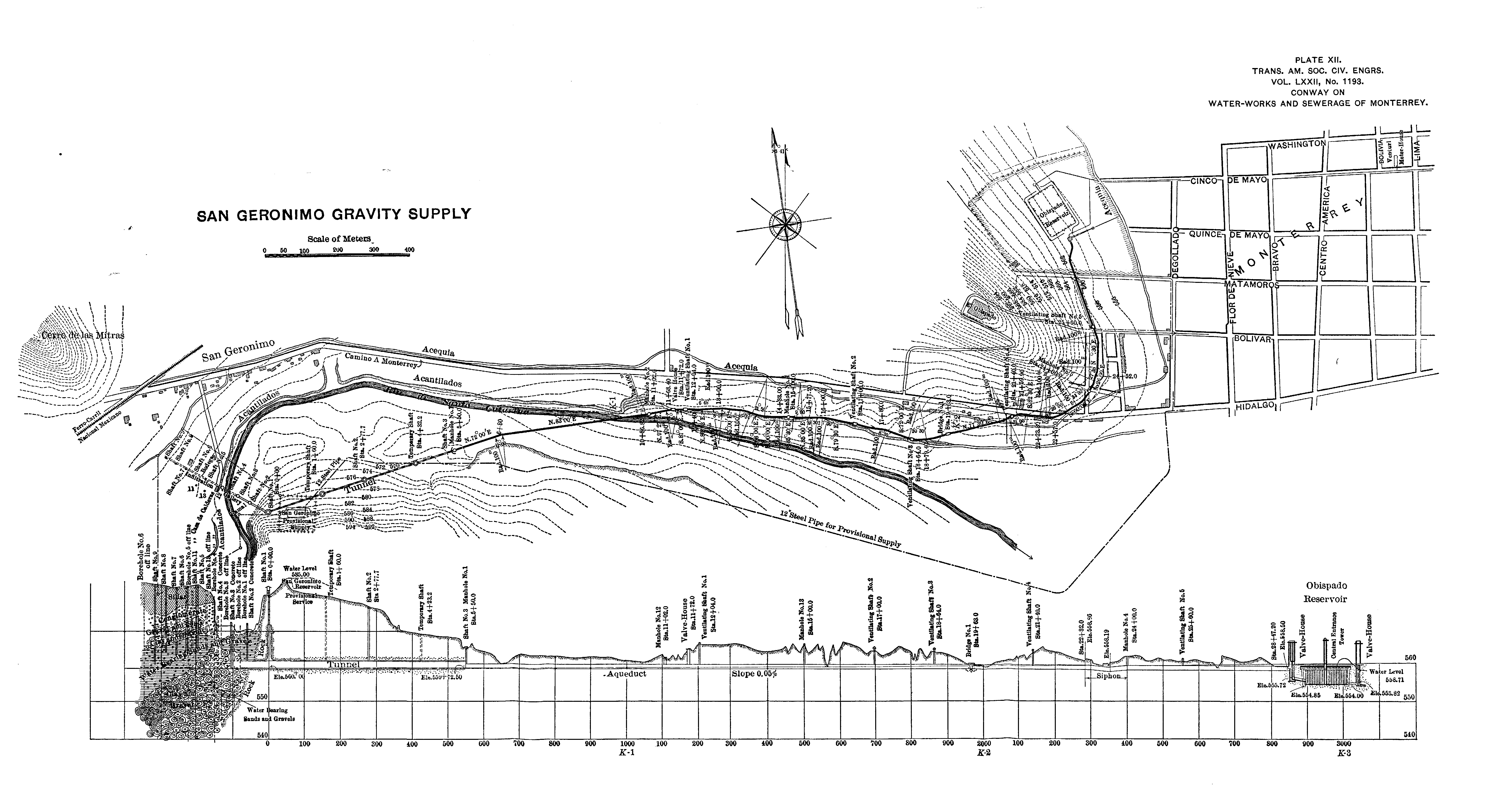 Boring operations were also carried on at Santa Catarina, during November and December, 1906, and in January, 1907, to determine the geological conditions, and the results are shown on Fig. 7. From the area of water-bearing gravels found, it was proposed to tap the underflow water at the 630-m. level by an infiltration gallery. This would have necessitated a gravitation tunnel 3,000 m. long, and an aqueduct of 14 km., which it was proposed to carry to one of two distributing reservoirs at Guadalupe, on the south side of the river, opposite Monterrey. In May, 1907, the writer, after making a study of all the available data which had been accumulated, had additional borings sunk farther across the valley to the north, and these revealed a considerable area of water-bearing gravels, and proved that, in former 489 geological times, the Santa Catarina flowed about 500 m. north of its present position, and to the back of Obispado Mountain, instead of through the city. This aspect of the subject was discussed with Mr. Schuyler, who agreed with the writer that, in the interest of economy, it was better to tap this supply by an infiltration gallery at the 560-m. level, and bring the water thus obtained to a reservoir to be placed at the western limits of the city, dividing the city, for distribution purposes, into two interchangeable systems, a high- and a low-pressure, the high-pressure system being supplied from Estanzuela, 18 km. south of the city. One advantage to be gained from this change was that the scheme was capable of considerable extension, and any future developments at Santa Catarina Cañon would form part of the works to be constructed for both high- and low-pressure districts.