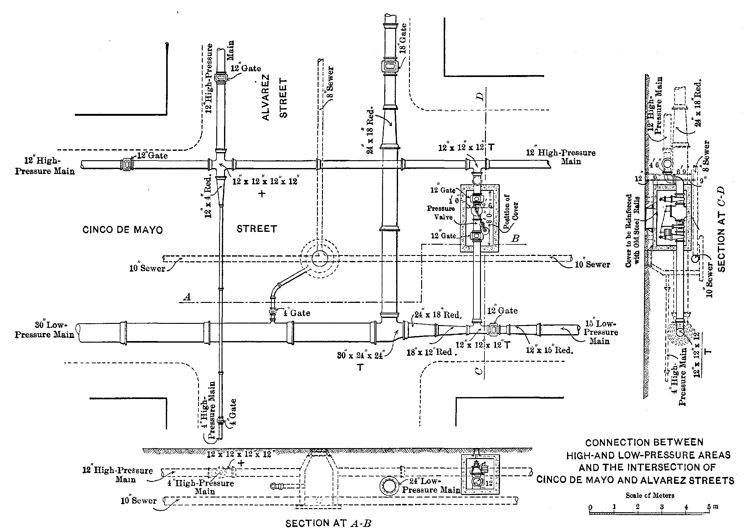 The question of a high-pressure water supply for domestic use in a city like Monterrey is not a serious one, as practically nine-tenths of the houses are of one story. The increase in the number of large commercial buildings, however, will make the demand greater in the future, and this point has been kept in mind in arranging the division of the distribution systems.