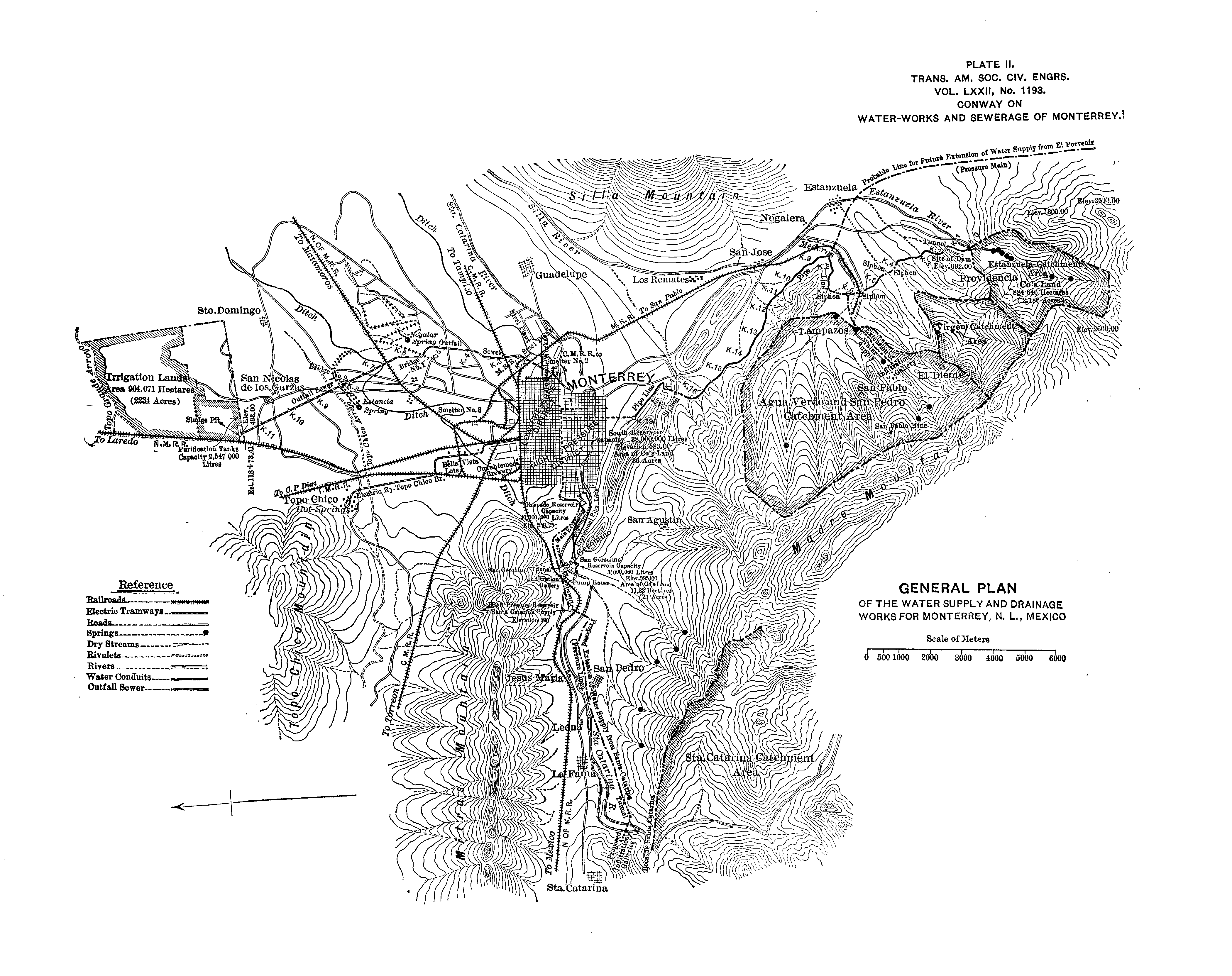 The works described in this paper were carried out under a guaranteed concession granted by His Excellency, General Bernardo Reyes, Governor of the State of Nuevo León, to Messrs. James D. Stocker and William Walker, of Scranton, Pa. The concession is dated October 19th, 1904, and is for 99 years from that date; the works for a complete water and drainage system were to be finished in 3 years from the time of their commencement. Before the works were designed and begun, the concession was acquired by Mr. William Mackenzie, of the firm of Mackenzie, Mann and Company, Limited, of Toronto, Ont., Canada, who, on May 4th, 1906, organized the Monterrey Water-Works and Sewerage Company, Limited (Compañía de Servicio de Agua y Drenaje de Monterrey, S. A.), under the laws of the Dominion of Canada, of which company he is President. Mr. Mackenzie is also President of the Monterrey Railway, Light, and Power Company, Limited, which was constructing the street railways of Monterrey concurrently with the water-works. Under the provisions of the concession, the Government appointed a Financial Interventor, who had authority to examine and check the company's expenditures, and also a Technical Inspector to examine and report on the construction. The duties of these officials also apply to the operation of the system when the construction is finished. The Government has the right, after the system has been operated 40 years, to purchase the entire property, subject to 6 months' notice, for a sum equal to 162⁄3 times the average annual net proceeds during the 3 preceding years. This right may be exercised at the end of 40 years, or at the end of any 10-year period thereafter, up to 99 years from the commencement of operations.