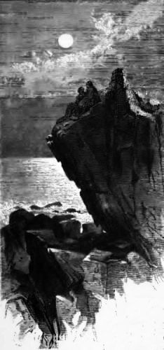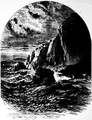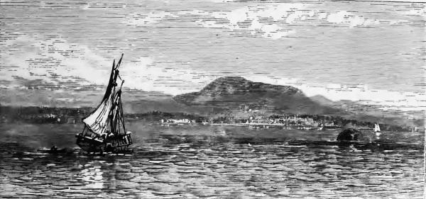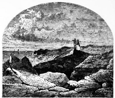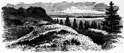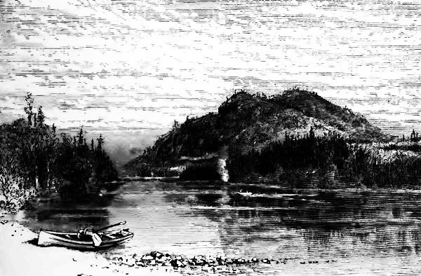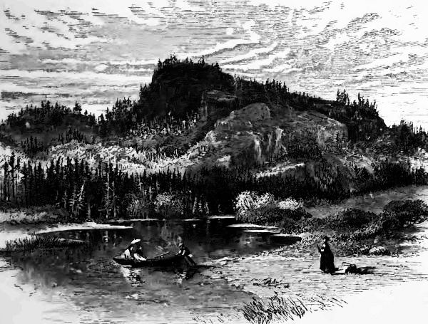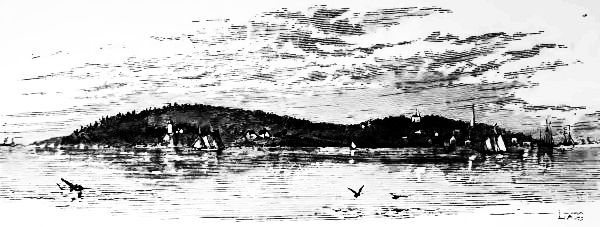 In a little "pattache" of only seventeen or eighteen tons burden, he had set out on the 2d of September, 1604, from St. Croix, to explore the coast of Norumbega. Two natives accompanied him as guides. The same day, as they passed close to an island four or five leagues long, their bark struck a hardly submerged rock, which tore a hole near the[Pg 29] keel. They either sailed around the island, or explored it by land, as the strait between it and the main-land is described as being not more than a hundred paces in breadth. "The land," continues the French voyager, "is very high, intersected by passes, appearing from the sea like seven or eight mountains ranged near each other. The summits of the greater part of these are bare of trees, because they are nothing but rocks." It was during this voyage, and with equal pertinence, Champlain named Isle au Haut.[12] According to Père Biard, the savages called the island of Mount Desert "Pemetiq" "meaning," says M. l'Abbé Maurault, "that which is at the head." A crowned head it appears, seen on land or sea.