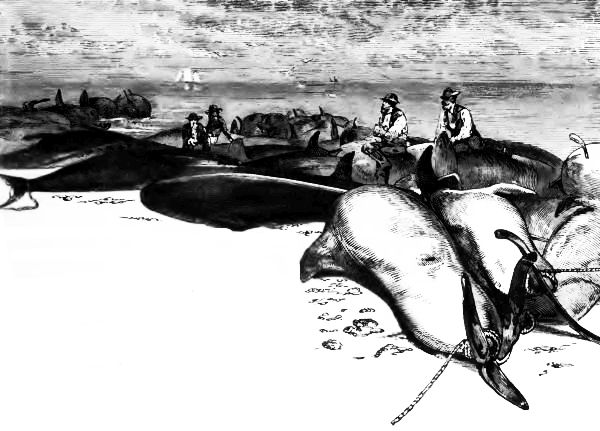Taking Blackfish.—Blue-fishing at the Opening.—Walk to Coatue.—The Scallop-shell.—Structure of the Island.—Indian Legends.—Shepherd Life.—Absolutism of Indian Sagamores.—Wasting of the Shores of the Island.—Siasconset.—Nantucket Carts.—Fishing-stages.—The Great South Shoal.—Sankoty Light.—Surfside.