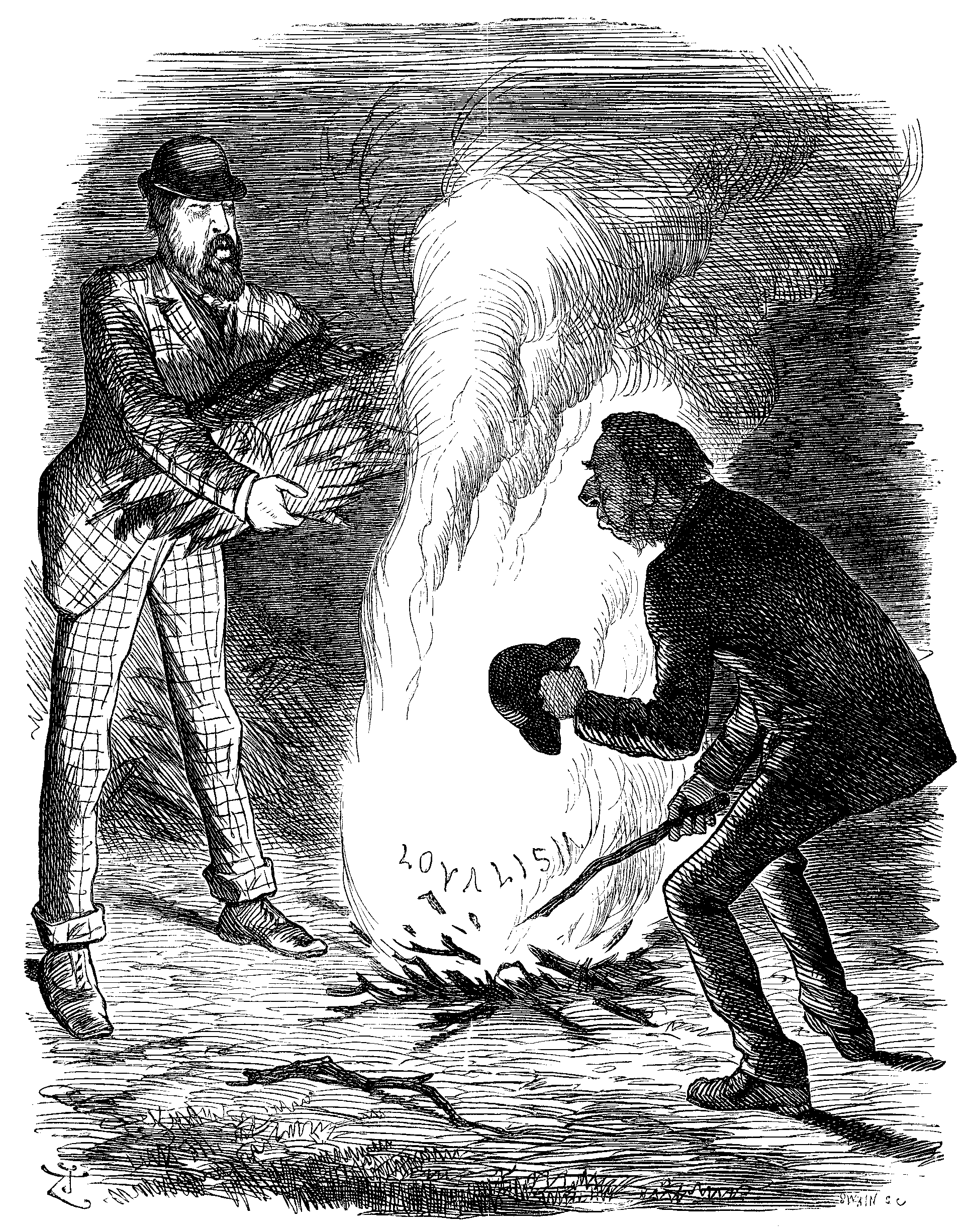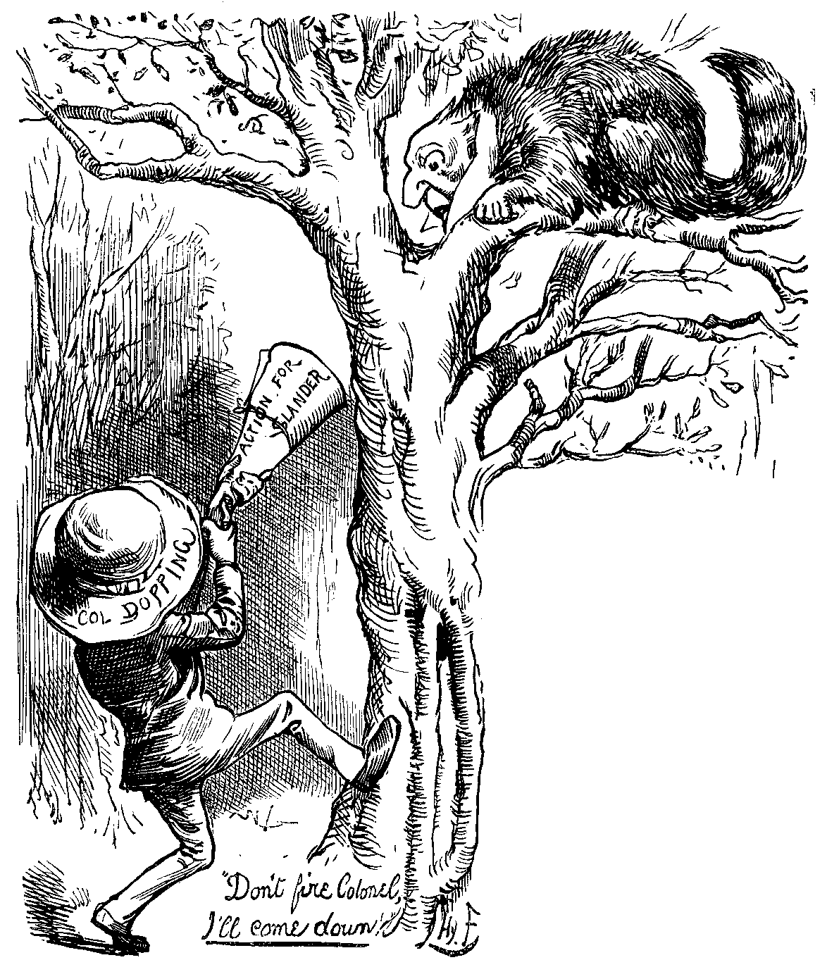 Meeting announced to take place at eight o'clock. On the very strike of the hour, a stentorian voice, not unfamiliar in the House of Commons, floated over the assembled multitude. "Men of Longford," it said, "we are assembled here in the exercise of our privilege as free men." First of all they could not tell where the voice came from. Looking up, behold! there was Tim planted inside the top of the tall chimbley, using it like a Bishop's pulpit. It was a capital idea, and worked admirably for half an hour, with the Police all throbbing and raging round, and Tim eyeing them quite calmly, and all the crowd roaring and cheering, and throwing up their hats, and B-lf-r getting it hot. Somehow, whether from treachery or accident no one knows, and perhaps never will know, but in the middle of one of his best sentences, Tim suddenly vanished from sight, and was a clear three minutes later picked up from among the cinders in the furnace below. The proceedings then terminated.