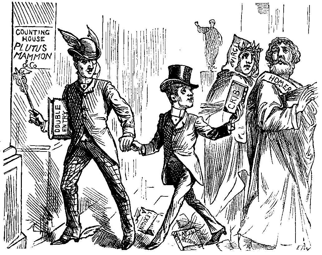 Twelve o'Clock struck, and the Fourth Form at St. Dunstan's left its class-room with a rush. The old hour of leaving off the morning's studies was still preserved. Yet, in conformity with the spirit of the times, the venerable foundation of St. Dunstan's had recently witnessed great changes. The Governing Body had taken the matter in hand, and had gone to work with a will. The teaching of Greek and Latin had been entirely suppressed, polite literature eliminated, and the whole curriculum of the school arranged solely to the provision of that glaring want of the times, a sound commercial education. To effect this, some radical changes had been necessary. The Rev. Jabez Plumkin, D.D., Oxford Prizeman, through whose unwearied exertions, for the past five-and-twenty years, St. Dunstan's had been gradually acquiring an increasing fame in the Class-lists of both Universities, had been forcibly ejected from the Head-Mastership, and his place filled by a leading member of a well-known firm of advertising stock-jobbers, and the Assistant-Masters had all been selected on similar lines.