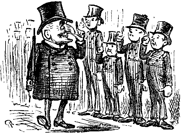 "Company-floating," was taught by a late Promoter, who had had much experience in the creation of many bubble concerns, and "Rigging the Market" was entrusted to a Professor who was known, in his capacity as Accountant to a wholesale City Cheese Warehouse, to have contracted a thorough familiarity with this important subject of the new commercial education. Everything was done to foster a spirit of keen speculative enterprise in the boys. The whole traditions of the school were changed. The old idea of honour had died out. How to over-reach each other by sharp practice was the one idea that animated every youthful breast from the senior in the Sixth to the junior in the Under Third. The tape was always working at the Principal's desk. The study-tables were covered with Stock and Mining Journals. Even the playground was turned into a Money Market. Cricket had been banished to make way for the more exciting game of "Bulls and Bears," and the Principal passing through occasionally, would sometimes stop and say, "That's right, my boys, learn to do each other, and remember the motto of your School, 'Monies maketh man.'" Posted up upon the gates, communicated by telegraph hourly from the City, were every day to be found the latest prices. And it was to get a first look at this that the Fourth Form had just left its class-room with a rush.
