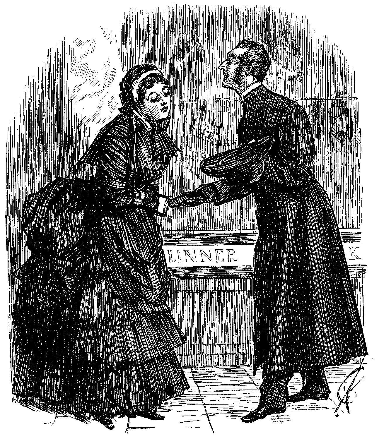What can be more dismal than the fourth day of a Fancy Bazaar for a "Sale of Work," in aid of a parochial charity? Honestly, I do not know. I fancy that even the proverbial "Mute at a funeral," must be livelier. That is my present opinion, and it was the same last Thursday, when lured by a programme quaintly printed in "old-faced" type, and having "ye" in lieu of "the," and "Maister" instead of Mister, I made my way to the Portman Rooms in Baker Street, (formerly Madame Tussaud's) and sought admission to "Old Marybone Gardens, A.D. 1670." Outside the ex depôt of Waxworks, were two persons in the costume of the last Century distributing circulars, and later on I met another couple similarly apparelled heading a procession of Sandwich-men walking down Waterloo Place. In the Hall of the Bazaar lads in the same sort of dresses, were selling programmes (marked sixpence) for twopence. I entered by a small canvass-cottage "y'clept" (as the Sale of Workers would call it) "the Rose of Normandy," and found myself in the once famous "Hall of Kings" without the figures. I discovered two or three dwarf trees, some lattice-work and a lot of canvass-covering. I must confess it did not cause me much surprise to find only a few spectators. The moment I appeared, a lady advanced and asked me in a tone of authority to take a button-hole. I refused with courtesy suggestive at once of the gallant and the miser, and the Sale of Work-woman retired rather crest-fallen. Then two girls, costumed as two females of a past but vague period, dashed at me as I turned away, and breathlessly explained that if I bought a half-crown ticket I should be entitled to a chance in a raffle for a five-guinea sofa-cushion. I slightly frowned as I expeditiously refused the invitation, and the ladies disappeared into a corner—I trust more in sorrow than in anger—to read the evening paper. In the centre of the room was a "fish pond" full of presents, where a mild-looking curate was feebly attempting to secure a prize. On the whole the entertainment was scarcely exhilarating. The programme promised "from V to VI of ye clocke" (how silly!) "a séance of Mesmerism," in two "partes," (how really stupid!) and "Maister Charles Bertram" (Why "Maister?") was to appear later on. Then at eight "of ye clocke" (dear, dear! how idiotic!) "the Welbeck Dramatic Club" (what a name!) was "to performe ye Comic Drama by L. S. Buckingham, y'clept" (of course!) "Take that Girl away." Later still "Mistresse Jarley" was to give her waxworks with the assistance of "Maister Sidney Ward," (tut, tut!) the Festival finally closing with "Music" at "X of ye clocke" (stuff and nonsense!). It will be seen that I cannot even now look at the programme (priced at sixpence and sold for twopence) without some signs of impatience. The afternoon was too young to allow of my assisting at any of these toothsome merry-makings, so after mooning about for a quarter of an hour I came away. As I left, a newly-arrived dame of mature years was putting on a nurse's cap hurriedly, evidently with the view to starting in hot pursuit of me to secure my custom for some toys. The ladies with the cushion looked at me languidly as I passed them, and then returned to a perusal of their paper. When last I had had the advantage of paying a visit to "the Portman Rooms, formerly Mme. Tussaud's," I had seen nothing but waxwork figures in eccentric attitudes. On the whole, I think the former denizens of the place looked more at home in their quaint costumes than the Sale of Workers "from Tuesday, November 22 to Saturday, November 26, inclusive!"