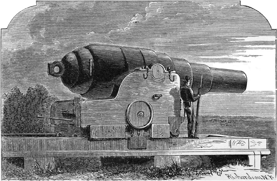 A little to the westward, a walled enclosure, embracing the Ordnance Laboratory, is situated, and there may be seen a great variety of trophy guns from Cedar Creek and from Vicksburg, among which is the famous "Whistling Dick," an English rifled breech-loading Whitworth gun, captured on Morris Island, and the formidable Armstrong gun, captured at Fort Fisher, off Wilmington. Here, also, may be seen the gun from Elder's Battery, which fired the last shot previous to the surrender of Lee's Army. These, and a great variety of torpedoes, shot, shells and other Rebel implements of warfare, will well repay the visitor by the variety of design they exhibit. Pursuing the road down the hill, to the North wharf, the Sea-coast battery, with its [35]armament of rifled monsters, consisting of 30-pound, 100, 200, and 300-pound Parrots, the 15-inch gun, and the 13-inch mortar, all capable of hurling projectiles as far as Pollopel's Island, or beyond, arrests the attention of the observer, and furnishes tangible evidences of the triumphant progress of manufacturing skill in weapons of war.