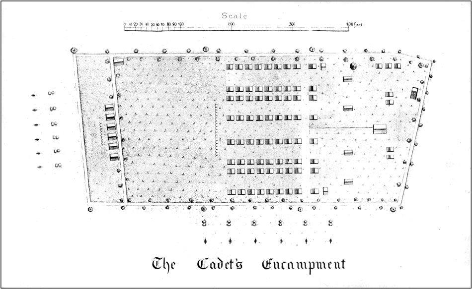 The buildings appropriated to the occupation and education of the Cadets, are not without attractive interest to the visitor. The Cadets' Barrack, from its magnitude, symmetrical proportions, durability, and castellated structure, seldom fails to elicit commendation from all lovers of architecture who are drawn to its vicinity. The [39]building contains eight divisions, of which two are assigned to each of the four companies of Cadets. Two occupants only are found in a room, each uniformly furnished with an iron bedstead, an iron table, chair, books, and wearing apparel; all other furniture being carefully excluded as unnecessary or unworthy of the student soldier. Warmed by furnaces, lighted by gas, with daily access to bath-rooms, and invigorated by their military exercises, the Cadets present an appearance of health and contentment seldom seen in other collegiate institutions.