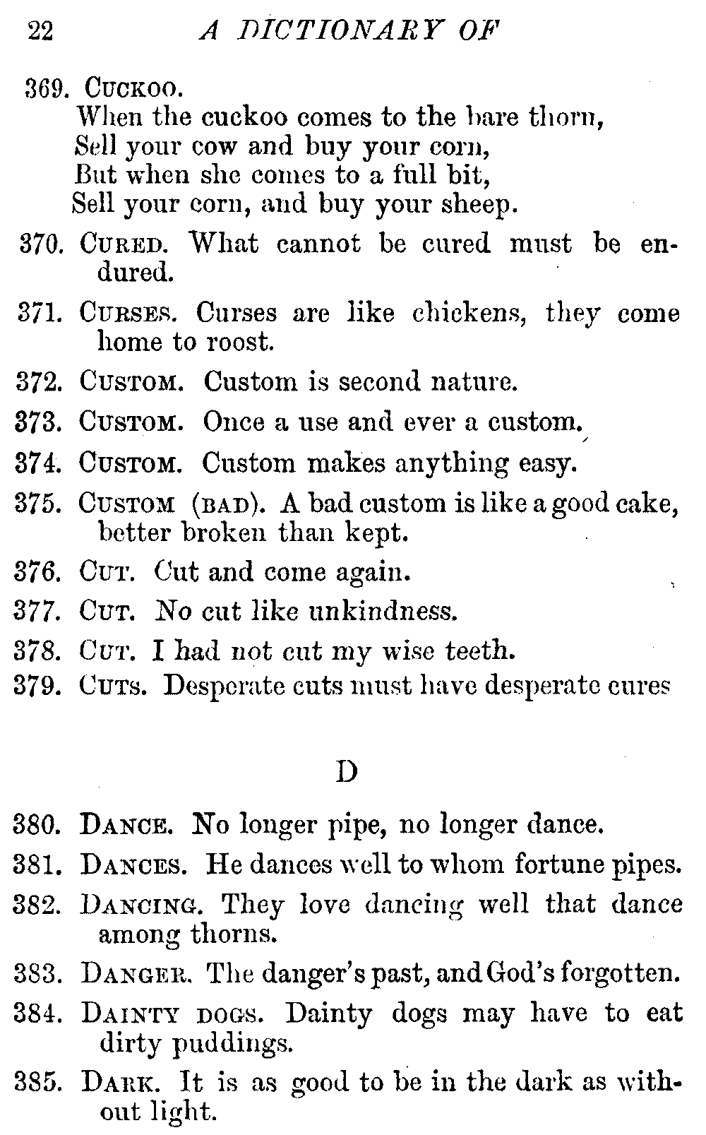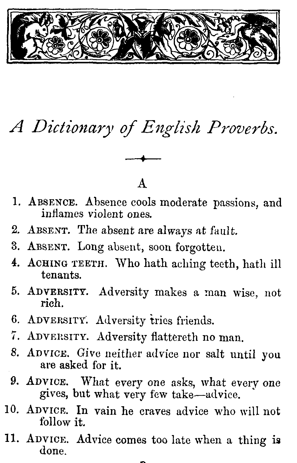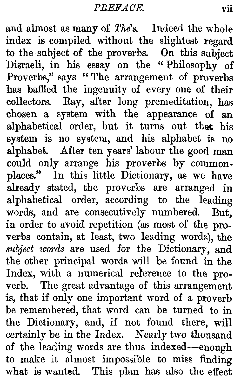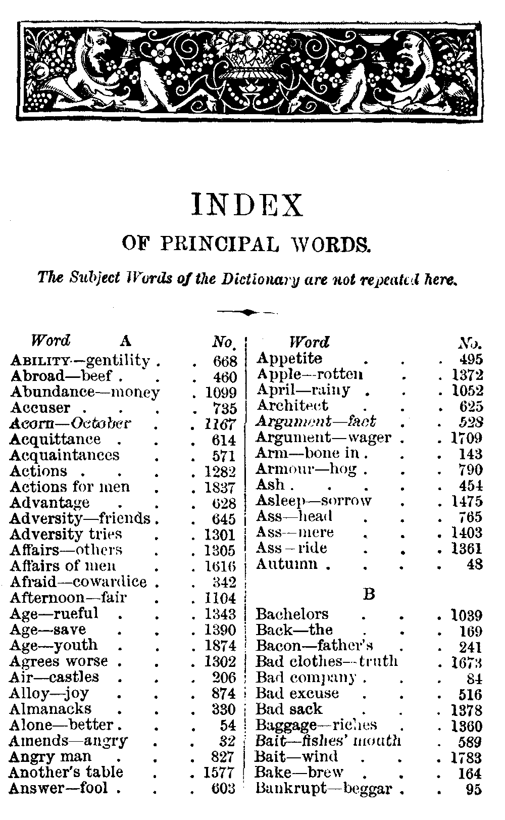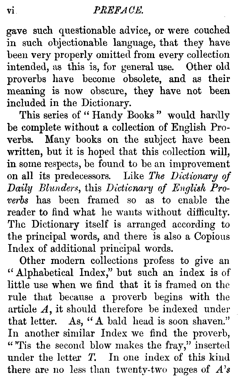 Other modern collections profess to give an "Alphabetical Index," but such an index is of little use when we find that it is framed on the rule that because a proverb begins with the article A, it should therefore be indexed under that letter. As, "A bald head is soon shaven." In another similar Index we find the proverb, "'Tis the second blow makes the fray," inserted under the letter T. In one index of this kind there are no less than twenty-two pages of A's [vii]and almost as many of The's. Indeed the whole index is compiled without the slightest regard to the subject of the proverbs. On this subject Disraeli, in his essay on the "Philosophy of Proverbs," says "The arrangement of proverbs has baffled the ingenuity of every one of their collectors. Ray, after long premeditation, has chosen a system with the appearance of an alphabetical order, but it turns out that his system is no system, and his alphabet is no alphabet. After ten years' labour the good man could only arrange his proverbs by commonplaces." In this little Dictionary, as we have already stated, the proverbs are arranged in alphabetical order, according to the leading words, and are consecutively numbered. But, in order to avoid repetition (as most of the proverbs contain, at least, two leading words), the subject words are used for the Dictionary, and the other principal words will be found in the Index, with a numerical reference to the proverb. The great advantage of this arrangement is, that if only one important word of a proverb be remembered, that word can be turned to in the Dictionary, and, if not found there, will certainly be in the Index. Nearly two thousand of the leading words are thus indexed—enough to make it almost impossible to miss finding what is wanted. This plan has also the effect [viii]of bringing together the proverbs on kindred subjects, which is often a matter of importance to writers, and is, moreover, most amusing to those who only read the book to while away a leisure hour. Ready reference is further facilitated in the Index by the addition of associated words. If one word only had been given, the reader might have had to refer to eleven proverbs before he found the one he required; as, for example, in the case of Dog.