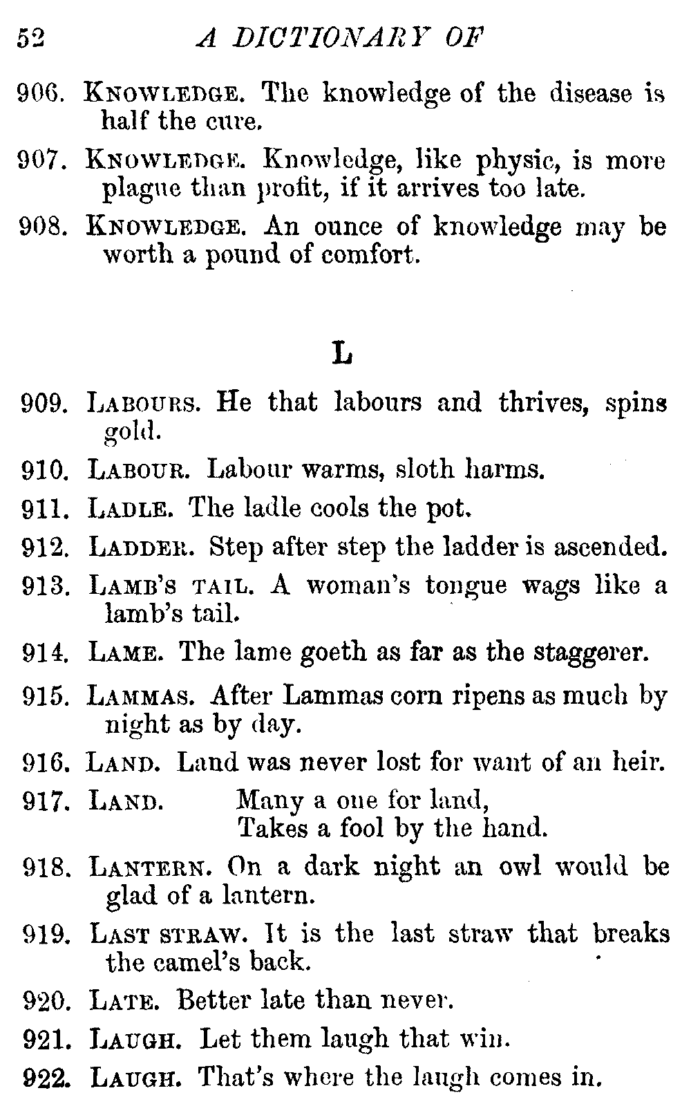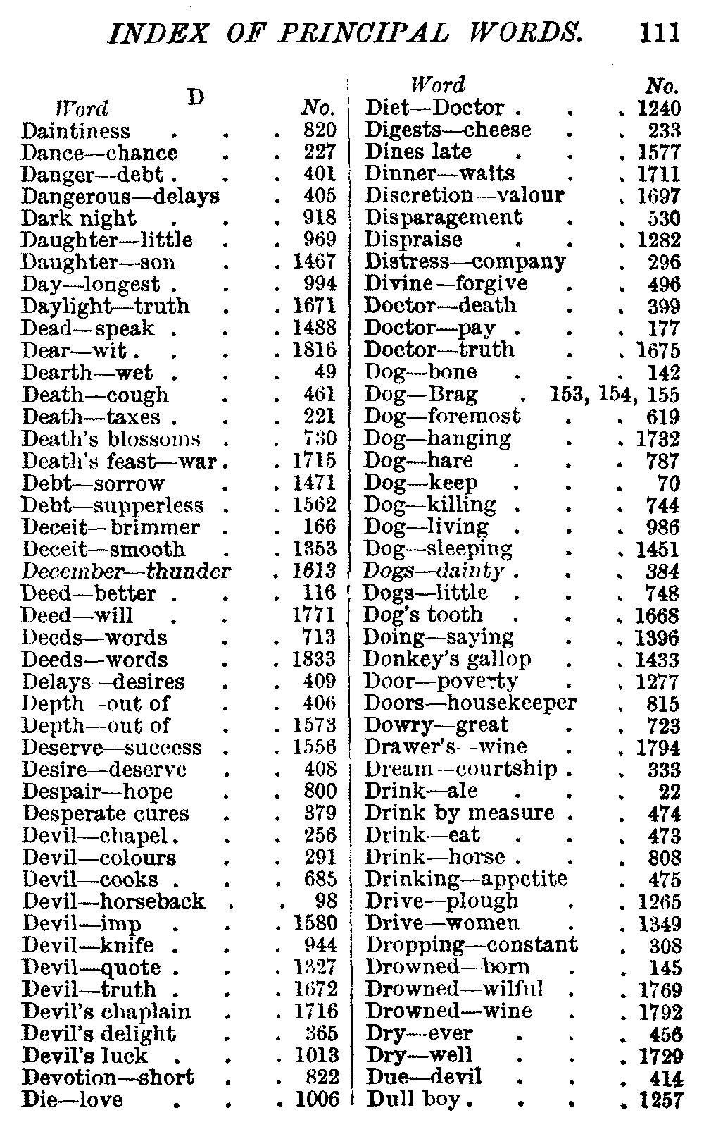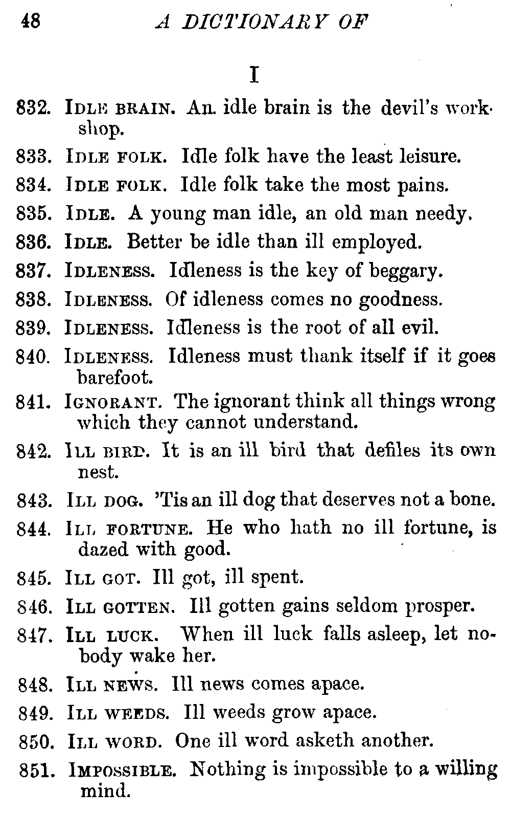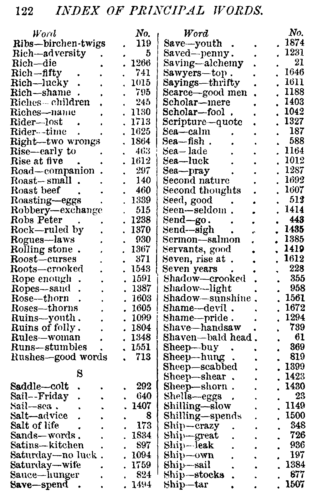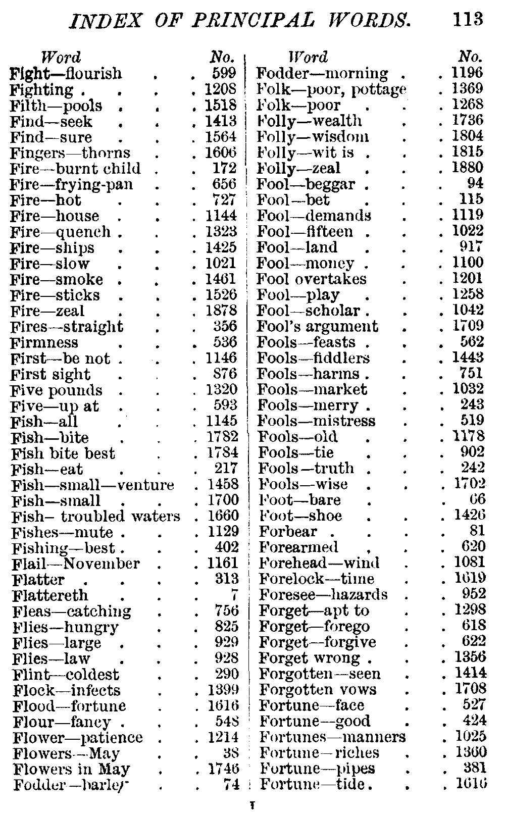 Other modern collections profess to give an "Alphabetical Index," but such an index is of little use when we find that it is framed on the rule that because a proverb begins with the article A, it should therefore be indexed under that letter. As, "A bald head is soon shaven." In another similar Index we find the proverb, "'Tis the second blow makes the fray," inserted under the letter T. In one index of this kind there are no less than twenty-two pages of A's [vii]and almost as many of The's. Indeed the whole index is compiled without the slightest regard to the subject of the proverbs. On this subject Disraeli, in his essay on the "Philosophy of Proverbs," says "The arrangement of proverbs has baffled the ingenuity of every one of their collectors. Ray, after long premeditation, has chosen a system with the appearance of an alphabetical order, but it turns out that his system is no system, and his alphabet is no alphabet. After ten years' labour the good man could only arrange his proverbs by commonplaces." In this little Dictionary, as we have already stated, the proverbs are arranged in alphabetical order, according to the leading words, and are consecutively numbered. But, in order to avoid repetition (as most of the proverbs contain, at least, two leading words), the subject words are used for the Dictionary, and the other principal words will be found in the Index, with a numerical reference to the proverb. The great advantage of this arrangement is, that if only one important word of a proverb be remembered, that word can be turned to in the Dictionary, and, if not found there, will certainly be in the Index. Nearly two thousand of the leading words are thus indexed—enough to make it almost impossible to miss finding what is wanted. This plan has also the effect [viii]of bringing together the proverbs on kindred subjects, which is often a matter of importance to writers, and is, moreover, most amusing to those who only read the book to while away a leisure hour. Ready reference is further facilitated in the Index by the addition of associated words. If one word only had been given, the reader might have had to refer to eleven proverbs before he found the one he required; as, for example, in the case of Dog.