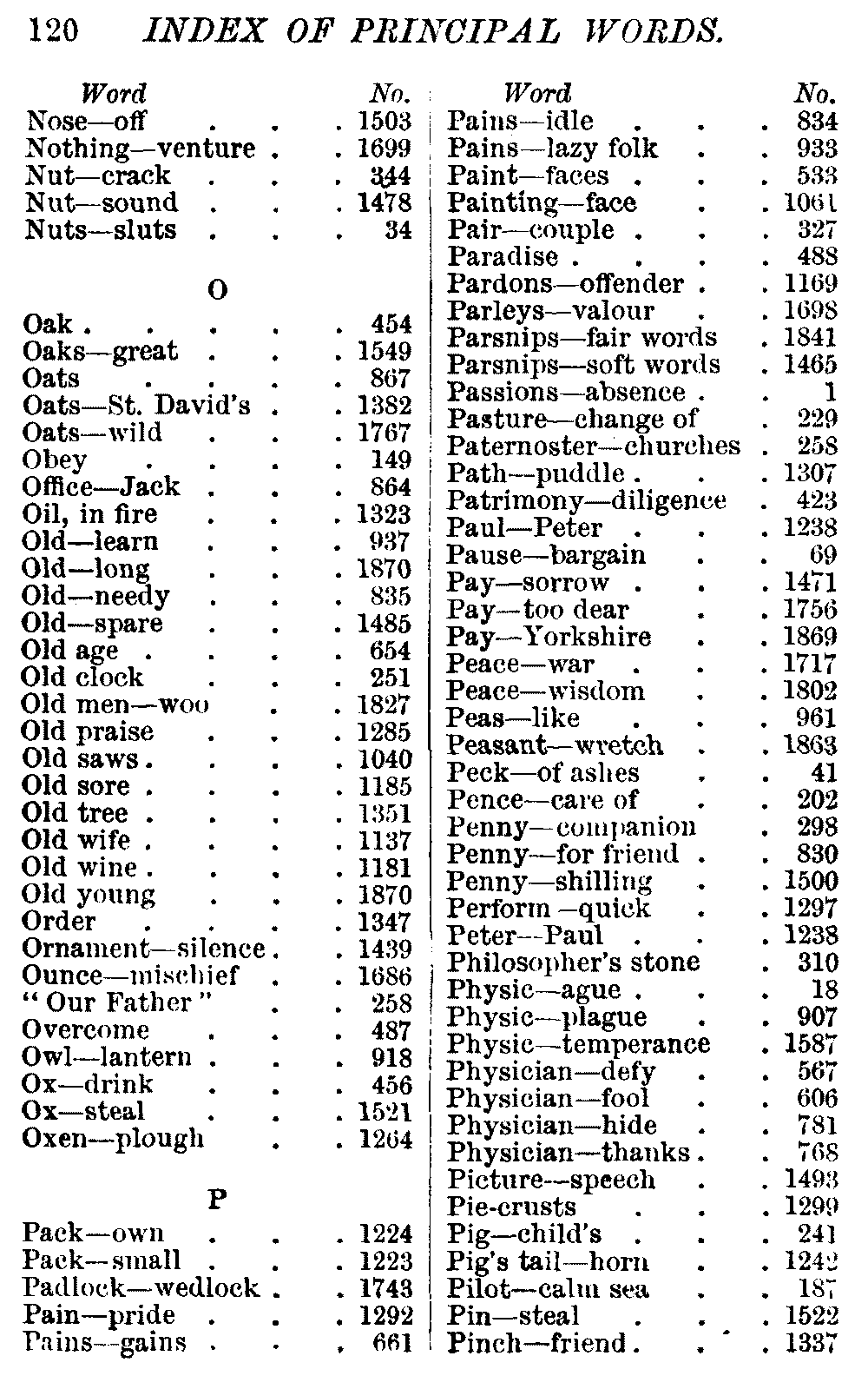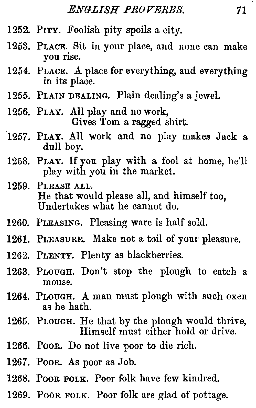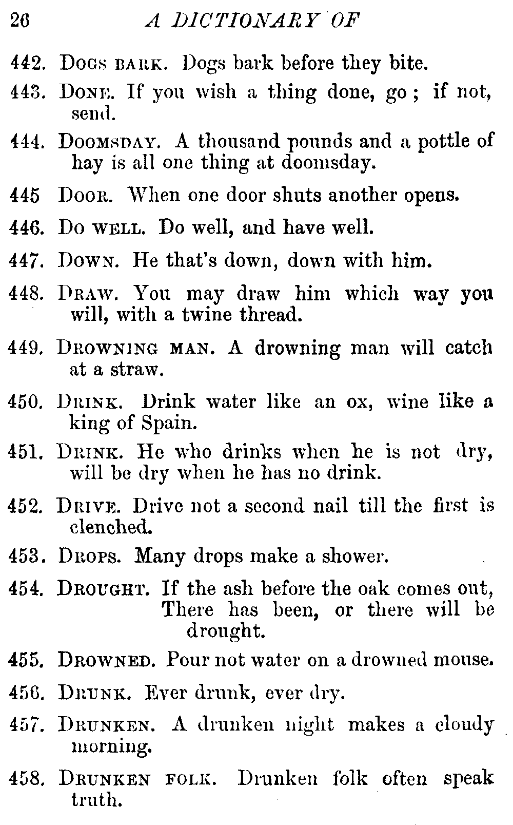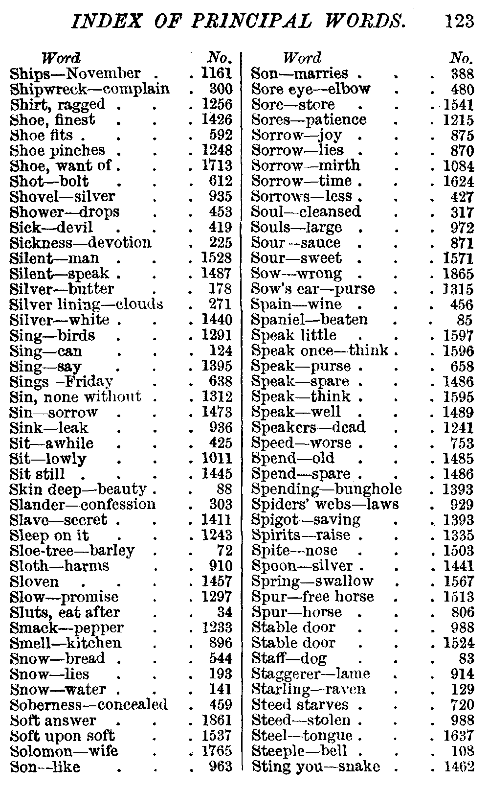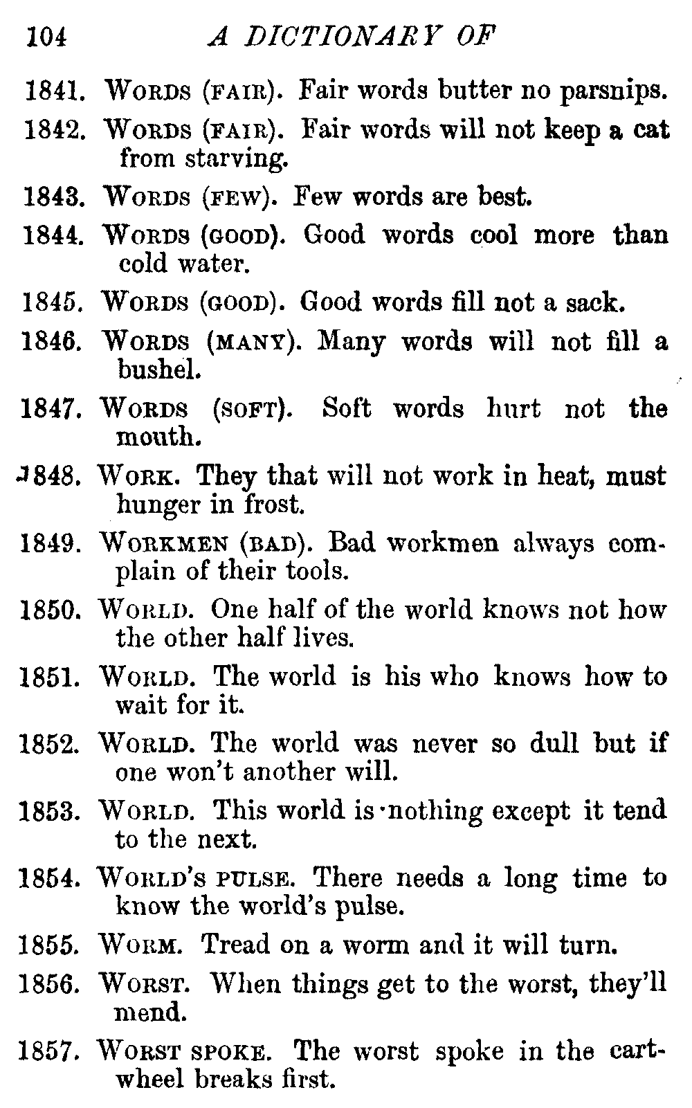 Other modern collections profess to give an "Alphabetical Index," but such an index is of little use when we find that it is framed on the rule that because a proverb begins with the article A, it should therefore be indexed under that letter. As, "A bald head is soon shaven." In another similar Index we find the proverb, "'Tis the second blow makes the fray," inserted under the letter T. In one index of this kind there are no less than twenty-two pages of A's [vii]and almost as many of The's. Indeed the whole index is compiled without the slightest regard to the subject of the proverbs. On this subject Disraeli, in his essay on the "Philosophy of Proverbs," says "The arrangement of proverbs has baffled the ingenuity of every one of their collectors. Ray, after long premeditation, has chosen a system with the appearance of an alphabetical order, but it turns out that his system is no system, and his alphabet is no alphabet. After ten years' labour the good man could only arrange his proverbs by commonplaces." In this little Dictionary, as we have already stated, the proverbs are arranged in alphabetical order, according to the leading words, and are consecutively numbered. But, in order to avoid repetition (as most of the proverbs contain, at least, two leading words), the subject words are used for the Dictionary, and the other principal words will be found in the Index, with a numerical reference to the proverb. The great advantage of this arrangement is, that if only one important word of a proverb be remembered, that word can be turned to in the Dictionary, and, if not found there, will certainly be in the Index. Nearly two thousand of the leading words are thus indexed—enough to make it almost impossible to miss finding what is wanted. This plan has also the effect [viii]of bringing together the proverbs on kindred subjects, which is often a matter of importance to writers, and is, moreover, most amusing to those who only read the book to while away a leisure hour. Ready reference is further facilitated in the Index by the addition of associated words. If one word only had been given, the reader might have had to refer to eleven proverbs before he found the one he required; as, for example, in the case of Dog.