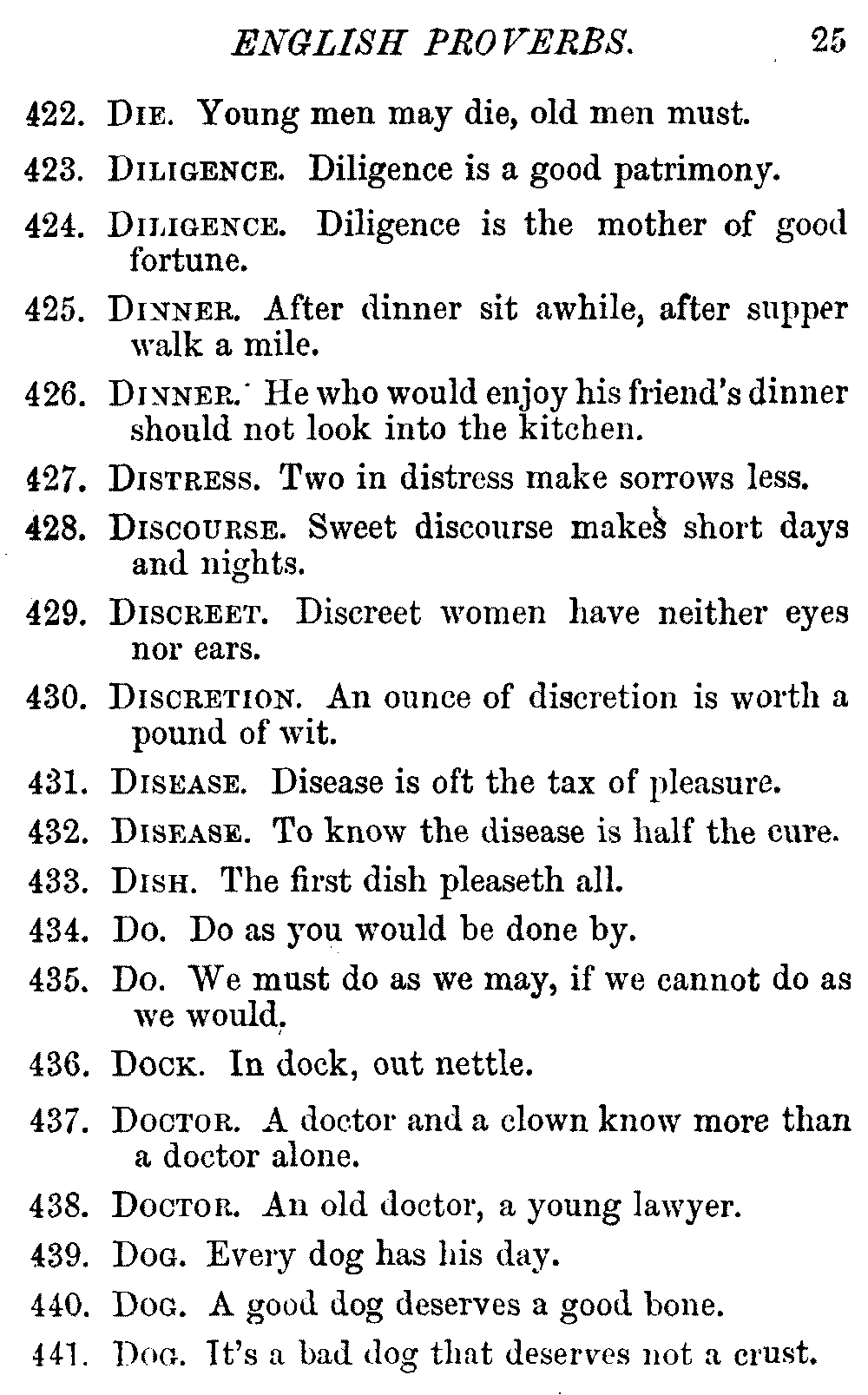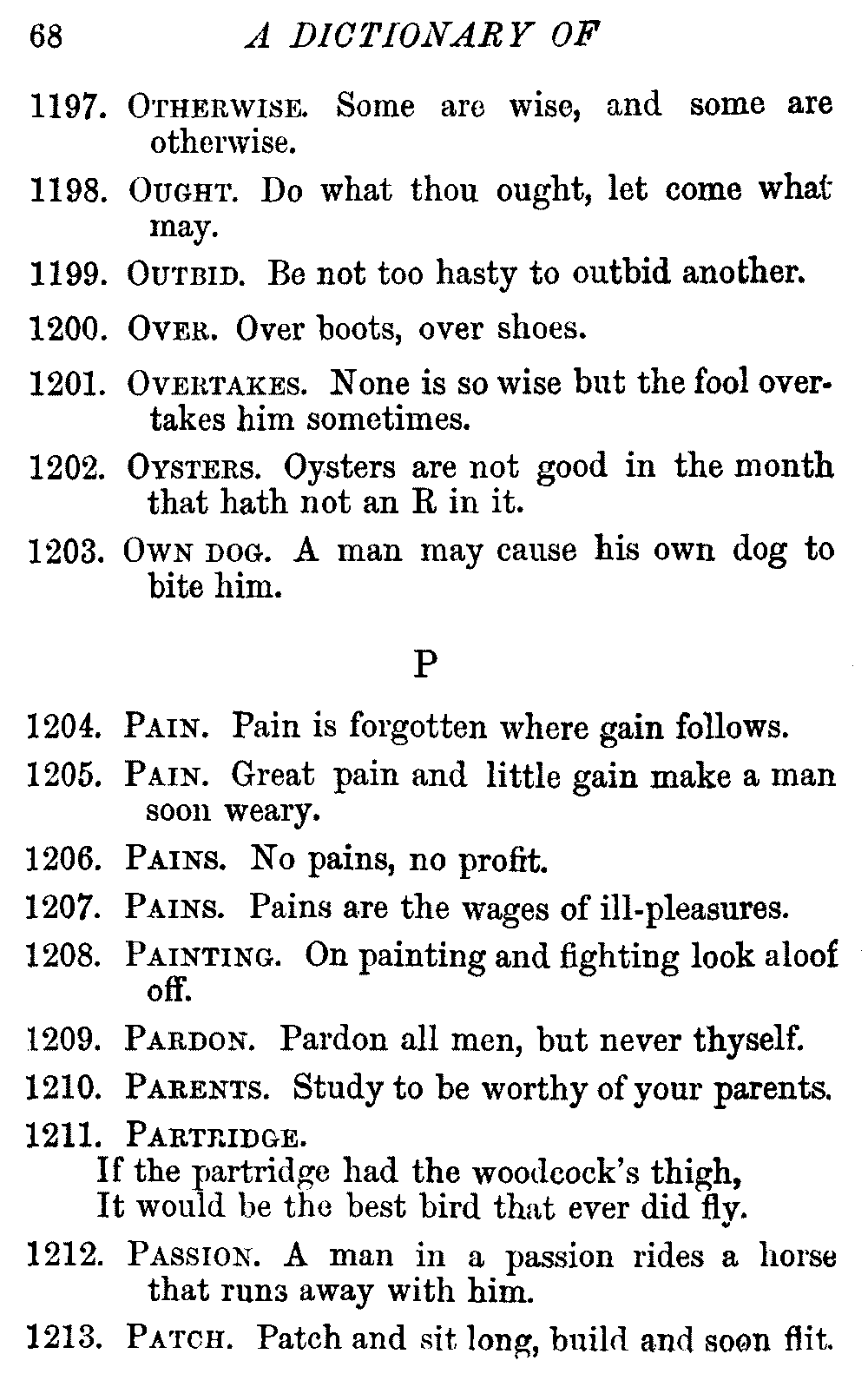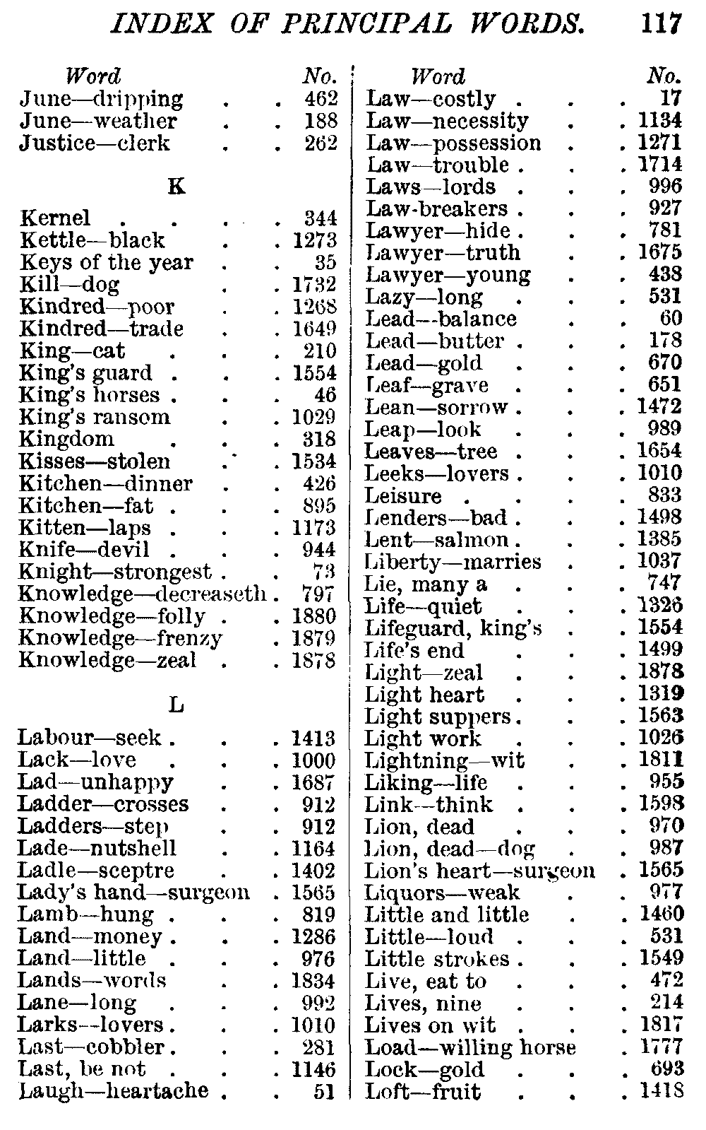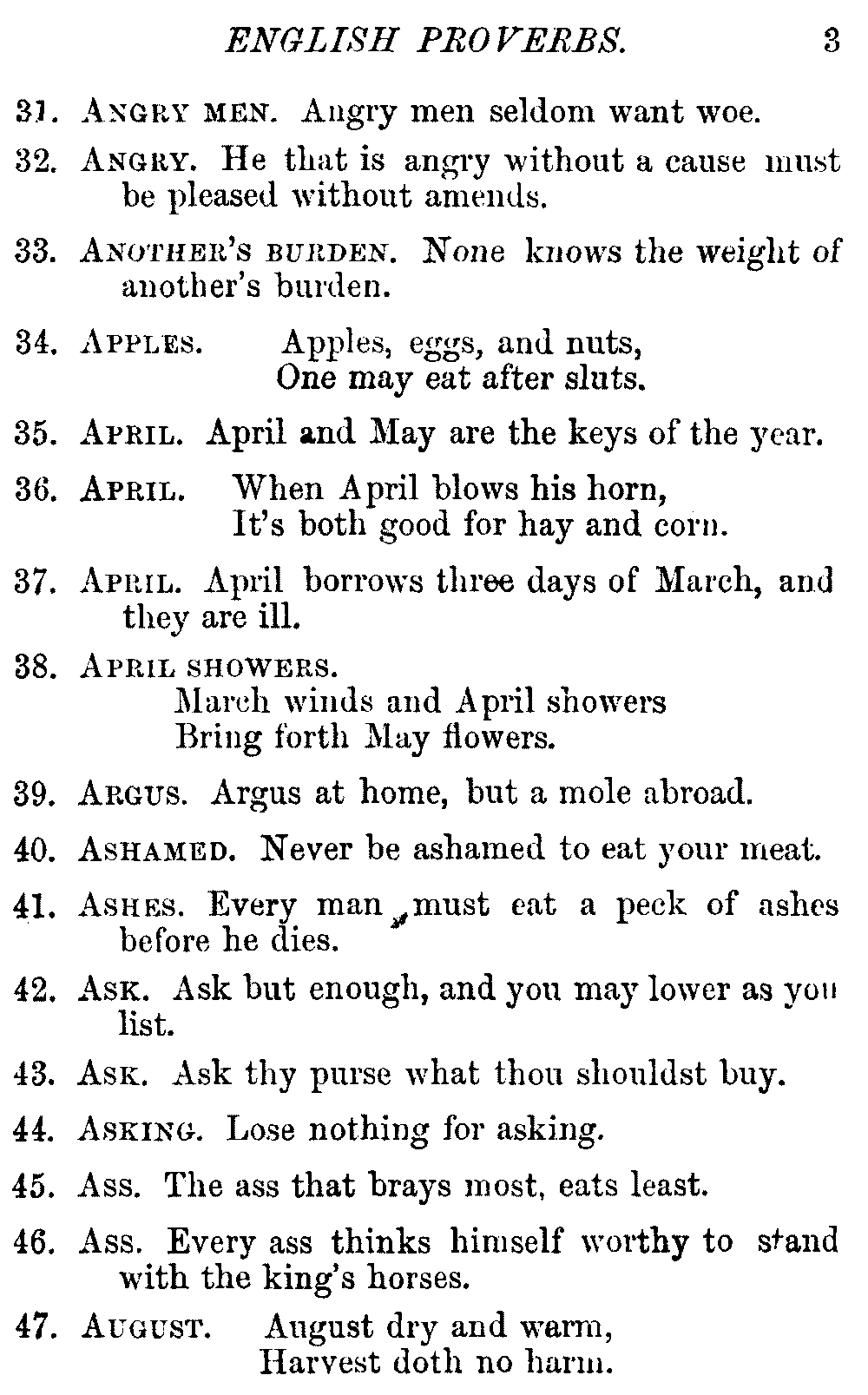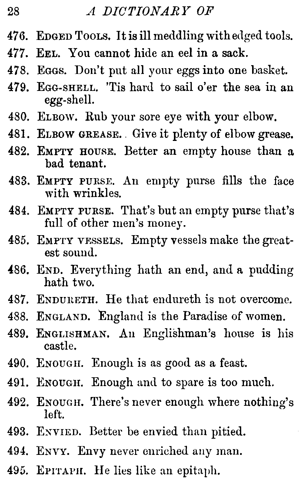 Other modern collections profess to give an "Alphabetical Index," but such an index is of little use when we find that it is framed on the rule that because a proverb begins with the article A, it should therefore be indexed under that letter. As, "A bald head is soon shaven." In another similar Index we find the proverb, "'Tis the second blow makes the fray," inserted under the letter T. In one index of this kind there are no less than twenty-two pages of A's [vii]and almost as many of The's. Indeed the whole index is compiled without the slightest regard to the subject of the proverbs. On this subject Disraeli, in his essay on the "Philosophy of Proverbs," says "The arrangement of proverbs has baffled the ingenuity of every one of their collectors. Ray, after long premeditation, has chosen a system with the appearance of an alphabetical order, but it turns out that his system is no system, and his alphabet is no alphabet. After ten years' labour the good man could only arrange his proverbs by commonplaces." In this little Dictionary, as we have already stated, the proverbs are arranged in alphabetical order, according to the leading words, and are consecutively numbered. But, in order to avoid repetition (as most of the proverbs contain, at least, two leading words), the subject words are used for the Dictionary, and the other principal words will be found in the Index, with a numerical reference to the proverb. The great advantage of this arrangement is, that if only one important word of a proverb be remembered, that word can be turned to in the Dictionary, and, if not found there, will certainly be in the Index. Nearly two thousand of the leading words are thus indexed—enough to make it almost impossible to miss finding what is wanted. This plan has also the effect [viii]of bringing together the proverbs on kindred subjects, which is often a matter of importance to writers, and is, moreover, most amusing to those who only read the book to while away a leisure hour. Ready reference is further facilitated in the Index by the addition of associated words. If one word only had been given, the reader might have had to refer to eleven proverbs before he found the one he required; as, for example, in the case of Dog.
