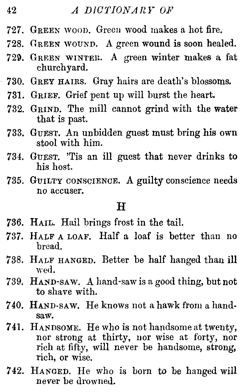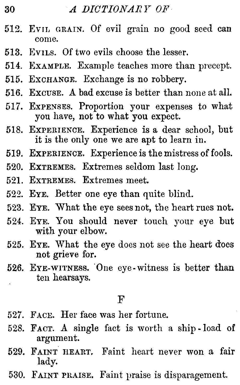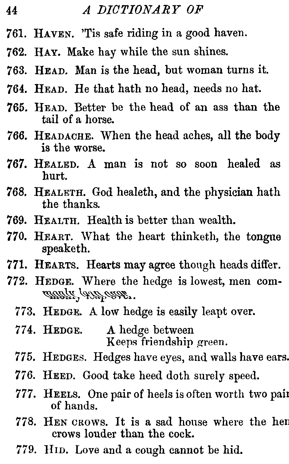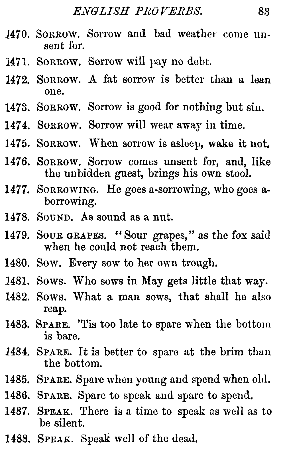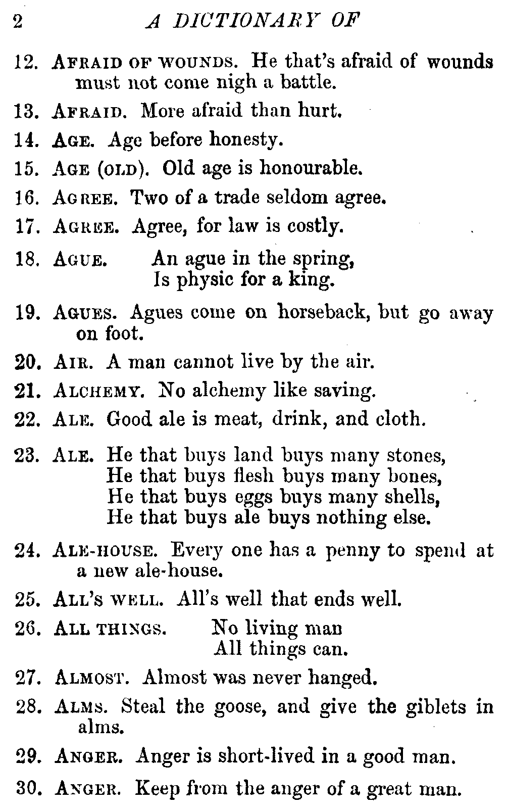Other modern collections profess to give an "Alphabetical Index," but such an index is of little use when we find that it is framed on the rule that because a proverb begins with the article A, it should therefore be indexed under that letter. As, "A bald head is soon shaven." In another similar Index we find the proverb, "'Tis the second blow makes the fray," inserted under the letter T. In one index of this kind there are no less than twenty-two pages of A's [vii]and almost as many of The's. Indeed the whole index is compiled without the slightest regard to the subject of the proverbs. On this subject Disraeli, in his essay on the "Philosophy of Proverbs," says "The arrangement of proverbs has baffled the ingenuity of every one of their collectors. Ray, after long premeditation, has chosen a system with the appearance of an alphabetical order, but it turns out that his system is no system, and his alphabet is no alphabet. After ten years' labour the good man could only arrange his proverbs by commonplaces." In this little Dictionary, as we have already stated, the proverbs are arranged in alphabetical order, according to the leading words, and are consecutively numbered. But, in order to avoid repetition (as most of the proverbs contain, at least, two leading words), the subject words are used for the Dictionary, and the other principal words will be found in the Index, with a numerical reference to the proverb. The great advantage of this arrangement is, that if only one important word of a proverb be remembered, that word can be turned to in the Dictionary, and, if not found there, will certainly be in the Index. Nearly two thousand of the leading words are thus indexed—enough to make it almost impossible to miss finding what is wanted. This plan has also the effect [viii]of bringing together the proverbs on kindred subjects, which is often a matter of importance to writers, and is, moreover, most amusing to those who only read the book to while away a leisure hour. Ready reference is further facilitated in the Index by the addition of associated words. If one word only had been given, the reader might have had to refer to eleven proverbs before he found the one he required; as, for example, in the case of Dog.