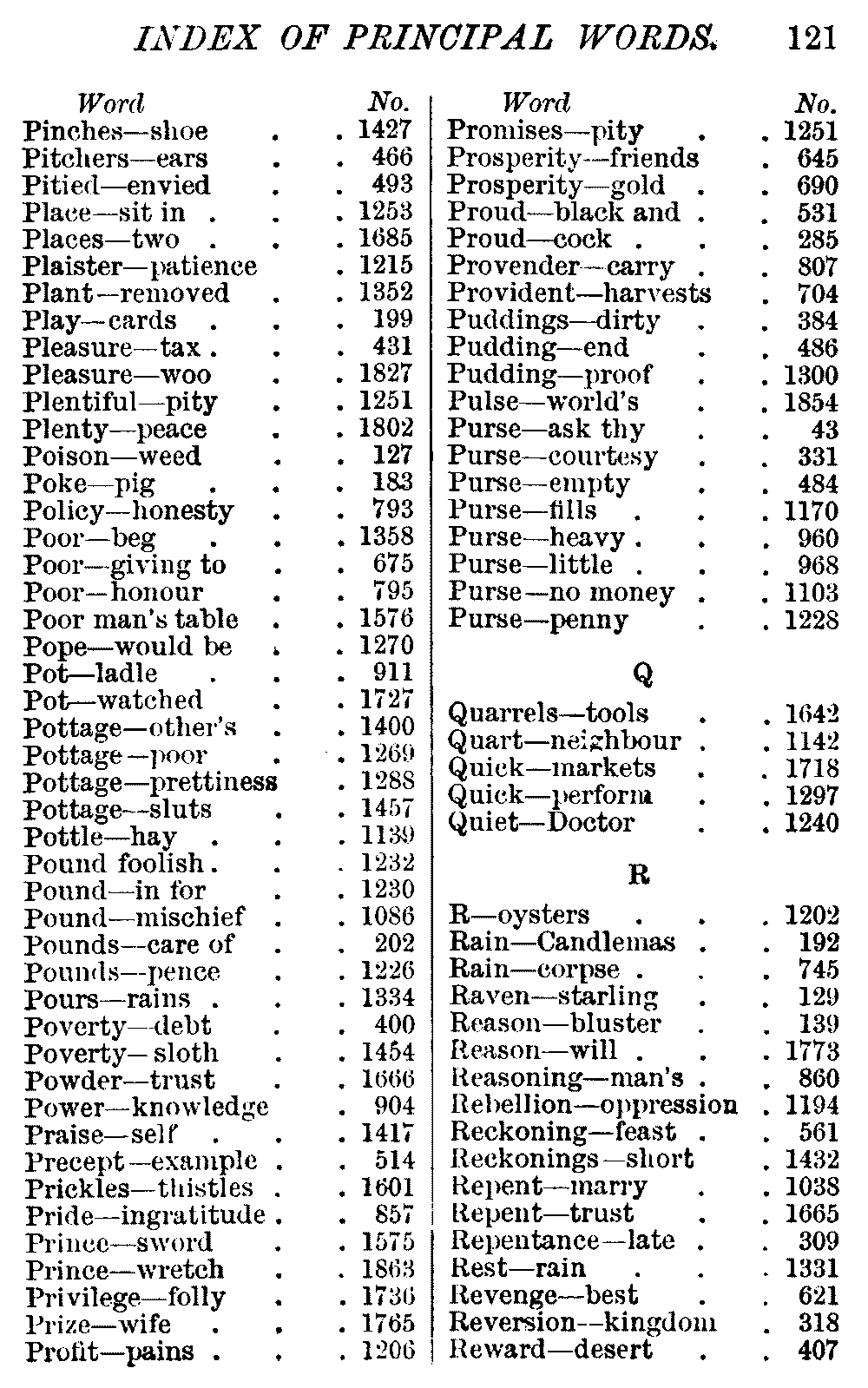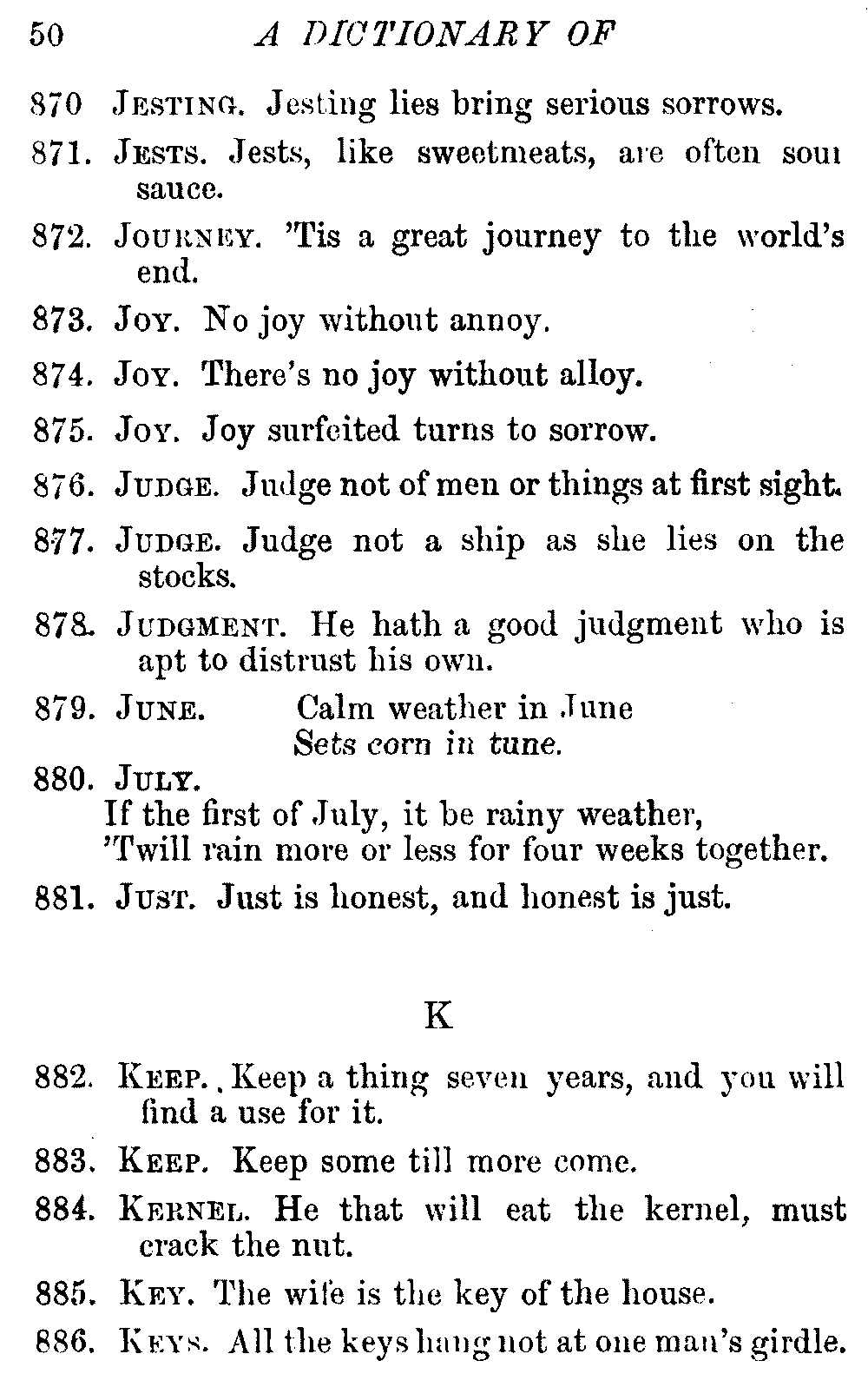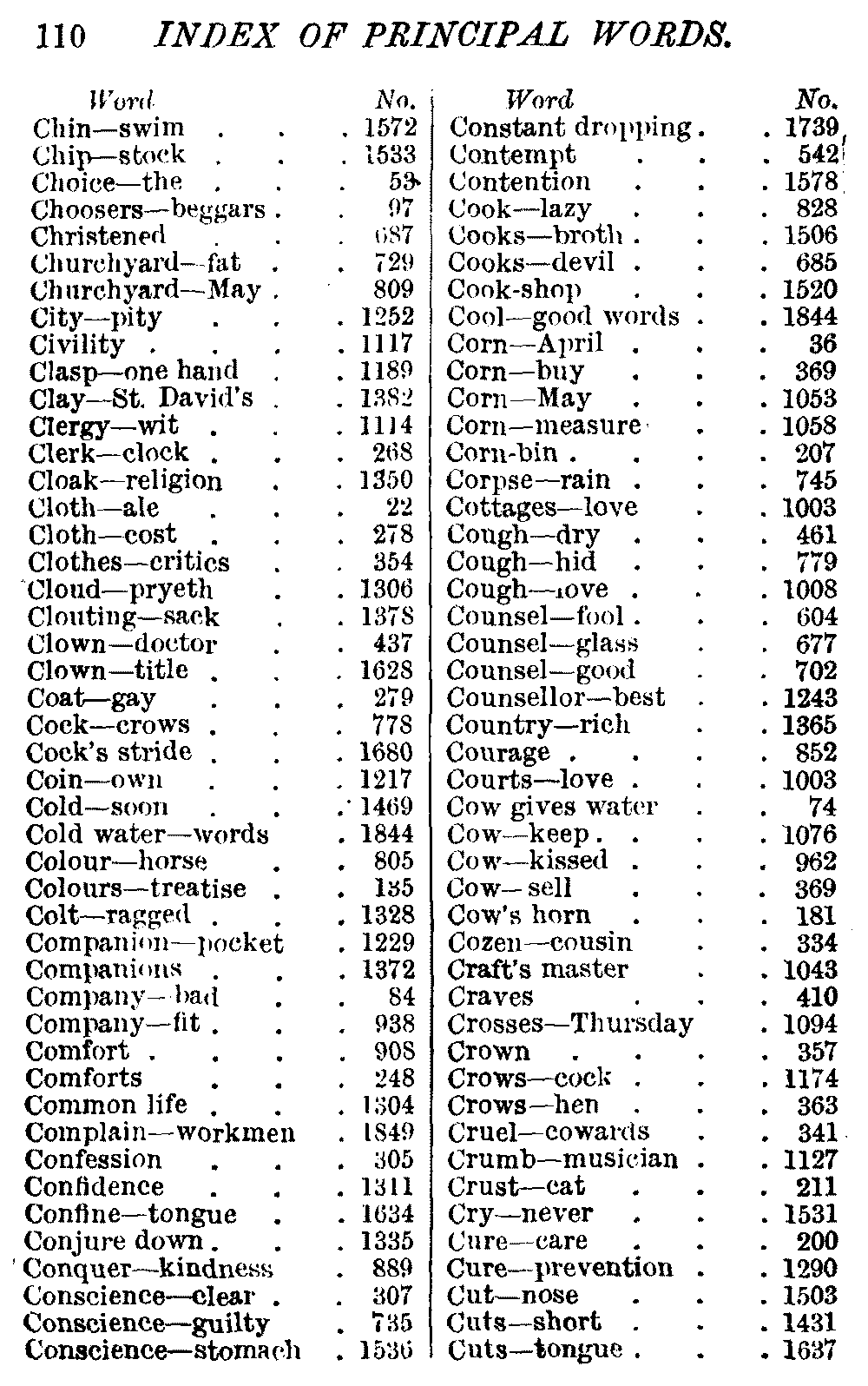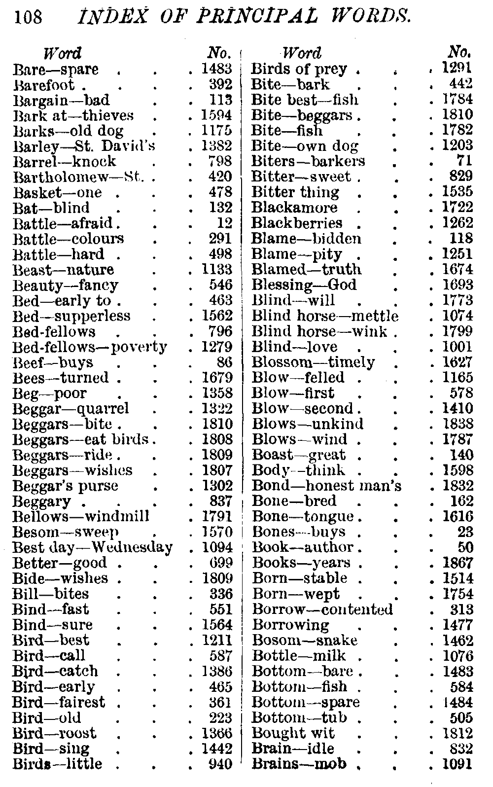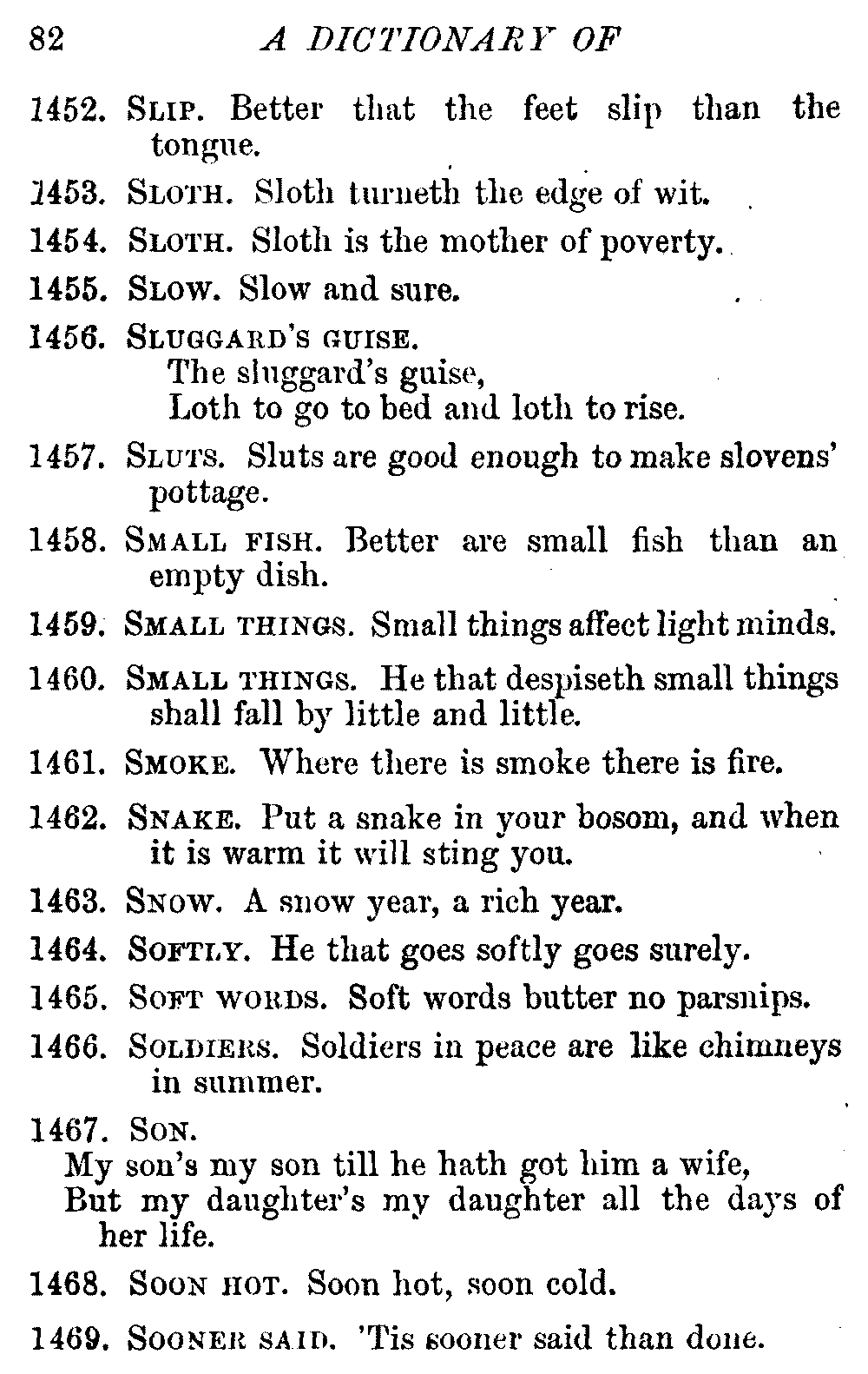 Other modern collections profess to give an "Alphabetical Index," but such an index is of little use when we find that it is framed on the rule that because a proverb begins with the article A, it should therefore be indexed under that letter. As, "A bald head is soon shaven." In another similar Index we find the proverb, "'Tis the second blow makes the fray," inserted under the letter T. In one index of this kind there are no less than twenty-two pages of A's [vii]and almost as many of The's. Indeed the whole index is compiled without the slightest regard to the subject of the proverbs. On this subject Disraeli, in his essay on the "Philosophy of Proverbs," says "The arrangement of proverbs has baffled the ingenuity of every one of their collectors. Ray, after long premeditation, has chosen a system with the appearance of an alphabetical order, but it turns out that his system is no system, and his alphabet is no alphabet. After ten years' labour the good man could only arrange his proverbs by commonplaces." In this little Dictionary, as we have already stated, the proverbs are arranged in alphabetical order, according to the leading words, and are consecutively numbered. But, in order to avoid repetition (as most of the proverbs contain, at least, two leading words), the subject words are used for the Dictionary, and the other principal words will be found in the Index, with a numerical reference to the proverb. The great advantage of this arrangement is, that if only one important word of a proverb be remembered, that word can be turned to in the Dictionary, and, if not found there, will certainly be in the Index. Nearly two thousand of the leading words are thus indexed—enough to make it almost impossible to miss finding what is wanted. This plan has also the effect [viii]of bringing together the proverbs on kindred subjects, which is often a matter of importance to writers, and is, moreover, most amusing to those who only read the book to while away a leisure hour. Ready reference is further facilitated in the Index by the addition of associated words. If one word only had been given, the reader might have had to refer to eleven proverbs before he found the one he required; as, for example, in the case of Dog.