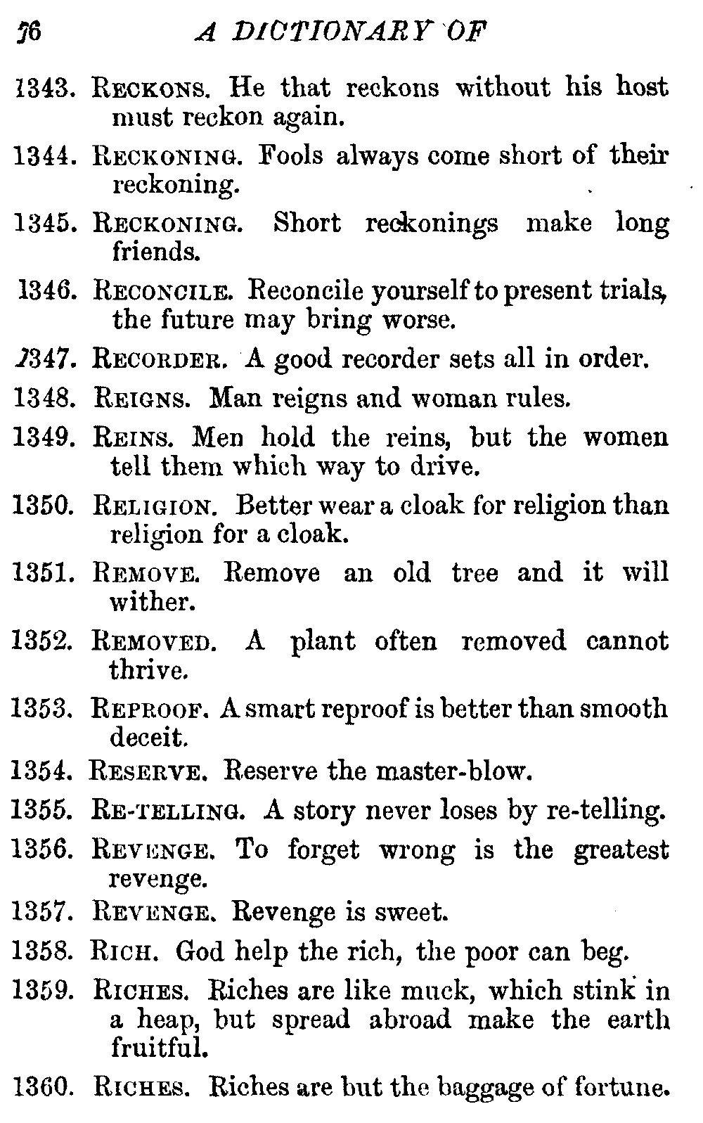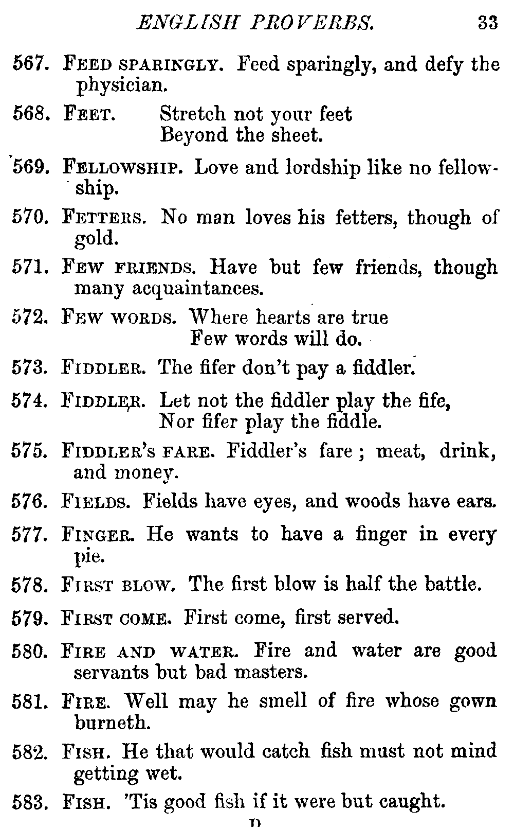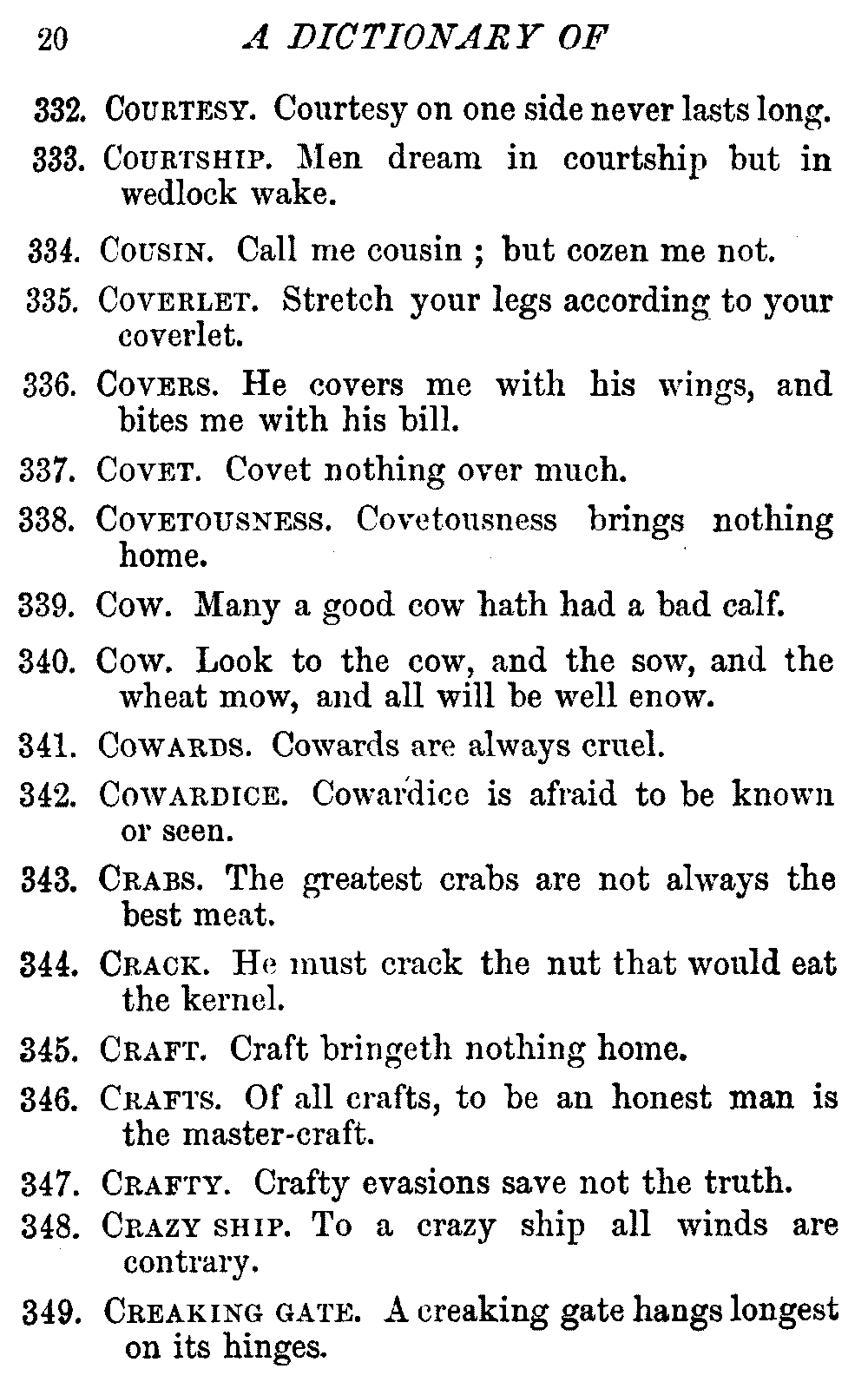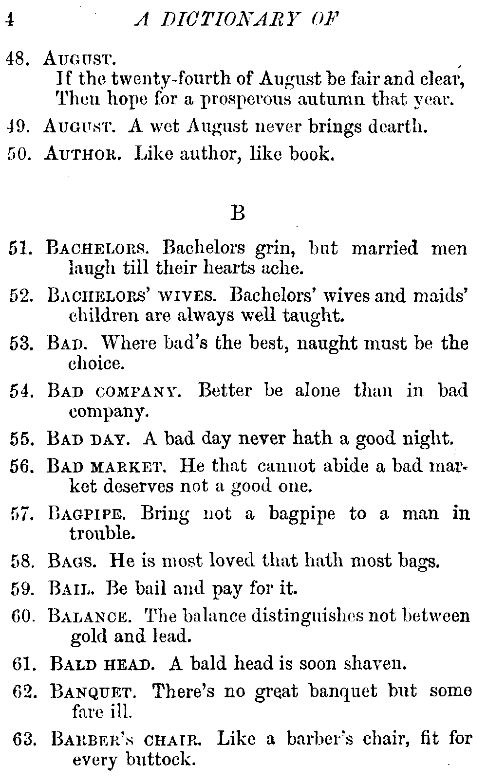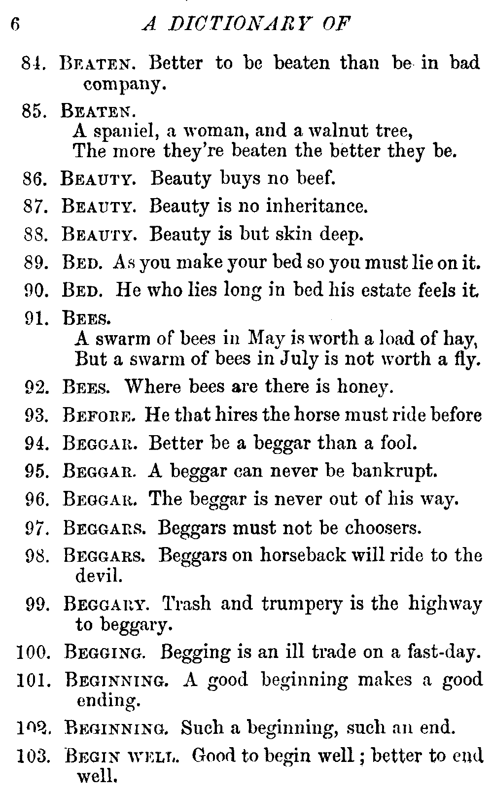 Other modern collections profess to give an "Alphabetical Index," but such an index is of little use when we find that it is framed on the rule that because a proverb begins with the article A, it should therefore be indexed under that letter. As, "A bald head is soon shaven." In another similar Index we find the proverb, "'Tis the second blow makes the fray," inserted under the letter T. In one index of this kind there are no less than twenty-two pages of A's [vii]and almost as many of The's. Indeed the whole index is compiled without the slightest regard to the subject of the proverbs. On this subject Disraeli, in his essay on the "Philosophy of Proverbs," says "The arrangement of proverbs has baffled the ingenuity of every one of their collectors. Ray, after long premeditation, has chosen a system with the appearance of an alphabetical order, but it turns out that his system is no system, and his alphabet is no alphabet. After ten years' labour the good man could only arrange his proverbs by commonplaces." In this little Dictionary, as we have already stated, the proverbs are arranged in alphabetical order, according to the leading words, and are consecutively numbered. But, in order to avoid repetition (as most of the proverbs contain, at least, two leading words), the subject words are used for the Dictionary, and the other principal words will be found in the Index, with a numerical reference to the proverb. The great advantage of this arrangement is, that if only one important word of a proverb be remembered, that word can be turned to in the Dictionary, and, if not found there, will certainly be in the Index. Nearly two thousand of the leading words are thus indexed—enough to make it almost impossible to miss finding what is wanted. This plan has also the effect [viii]of bringing together the proverbs on kindred subjects, which is often a matter of importance to writers, and is, moreover, most amusing to those who only read the book to while away a leisure hour. Ready reference is further facilitated in the Index by the addition of associated words. If one word only had been given, the reader might have had to refer to eleven proverbs before he found the one he required; as, for example, in the case of Dog.