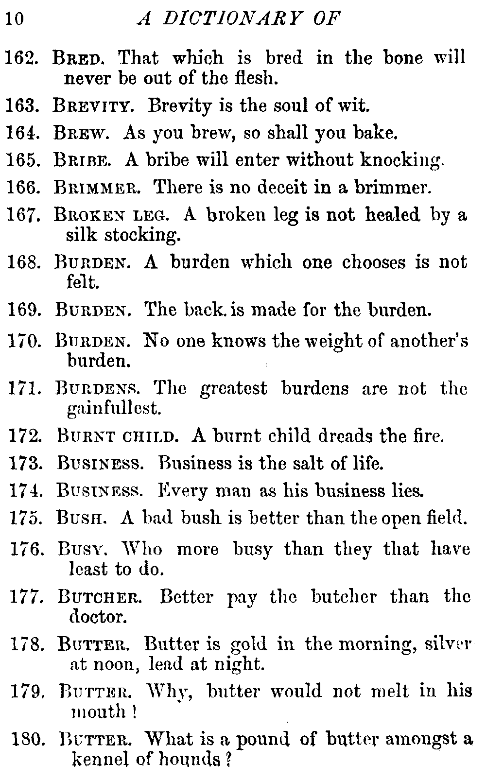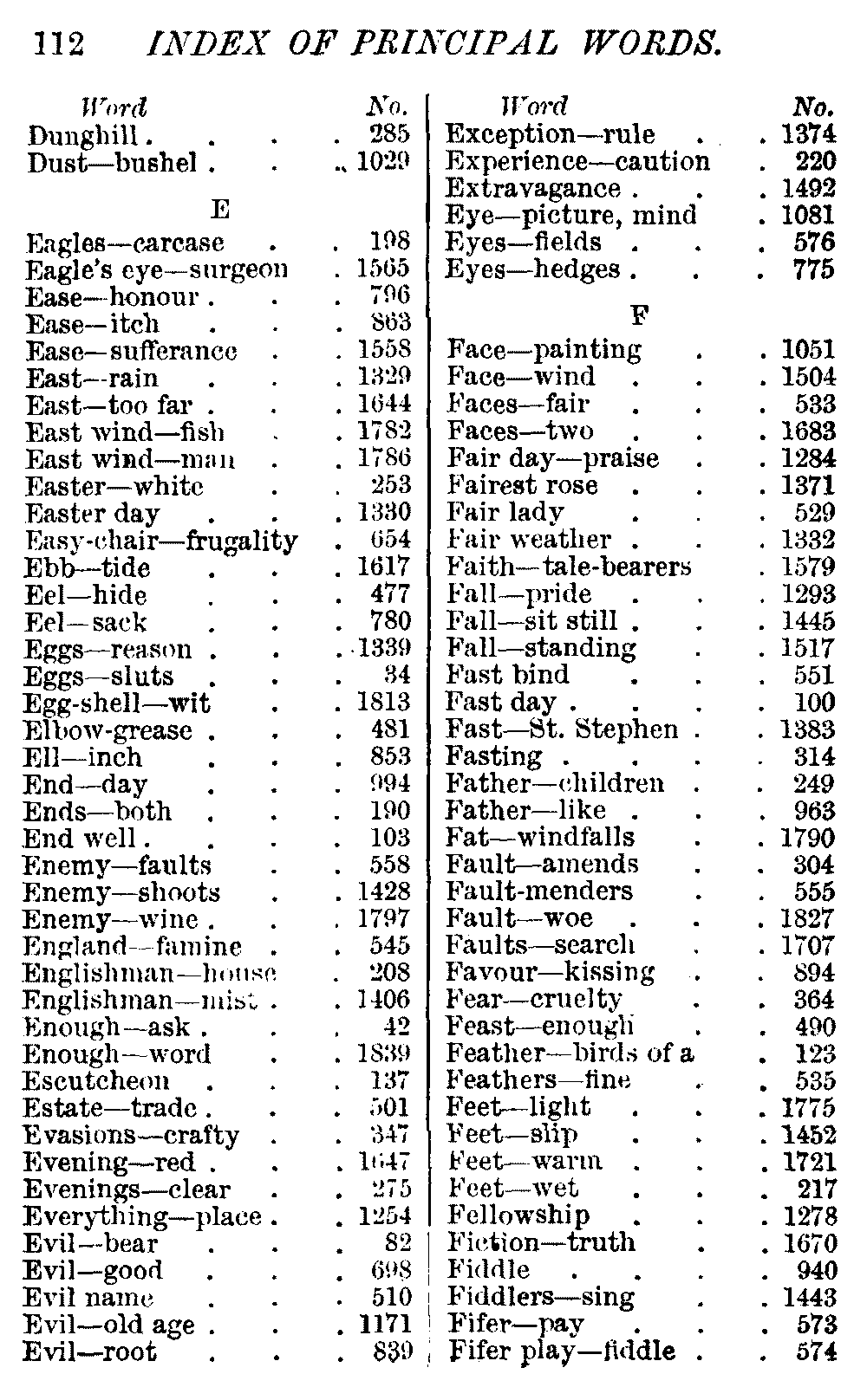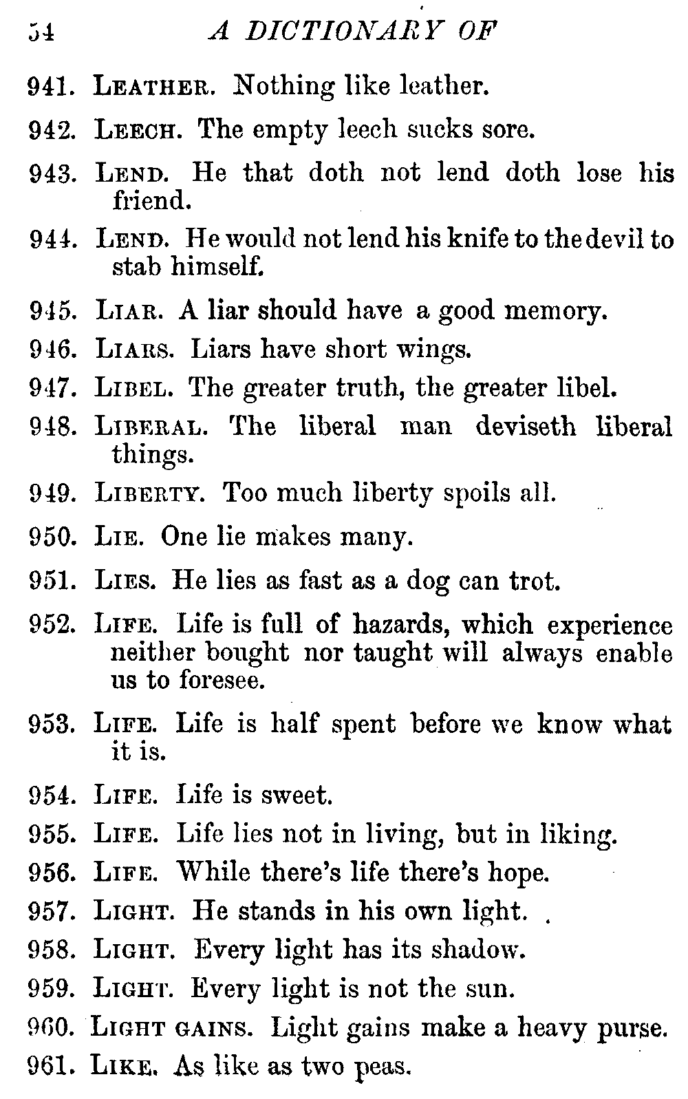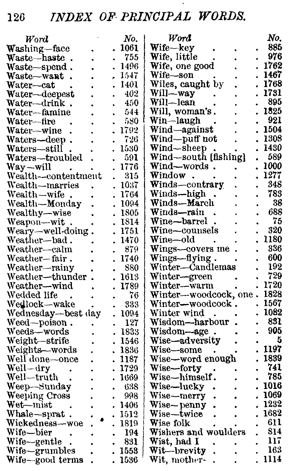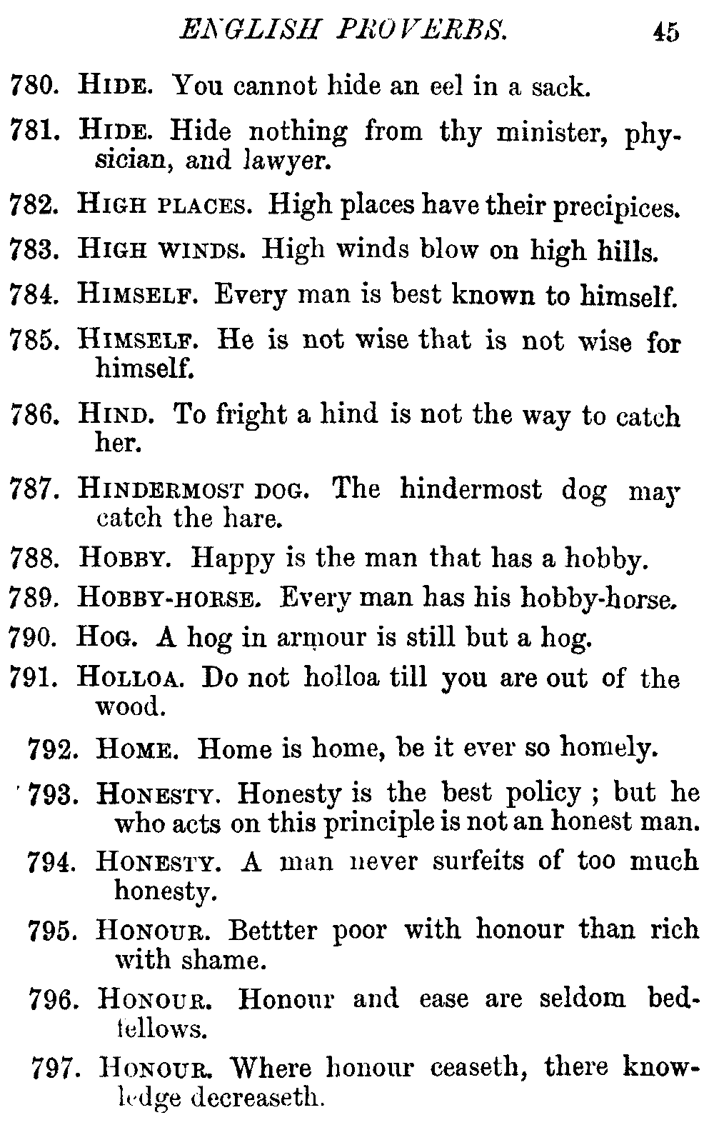 Other modern collections profess to give an "Alphabetical Index," but such an index is of little use when we find that it is framed on the rule that because a proverb begins with the article A, it should therefore be indexed under that letter. As, "A bald head is soon shaven." In another similar Index we find the proverb, "'Tis the second blow makes the fray," inserted under the letter T. In one index of this kind there are no less than twenty-two pages of A's [vii]and almost as many of The's. Indeed the whole index is compiled without the slightest regard to the subject of the proverbs. On this subject Disraeli, in his essay on the "Philosophy of Proverbs," says "The arrangement of proverbs has baffled the ingenuity of every one of their collectors. Ray, after long premeditation, has chosen a system with the appearance of an alphabetical order, but it turns out that his system is no system, and his alphabet is no alphabet. After ten years' labour the good man could only arrange his proverbs by commonplaces." In this little Dictionary, as we have already stated, the proverbs are arranged in alphabetical order, according to the leading words, and are consecutively numbered. But, in order to avoid repetition (as most of the proverbs contain, at least, two leading words), the subject words are used for the Dictionary, and the other principal words will be found in the Index, with a numerical reference to the proverb. The great advantage of this arrangement is, that if only one important word of a proverb be remembered, that word can be turned to in the Dictionary, and, if not found there, will certainly be in the Index. Nearly two thousand of the leading words are thus indexed—enough to make it almost impossible to miss finding what is wanted. This plan has also the effect [viii]of bringing together the proverbs on kindred subjects, which is often a matter of importance to writers, and is, moreover, most amusing to those who only read the book to while away a leisure hour. Ready reference is further facilitated in the Index by the addition of associated words. If one word only had been given, the reader might have had to refer to eleven proverbs before he found the one he required; as, for example, in the case of Dog.
