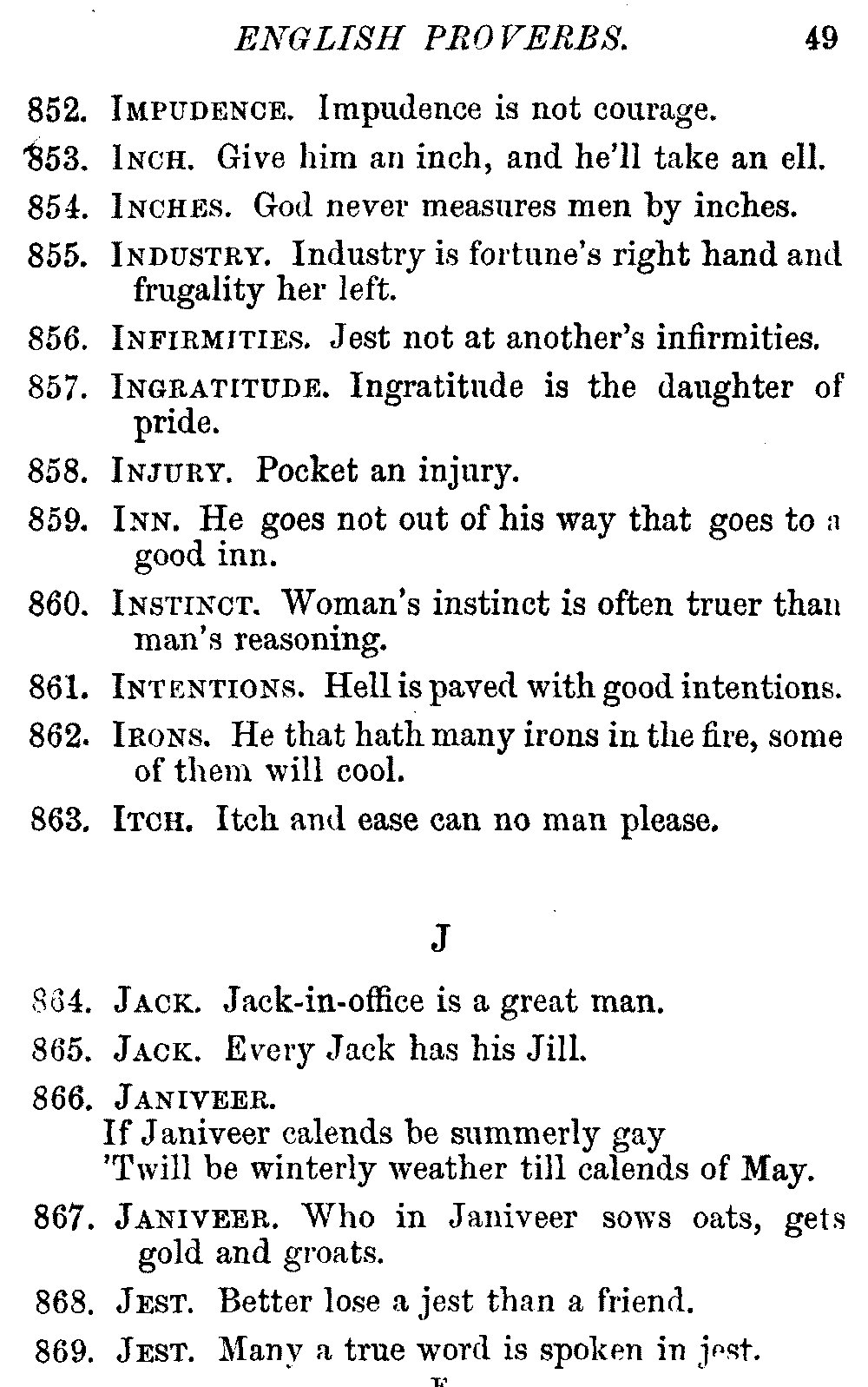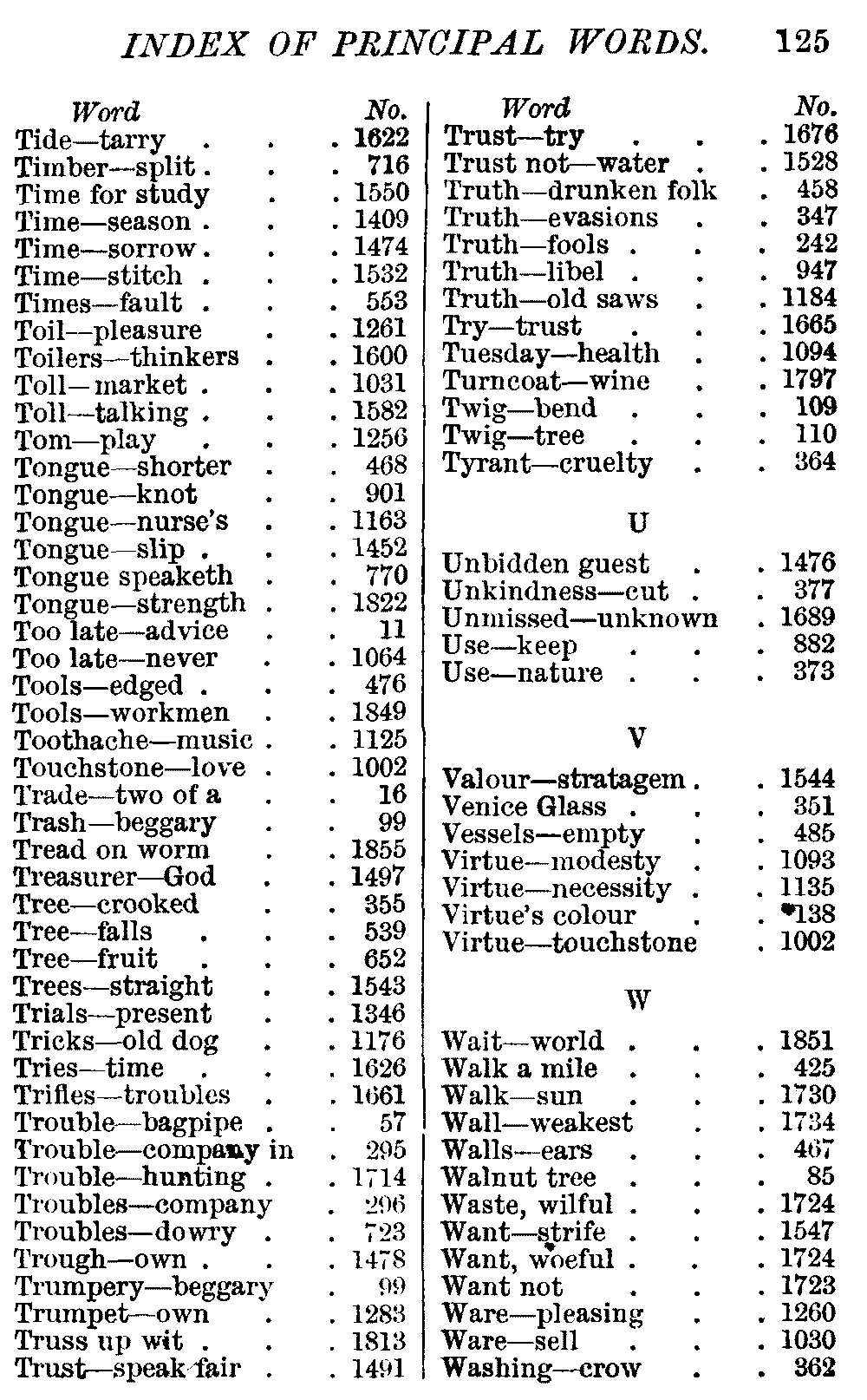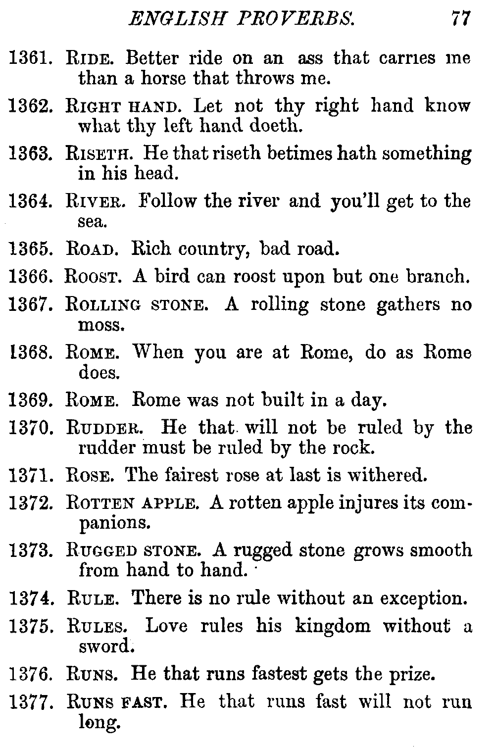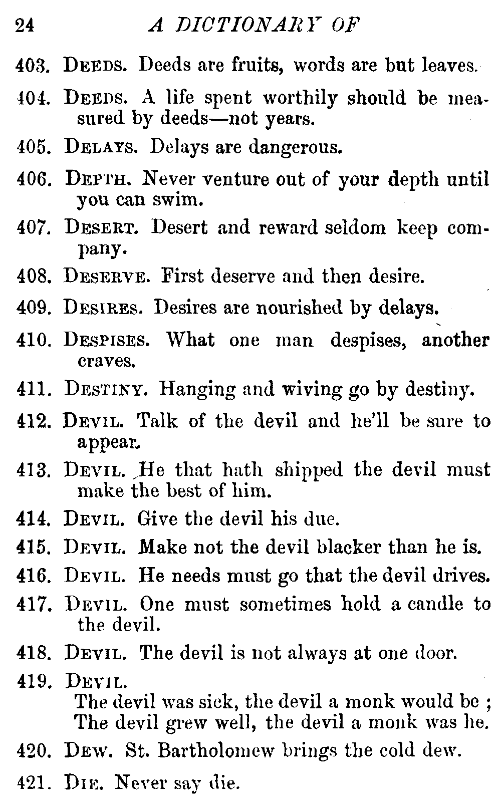 Other modern collections profess to give an "Alphabetical Index," but such an index is of little use when we find that it is framed on the rule that because a proverb begins with the article A, it should therefore be indexed under that letter. As, "A bald head is soon shaven." In another similar Index we find the proverb, "'Tis the second blow makes the fray," inserted under the letter T. In one index of this kind there are no less than twenty-two pages of A's [vii]and almost as many of The's. Indeed the whole index is compiled without the slightest regard to the subject of the proverbs. On this subject Disraeli, in his essay on the "Philosophy of Proverbs," says "The arrangement of proverbs has baffled the ingenuity of every one of their collectors. Ray, after long premeditation, has chosen a system with the appearance of an alphabetical order, but it turns out that his system is no system, and his alphabet is no alphabet. After ten years' labour the good man could only arrange his proverbs by commonplaces." In this little Dictionary, as we have already stated, the proverbs are arranged in alphabetical order, according to the leading words, and are consecutively numbered. But, in order to avoid repetition (as most of the proverbs contain, at least, two leading words), the subject words are used for the Dictionary, and the other principal words will be found in the Index, with a numerical reference to the proverb. The great advantage of this arrangement is, that if only one important word of a proverb be remembered, that word can be turned to in the Dictionary, and, if not found there, will certainly be in the Index. Nearly two thousand of the leading words are thus indexed—enough to make it almost impossible to miss finding what is wanted. This plan has also the effect [viii]of bringing together the proverbs on kindred subjects, which is often a matter of importance to writers, and is, moreover, most amusing to those who only read the book to while away a leisure hour. Ready reference is further facilitated in the Index by the addition of associated words. If one word only had been given, the reader might have had to refer to eleven proverbs before he found the one he required; as, for example, in the case of Dog.