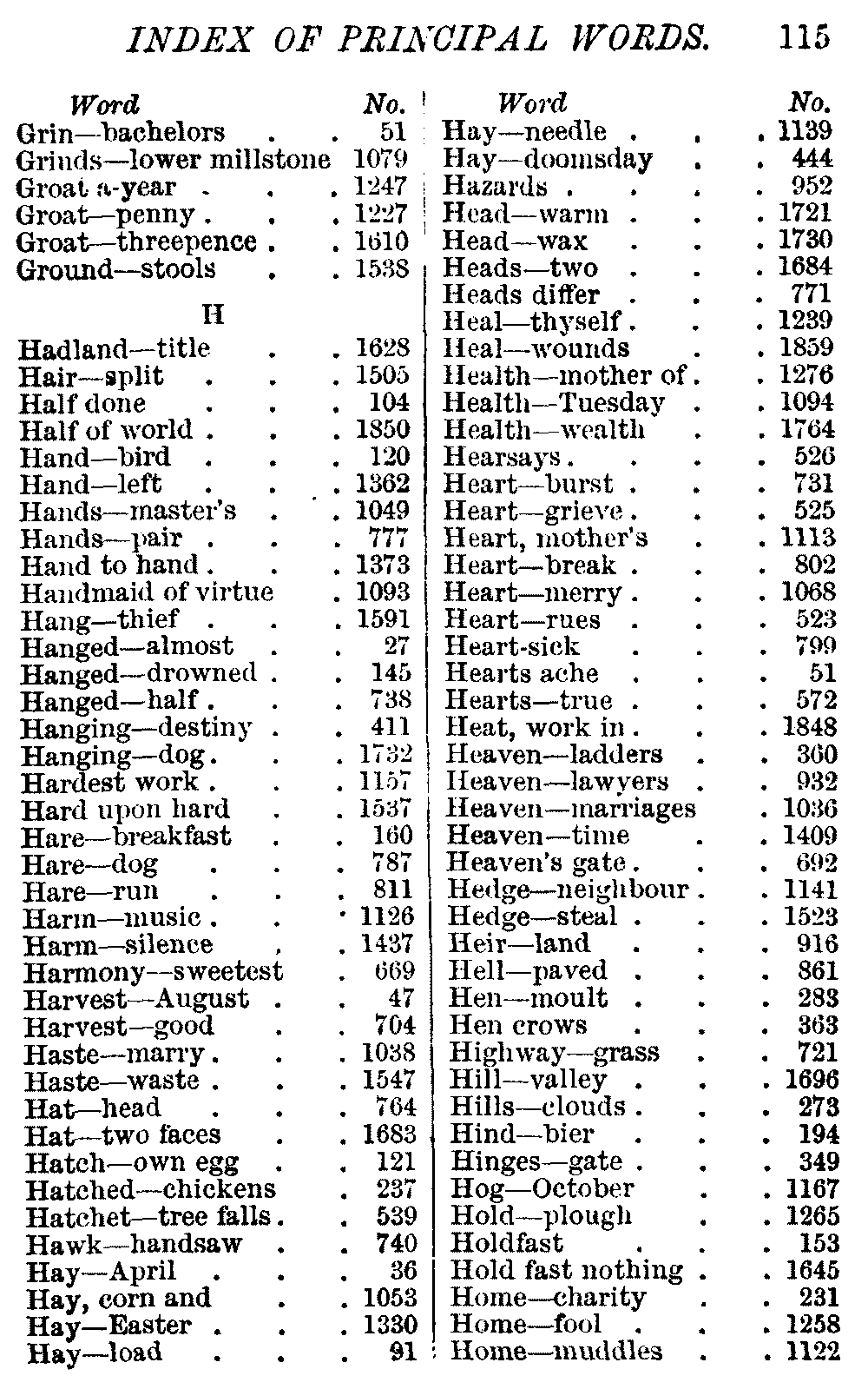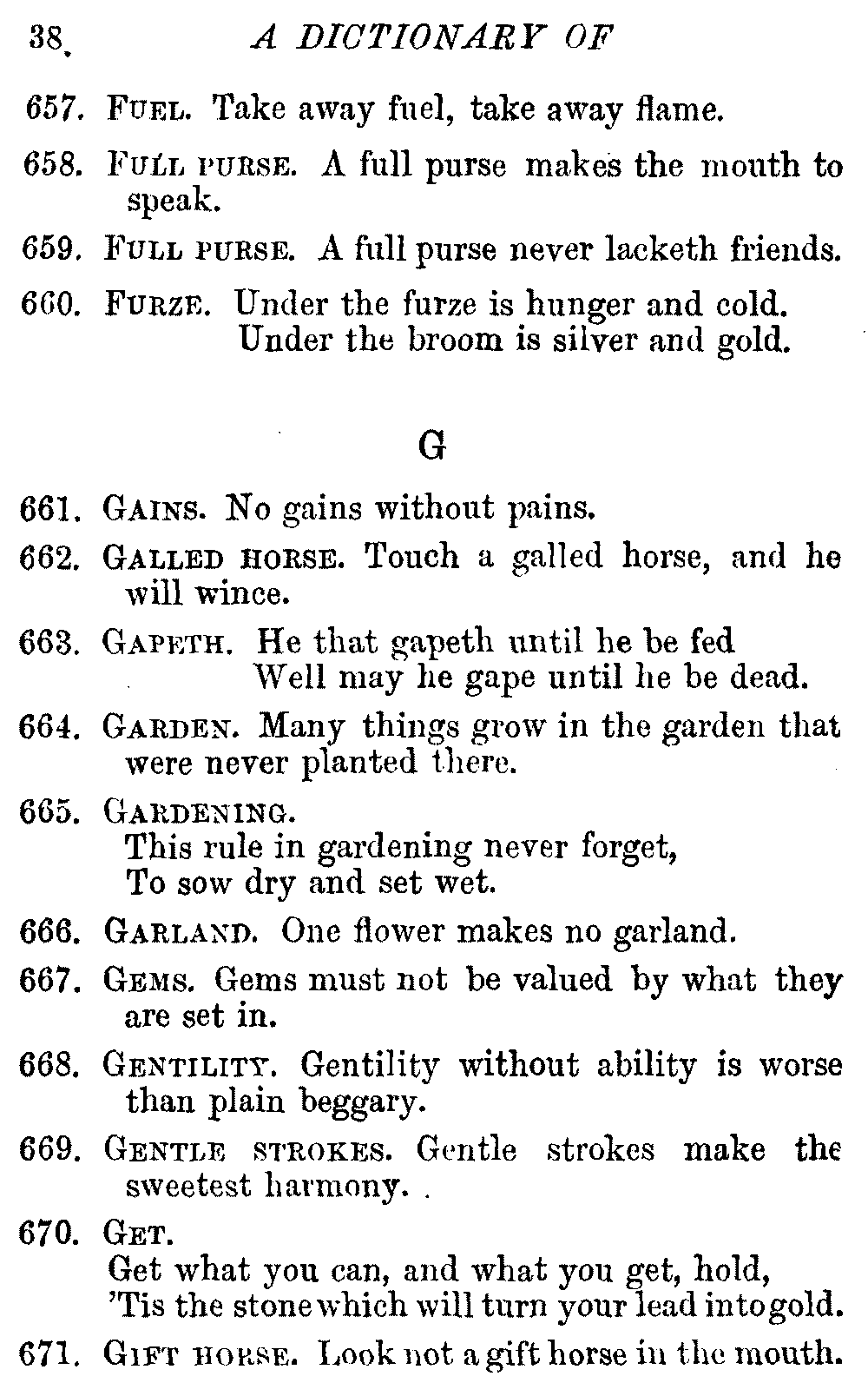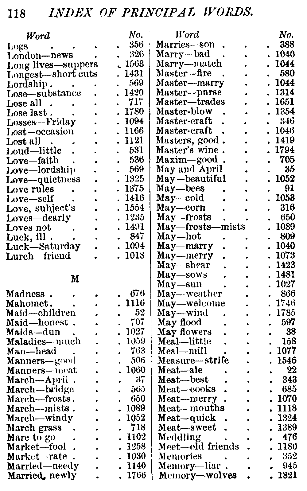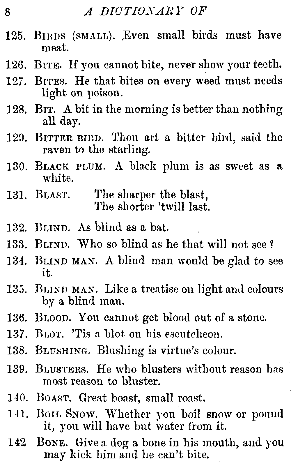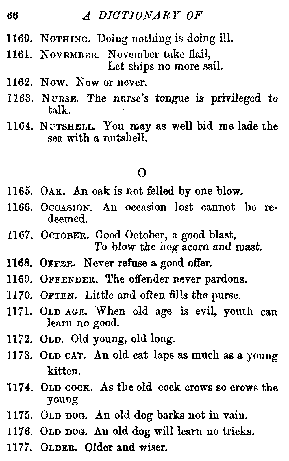 Other modern collections profess to give an "Alphabetical Index," but such an index is of little use when we find that it is framed on the rule that because a proverb begins with the article A, it should therefore be indexed under that letter. As, "A bald head is soon shaven." In another similar Index we find the proverb, "'Tis the second blow makes the fray," inserted under the letter T. In one index of this kind there are no less than twenty-two pages of A's [vii]and almost as many of The's. Indeed the whole index is compiled without the slightest regard to the subject of the proverbs. On this subject Disraeli, in his essay on the "Philosophy of Proverbs," says "The arrangement of proverbs has baffled the ingenuity of every one of their collectors. Ray, after long premeditation, has chosen a system with the appearance of an alphabetical order, but it turns out that his system is no system, and his alphabet is no alphabet. After ten years' labour the good man could only arrange his proverbs by commonplaces." In this little Dictionary, as we have already stated, the proverbs are arranged in alphabetical order, according to the leading words, and are consecutively numbered. But, in order to avoid repetition (as most of the proverbs contain, at least, two leading words), the subject words are used for the Dictionary, and the other principal words will be found in the Index, with a numerical reference to the proverb. The great advantage of this arrangement is, that if only one important word of a proverb be remembered, that word can be turned to in the Dictionary, and, if not found there, will certainly be in the Index. Nearly two thousand of the leading words are thus indexed—enough to make it almost impossible to miss finding what is wanted. This plan has also the effect [viii]of bringing together the proverbs on kindred subjects, which is often a matter of importance to writers, and is, moreover, most amusing to those who only read the book to while away a leisure hour. Ready reference is further facilitated in the Index by the addition of associated words. If one word only had been given, the reader might have had to refer to eleven proverbs before he found the one he required; as, for example, in the case of Dog.