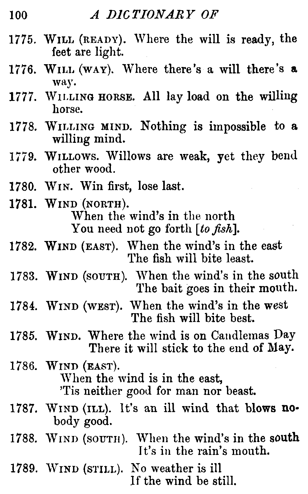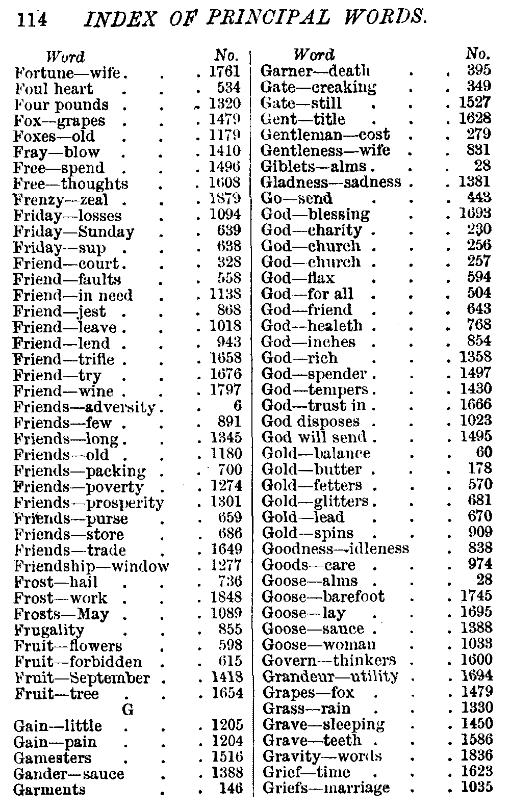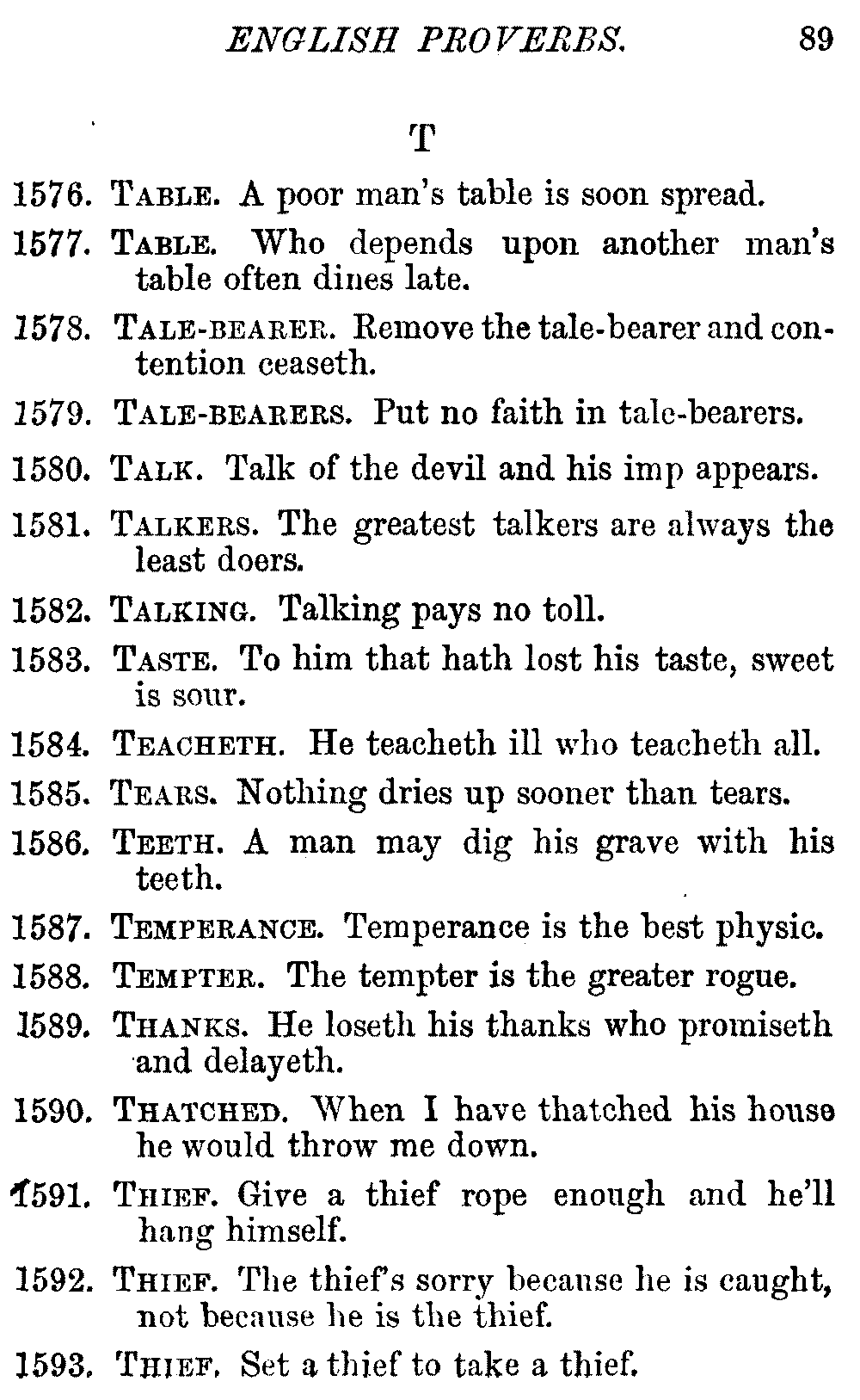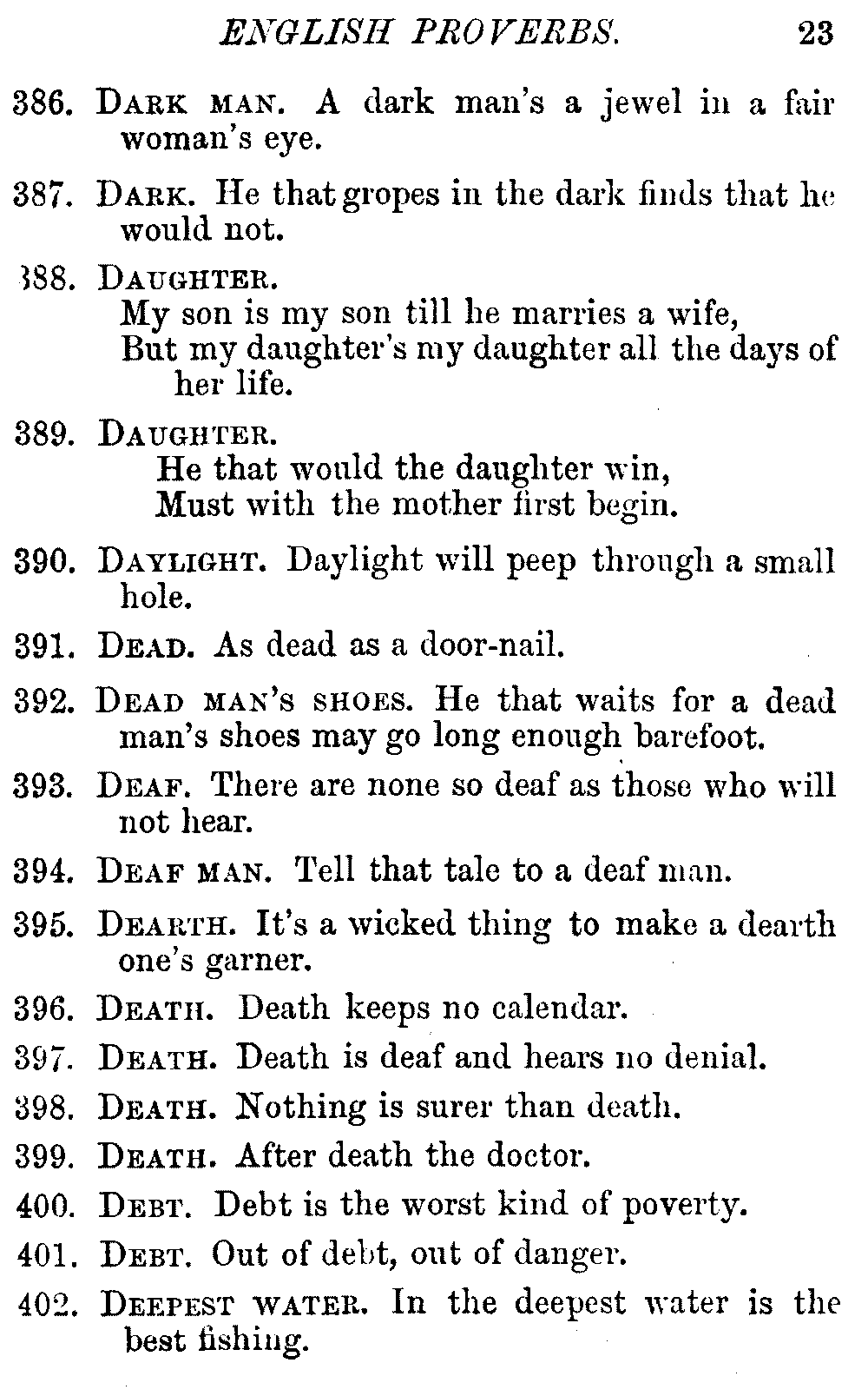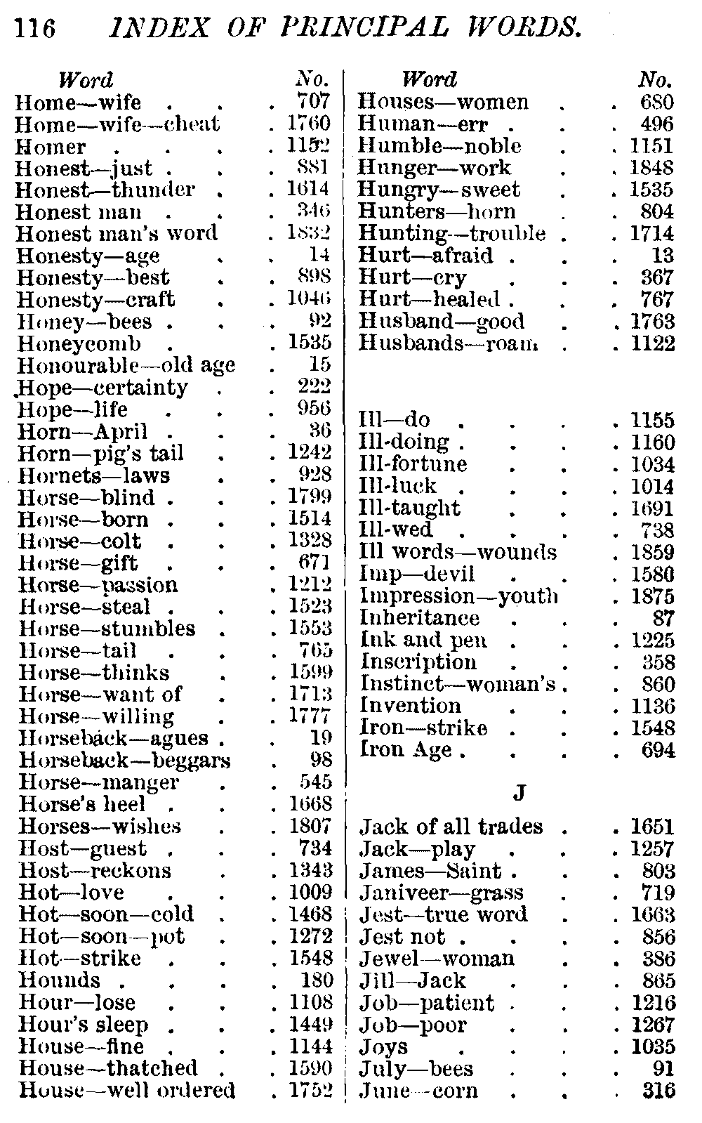 Other modern collections profess to give an "Alphabetical Index," but such an index is of little use when we find that it is framed on the rule that because a proverb begins with the article A, it should therefore be indexed under that letter. As, "A bald head is soon shaven." In another similar Index we find the proverb, "'Tis the second blow makes the fray," inserted under the letter T. In one index of this kind there are no less than twenty-two pages of A's [vii]and almost as many of The's. Indeed the whole index is compiled without the slightest regard to the subject of the proverbs. On this subject Disraeli, in his essay on the "Philosophy of Proverbs," says "The arrangement of proverbs has baffled the ingenuity of every one of their collectors. Ray, after long premeditation, has chosen a system with the appearance of an alphabetical order, but it turns out that his system is no system, and his alphabet is no alphabet. After ten years' labour the good man could only arrange his proverbs by commonplaces." In this little Dictionary, as we have already stated, the proverbs are arranged in alphabetical order, according to the leading words, and are consecutively numbered. But, in order to avoid repetition (as most of the proverbs contain, at least, two leading words), the subject words are used for the Dictionary, and the other principal words will be found in the Index, with a numerical reference to the proverb. The great advantage of this arrangement is, that if only one important word of a proverb be remembered, that word can be turned to in the Dictionary, and, if not found there, will certainly be in the Index. Nearly two thousand of the leading words are thus indexed—enough to make it almost impossible to miss finding what is wanted. This plan has also the effect [viii]of bringing together the proverbs on kindred subjects, which is often a matter of importance to writers, and is, moreover, most amusing to those who only read the book to while away a leisure hour. Ready reference is further facilitated in the Index by the addition of associated words. If one word only had been given, the reader might have had to refer to eleven proverbs before he found the one he required; as, for example, in the case of Dog.