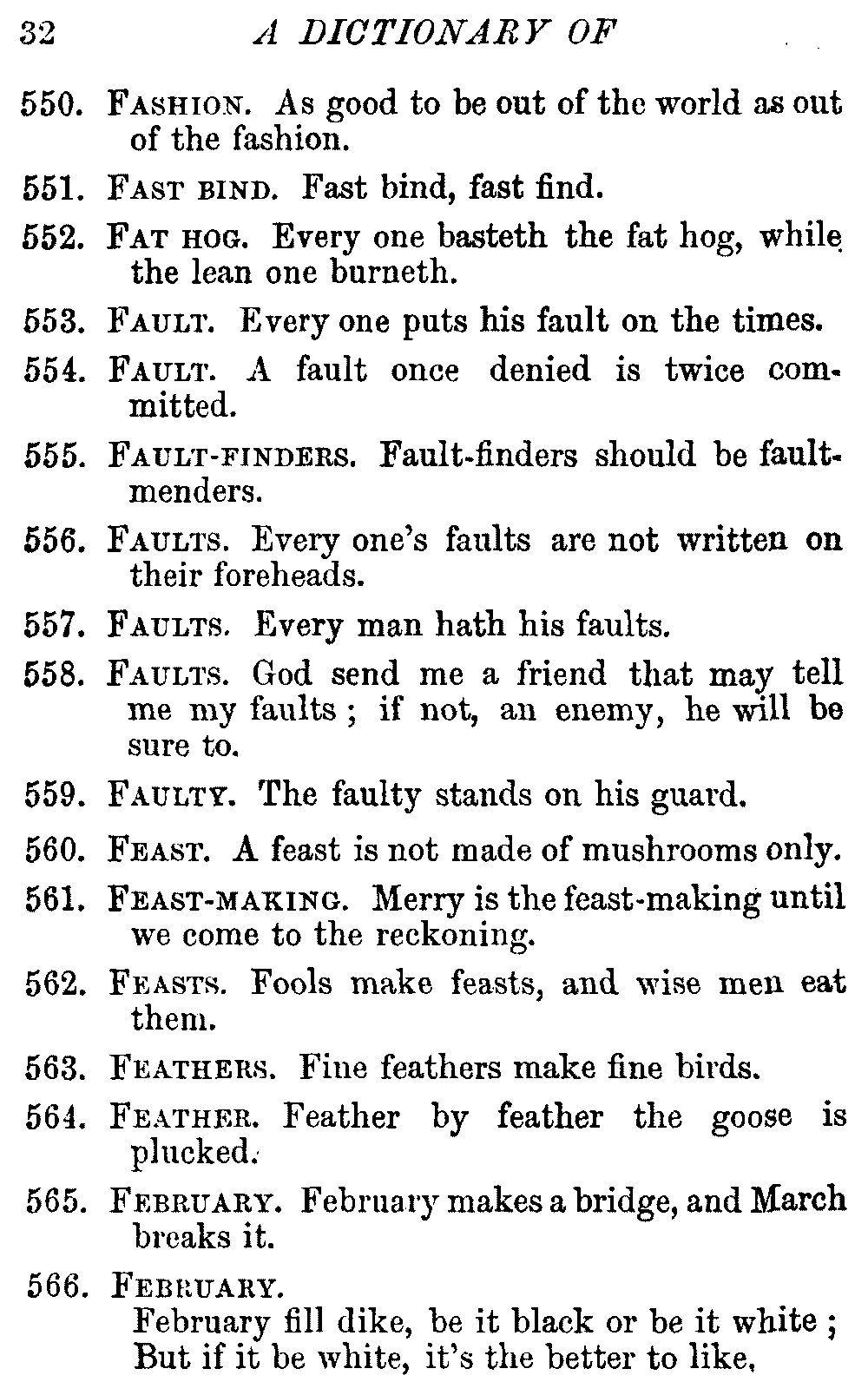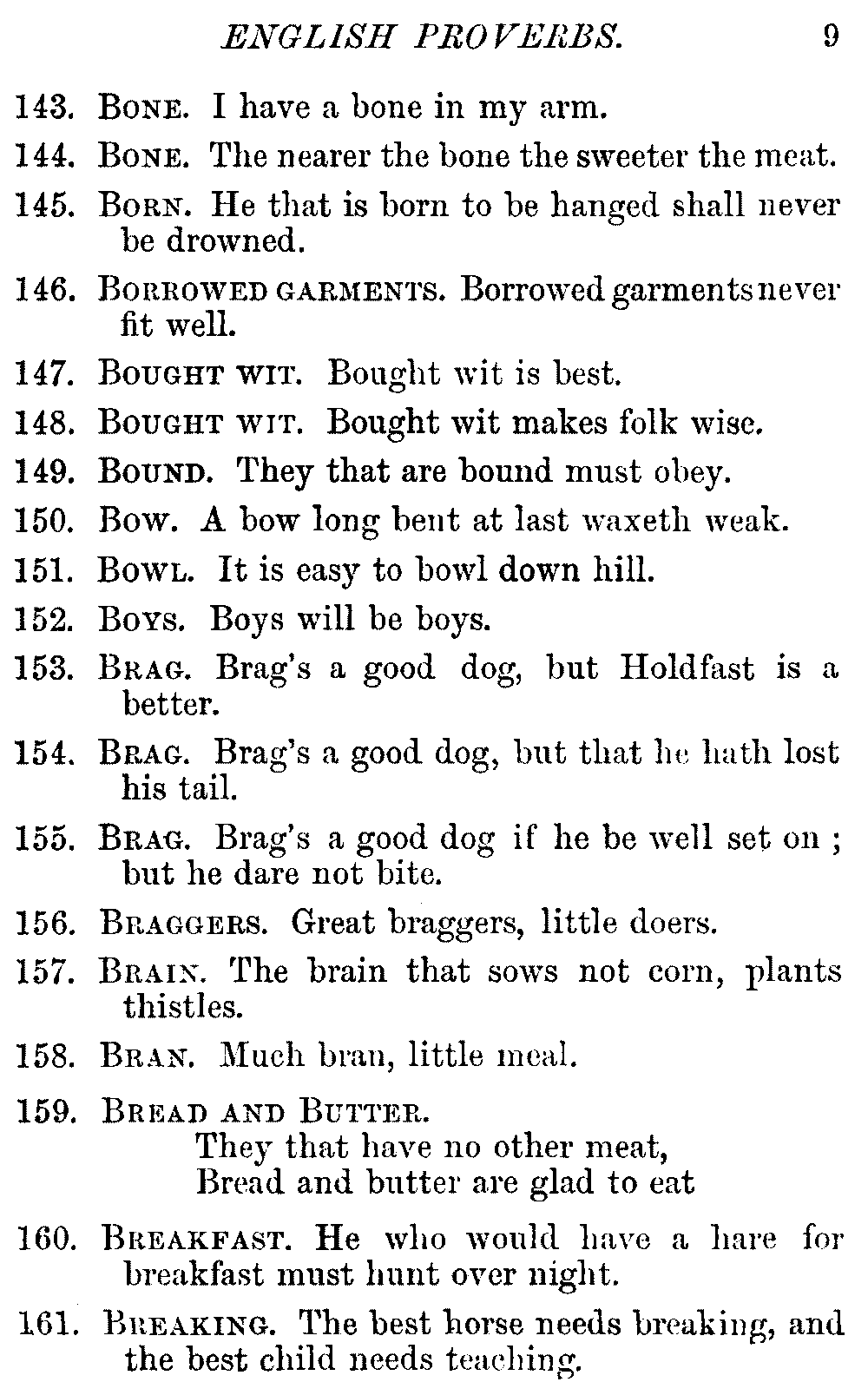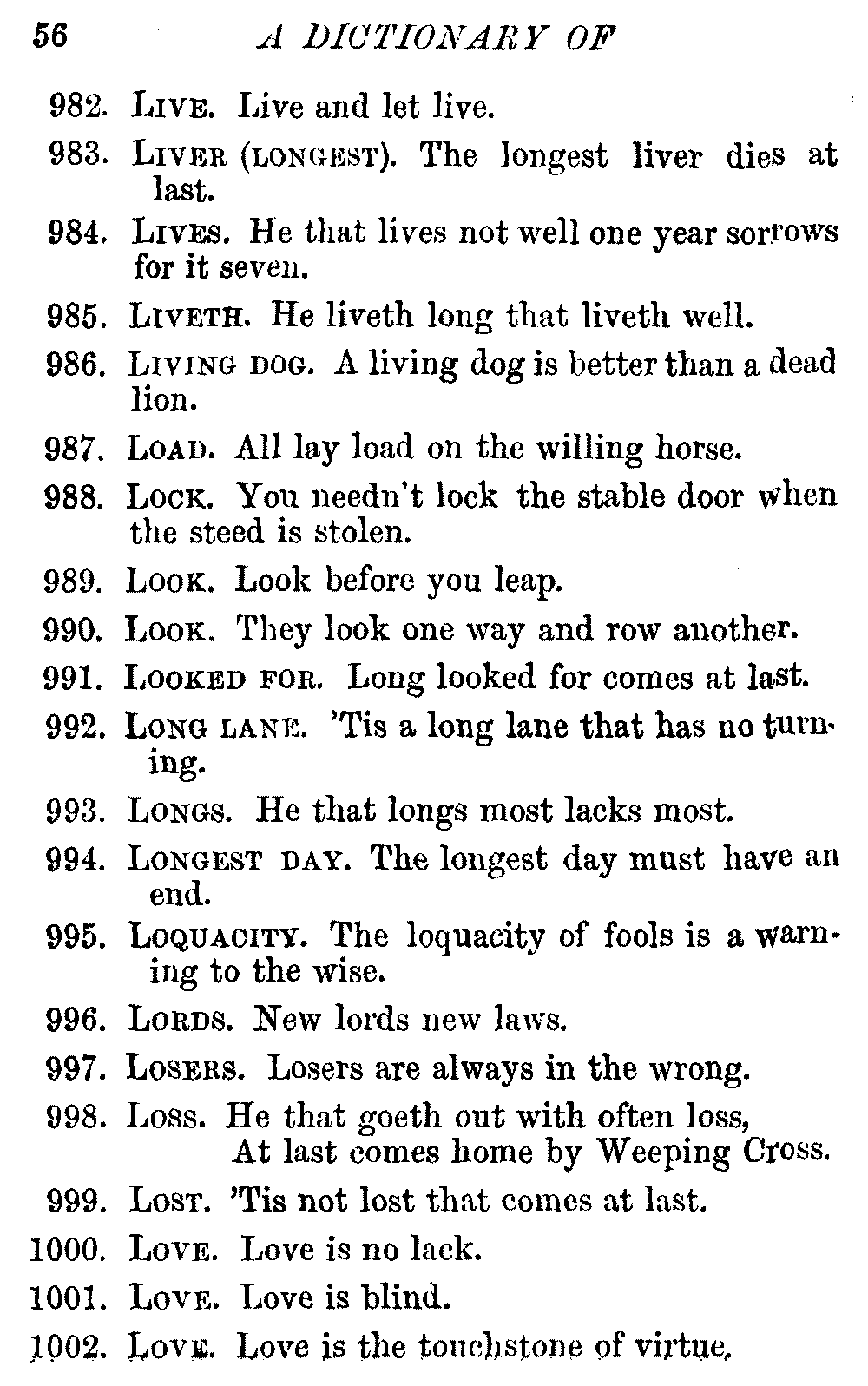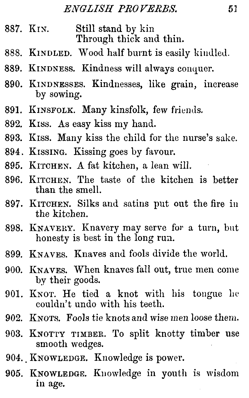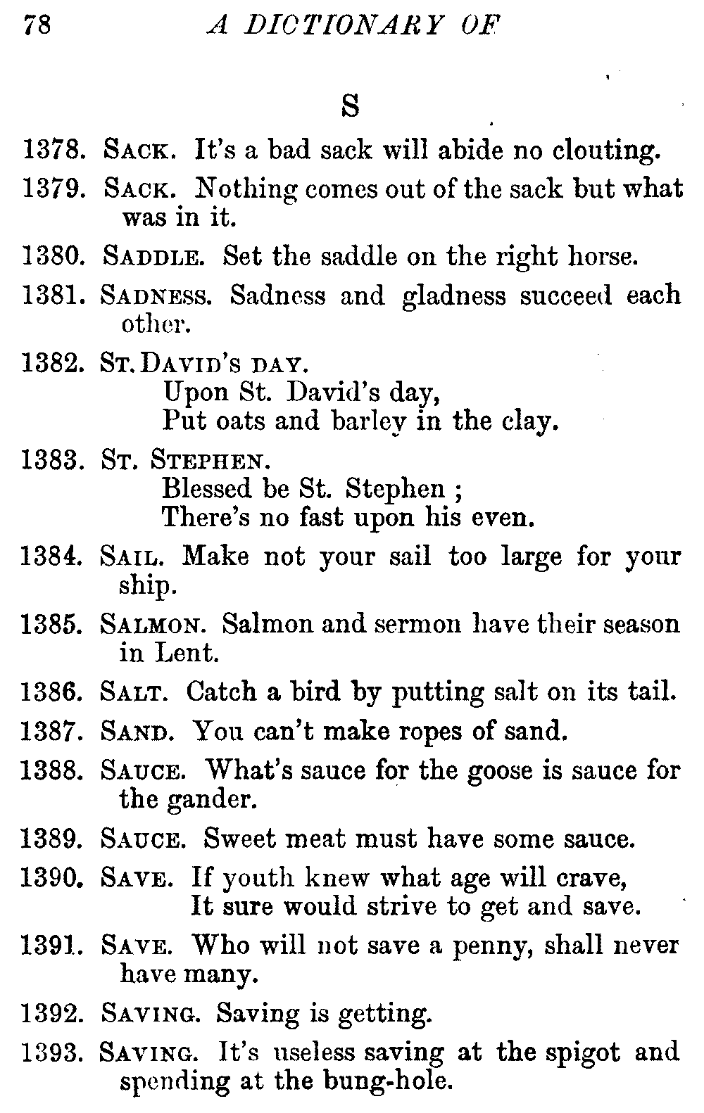 Other modern collections profess to give an "Alphabetical Index," but such an index is of little use when we find that it is framed on the rule that because a proverb begins with the article A, it should therefore be indexed under that letter. As, "A bald head is soon shaven." In another similar Index we find the proverb, "'Tis the second blow makes the fray," inserted under the letter T. In one index of this kind there are no less than twenty-two pages of A's [vii]and almost as many of The's. Indeed the whole index is compiled without the slightest regard to the subject of the proverbs. On this subject Disraeli, in his essay on the "Philosophy of Proverbs," says "The arrangement of proverbs has baffled the ingenuity of every one of their collectors. Ray, after long premeditation, has chosen a system with the appearance of an alphabetical order, but it turns out that his system is no system, and his alphabet is no alphabet. After ten years' labour the good man could only arrange his proverbs by commonplaces." In this little Dictionary, as we have already stated, the proverbs are arranged in alphabetical order, according to the leading words, and are consecutively numbered. But, in order to avoid repetition (as most of the proverbs contain, at least, two leading words), the subject words are used for the Dictionary, and the other principal words will be found in the Index, with a numerical reference to the proverb. The great advantage of this arrangement is, that if only one important word of a proverb be remembered, that word can be turned to in the Dictionary, and, if not found there, will certainly be in the Index. Nearly two thousand of the leading words are thus indexed—enough to make it almost impossible to miss finding what is wanted. This plan has also the effect [viii]of bringing together the proverbs on kindred subjects, which is often a matter of importance to writers, and is, moreover, most amusing to those who only read the book to while away a leisure hour. Ready reference is further facilitated in the Index by the addition of associated words. If one word only had been given, the reader might have had to refer to eleven proverbs before he found the one he required; as, for example, in the case of Dog.