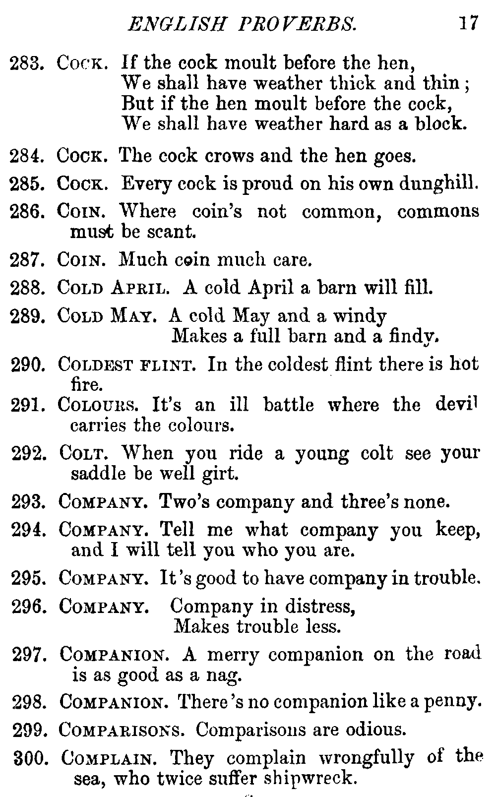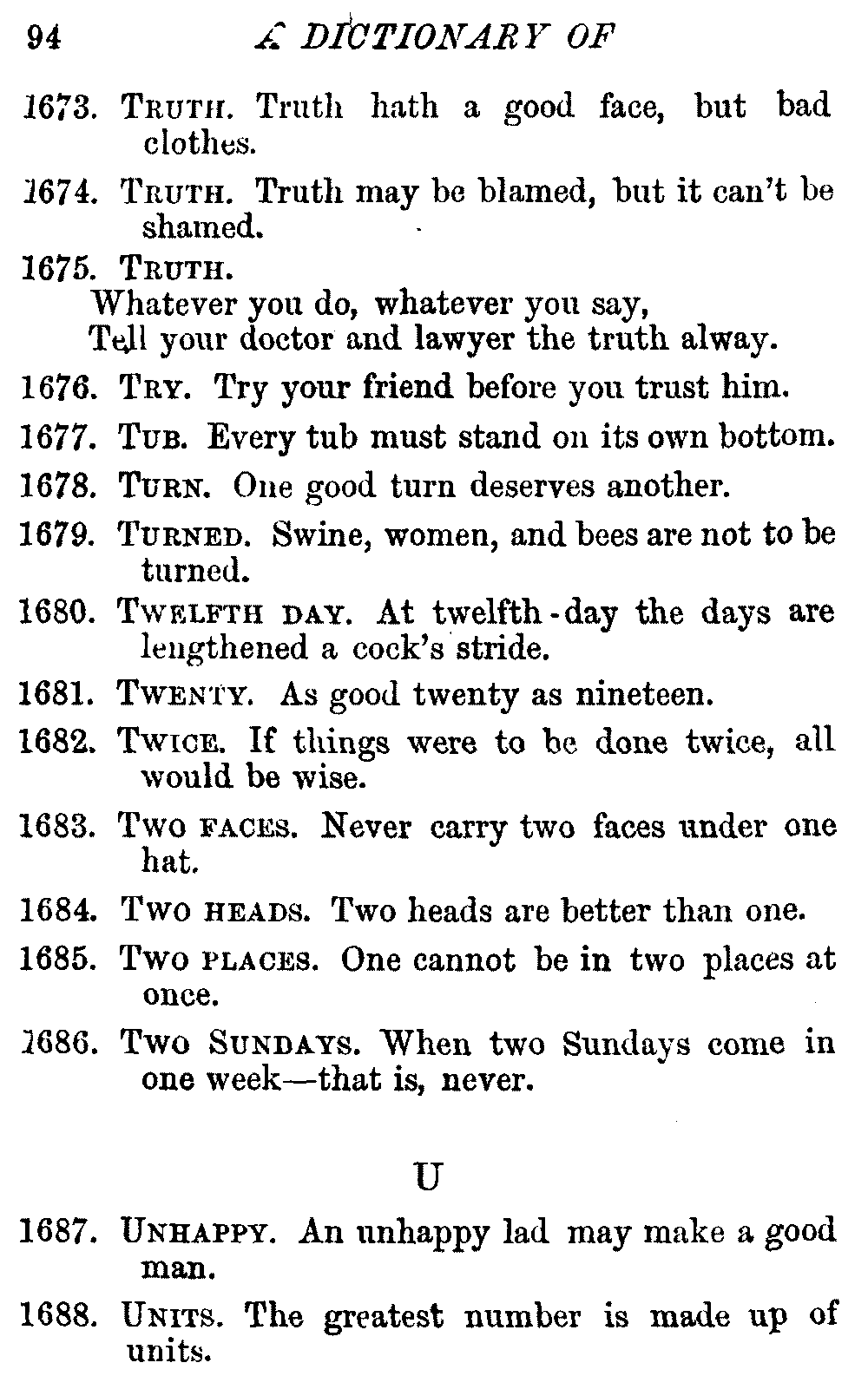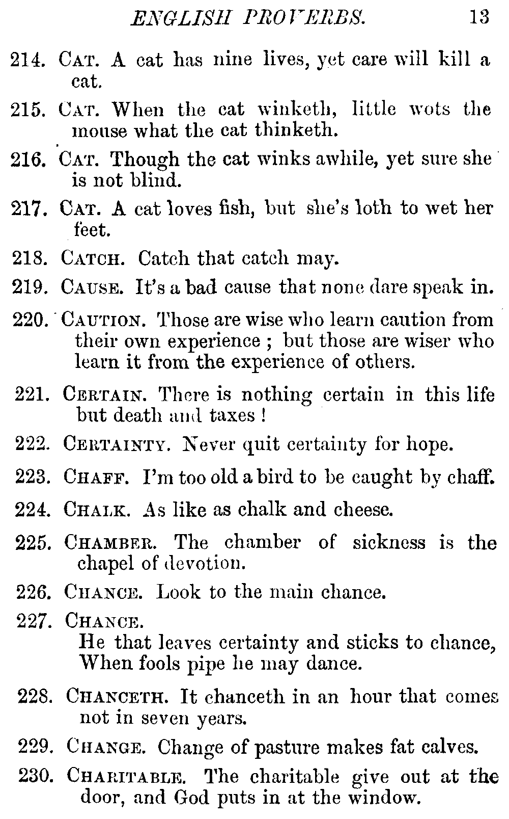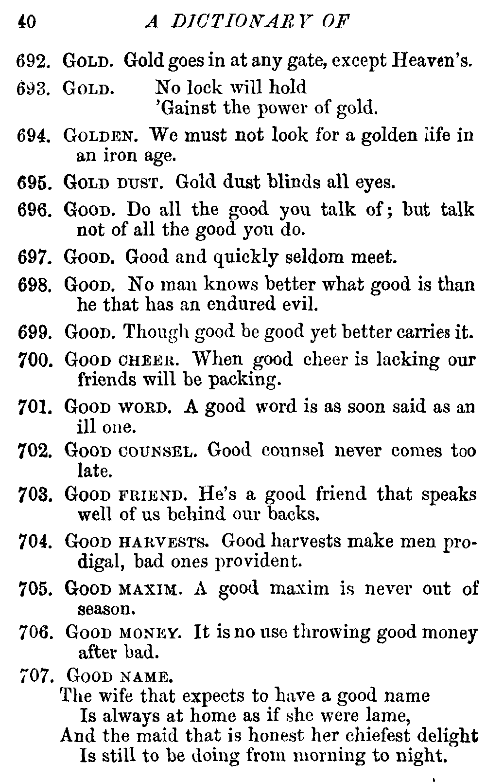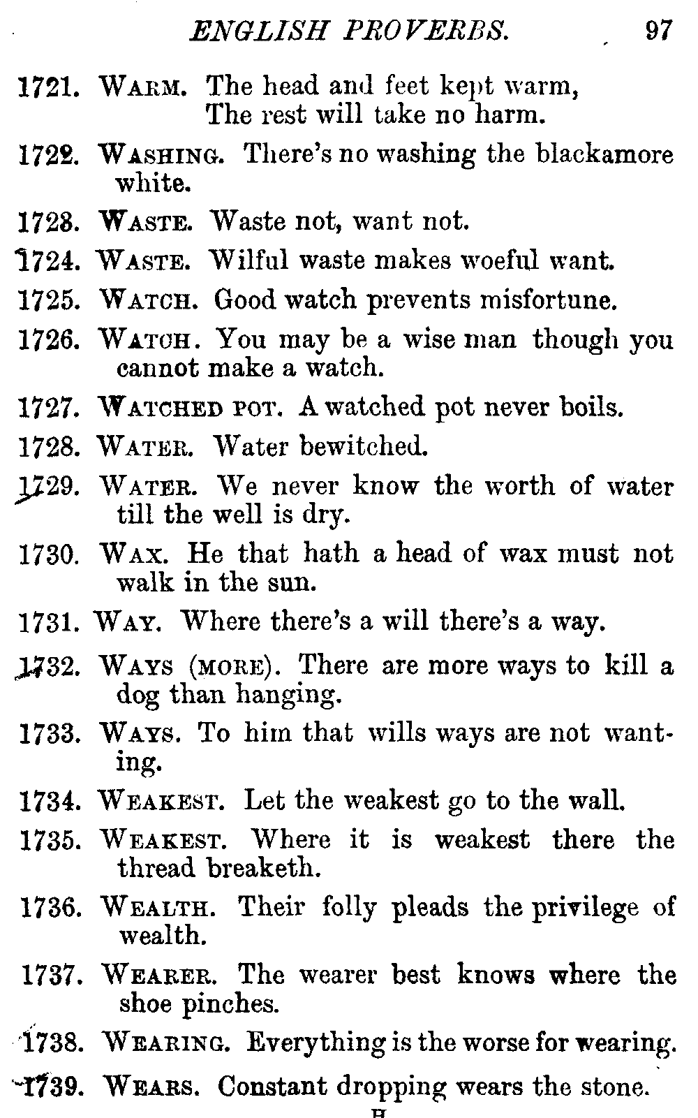 Other modern collections profess to give an "Alphabetical Index," but such an index is of little use when we find that it is framed on the rule that because a proverb begins with the article A, it should therefore be indexed under that letter. As, "A bald head is soon shaven." In another similar Index we find the proverb, "'Tis the second blow makes the fray," inserted under the letter T. In one index of this kind there are no less than twenty-two pages of A's [vii]and almost as many of The's. Indeed the whole index is compiled without the slightest regard to the subject of the proverbs. On this subject Disraeli, in his essay on the "Philosophy of Proverbs," says "The arrangement of proverbs has baffled the ingenuity of every one of their collectors. Ray, after long premeditation, has chosen a system with the appearance of an alphabetical order, but it turns out that his system is no system, and his alphabet is no alphabet. After ten years' labour the good man could only arrange his proverbs by commonplaces." In this little Dictionary, as we have already stated, the proverbs are arranged in alphabetical order, according to the leading words, and are consecutively numbered. But, in order to avoid repetition (as most of the proverbs contain, at least, two leading words), the subject words are used for the Dictionary, and the other principal words will be found in the Index, with a numerical reference to the proverb. The great advantage of this arrangement is, that if only one important word of a proverb be remembered, that word can be turned to in the Dictionary, and, if not found there, will certainly be in the Index. Nearly two thousand of the leading words are thus indexed—enough to make it almost impossible to miss finding what is wanted. This plan has also the effect [viii]of bringing together the proverbs on kindred subjects, which is often a matter of importance to writers, and is, moreover, most amusing to those who only read the book to while away a leisure hour. Ready reference is further facilitated in the Index by the addition of associated words. If one word only had been given, the reader might have had to refer to eleven proverbs before he found the one he required; as, for example, in the case of Dog.