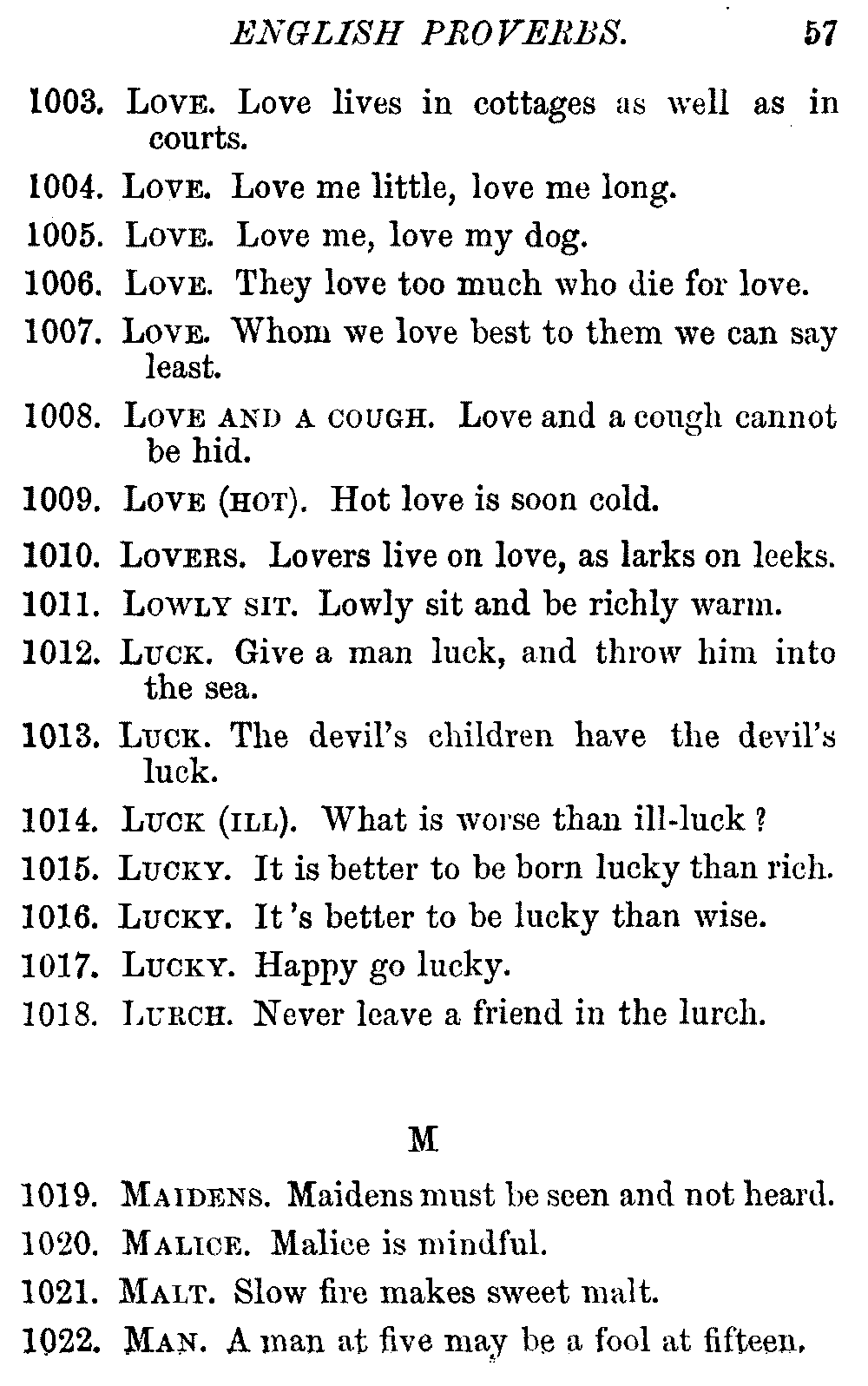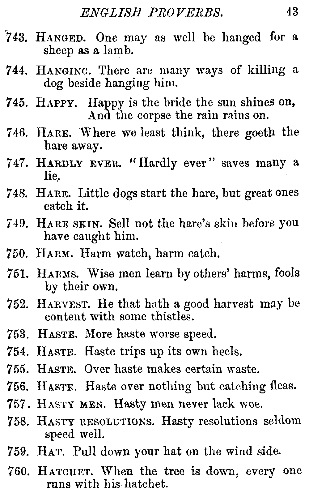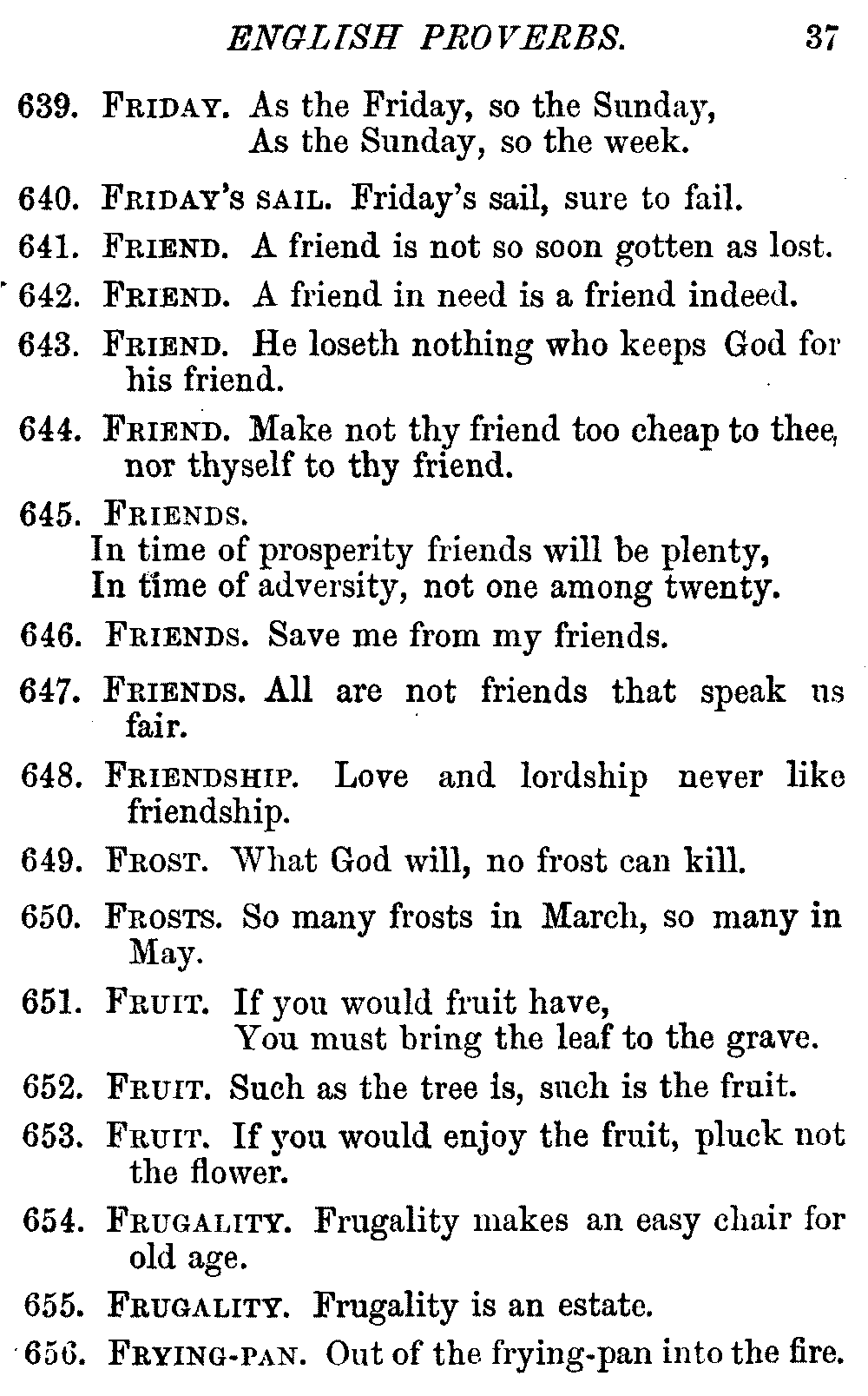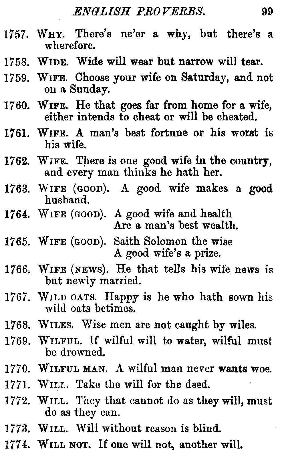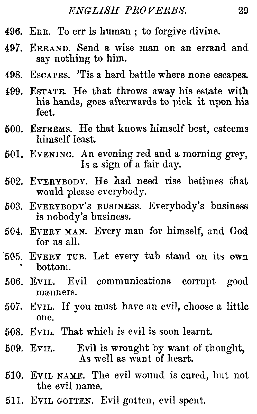 Other modern collections profess to give an "Alphabetical Index," but such an index is of little use when we find that it is framed on the rule that because a proverb begins with the article A, it should therefore be indexed under that letter. As, "A bald head is soon shaven." In another similar Index we find the proverb, "'Tis the second blow makes the fray," inserted under the letter T. In one index of this kind there are no less than twenty-two pages of A's [vii]and almost as many of The's. Indeed the whole index is compiled without the slightest regard to the subject of the proverbs. On this subject Disraeli, in his essay on the "Philosophy of Proverbs," says "The arrangement of proverbs has baffled the ingenuity of every one of their collectors. Ray, after long premeditation, has chosen a system with the appearance of an alphabetical order, but it turns out that his system is no system, and his alphabet is no alphabet. After ten years' labour the good man could only arrange his proverbs by commonplaces." In this little Dictionary, as we have already stated, the proverbs are arranged in alphabetical order, according to the leading words, and are consecutively numbered. But, in order to avoid repetition (as most of the proverbs contain, at least, two leading words), the subject words are used for the Dictionary, and the other principal words will be found in the Index, with a numerical reference to the proverb. The great advantage of this arrangement is, that if only one important word of a proverb be remembered, that word can be turned to in the Dictionary, and, if not found there, will certainly be in the Index. Nearly two thousand of the leading words are thus indexed—enough to make it almost impossible to miss finding what is wanted. This plan has also the effect [viii]of bringing together the proverbs on kindred subjects, which is often a matter of importance to writers, and is, moreover, most amusing to those who only read the book to while away a leisure hour. Ready reference is further facilitated in the Index by the addition of associated words. If one word only had been given, the reader might have had to refer to eleven proverbs before he found the one he required; as, for example, in the case of Dog.