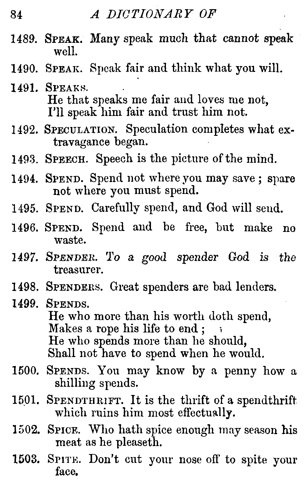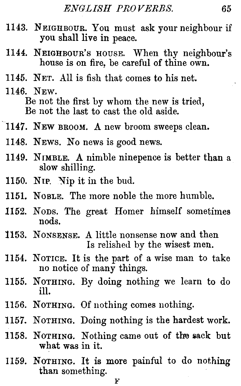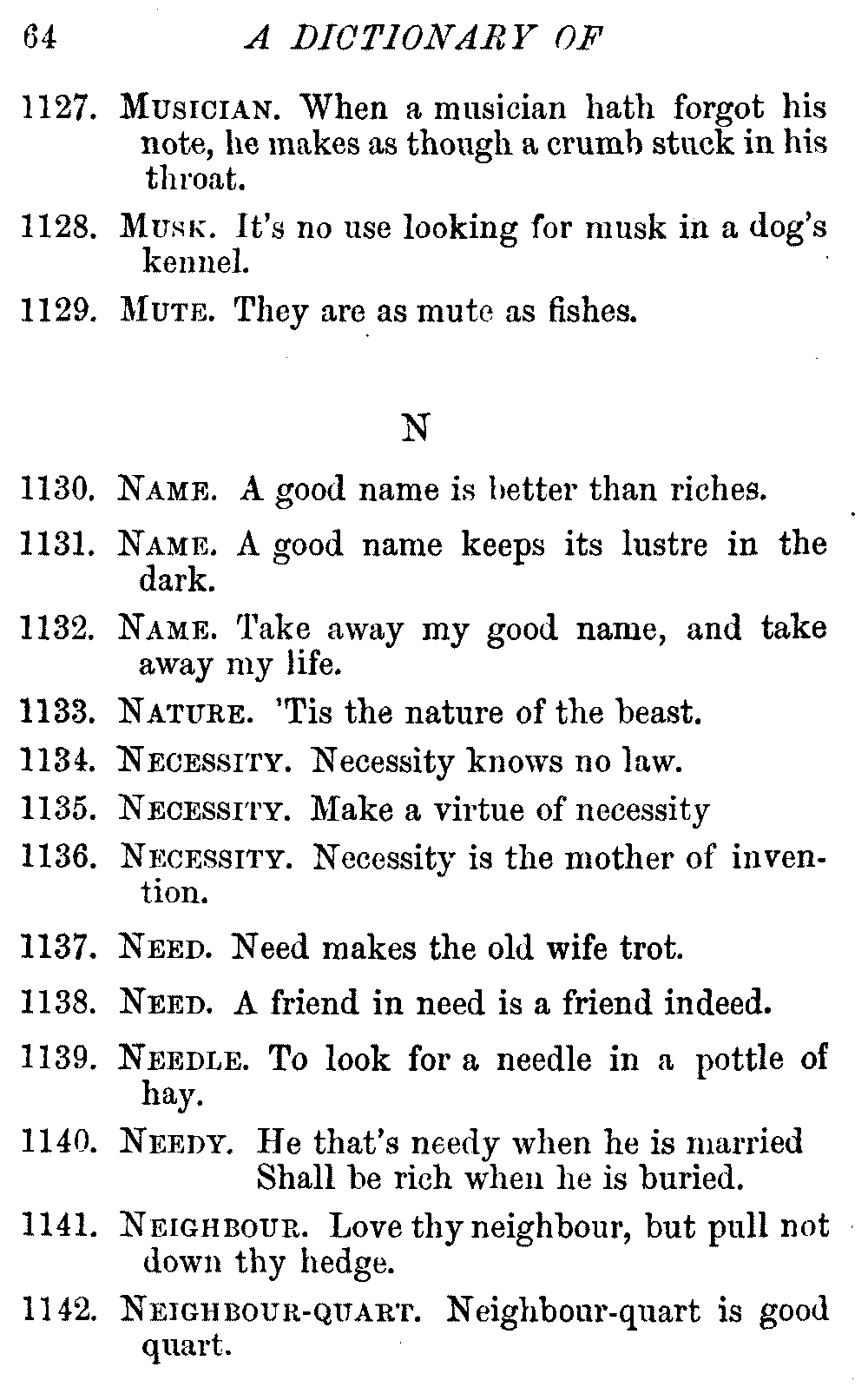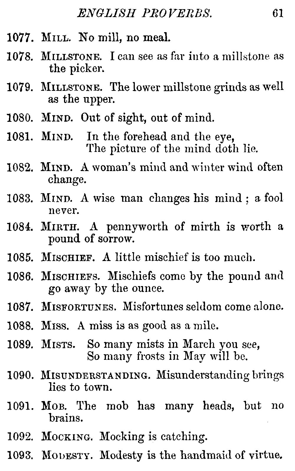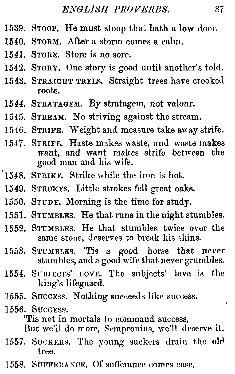 Other modern collections profess to give an "Alphabetical Index," but such an index is of little use when we find that it is framed on the rule that because a proverb begins with the article A, it should therefore be indexed under that letter. As, "A bald head is soon shaven." In another similar Index we find the proverb, "'Tis the second blow makes the fray," inserted under the letter T. In one index of this kind there are no less than twenty-two pages of A's [vii]and almost as many of The's. Indeed the whole index is compiled without the slightest regard to the subject of the proverbs. On this subject Disraeli, in his essay on the "Philosophy of Proverbs," says "The arrangement of proverbs has baffled the ingenuity of every one of their collectors. Ray, after long premeditation, has chosen a system with the appearance of an alphabetical order, but it turns out that his system is no system, and his alphabet is no alphabet. After ten years' labour the good man could only arrange his proverbs by commonplaces." In this little Dictionary, as we have already stated, the proverbs are arranged in alphabetical order, according to the leading words, and are consecutively numbered. But, in order to avoid repetition (as most of the proverbs contain, at least, two leading words), the subject words are used for the Dictionary, and the other principal words will be found in the Index, with a numerical reference to the proverb. The great advantage of this arrangement is, that if only one important word of a proverb be remembered, that word can be turned to in the Dictionary, and, if not found there, will certainly be in the Index. Nearly two thousand of the leading words are thus indexed—enough to make it almost impossible to miss finding what is wanted. This plan has also the effect [viii]of bringing together the proverbs on kindred subjects, which is often a matter of importance to writers, and is, moreover, most amusing to those who only read the book to while away a leisure hour. Ready reference is further facilitated in the Index by the addition of associated words. If one word only had been given, the reader might have had to refer to eleven proverbs before he found the one he required; as, for example, in the case of Dog.