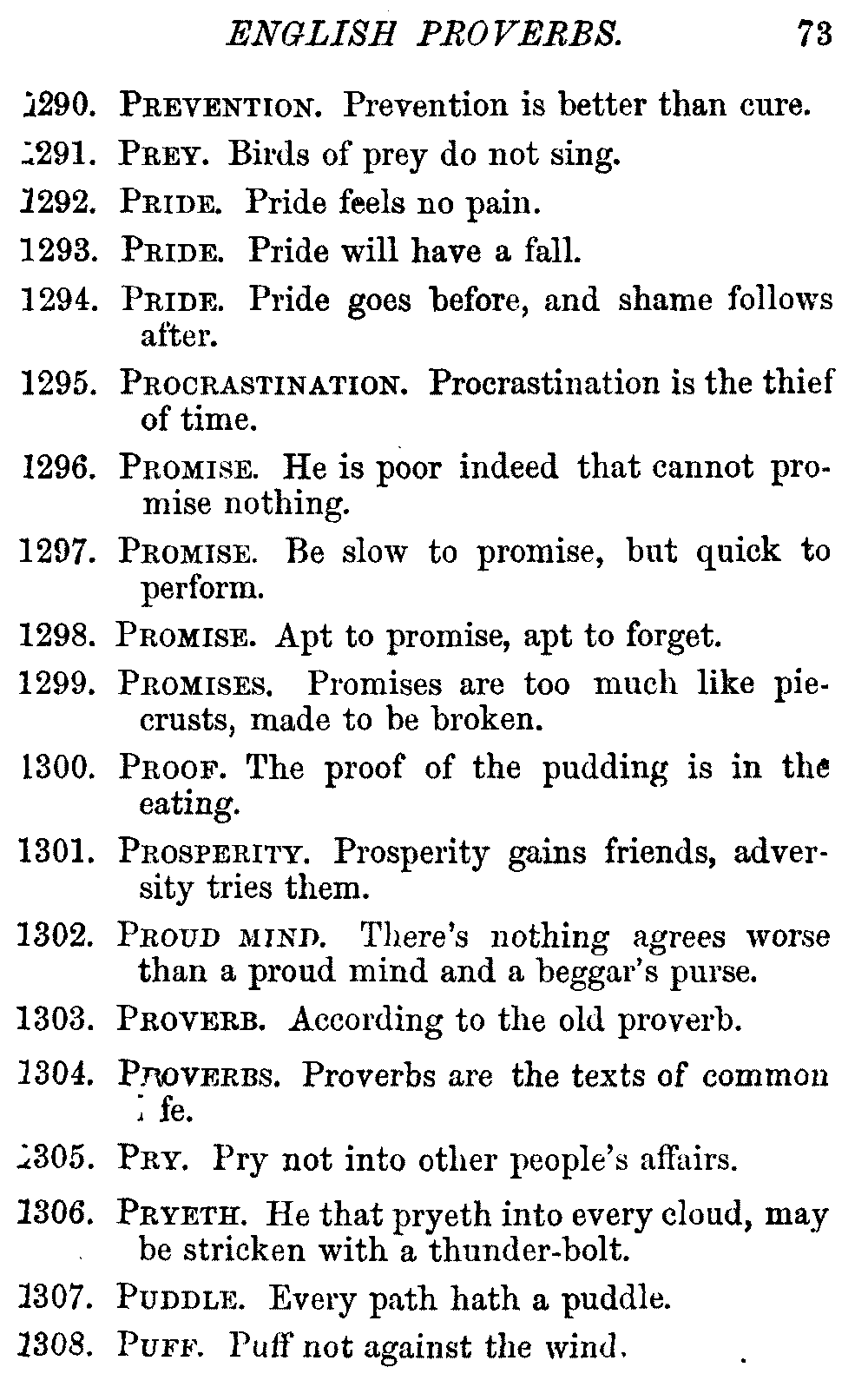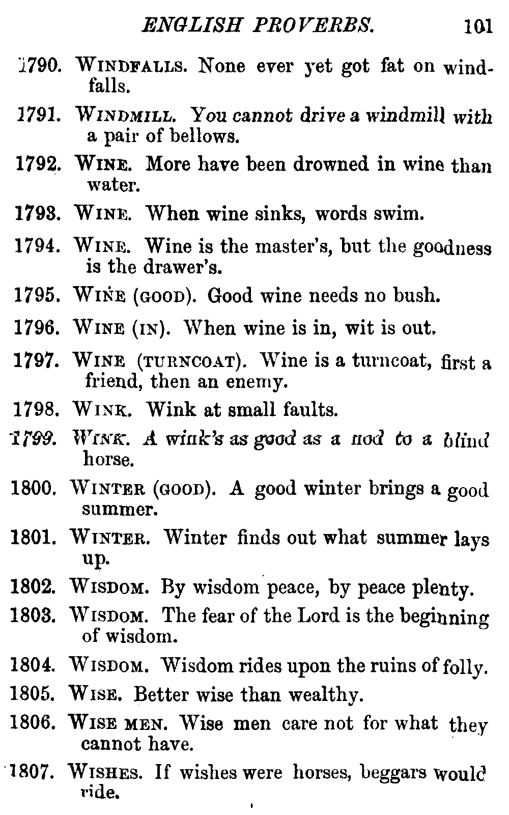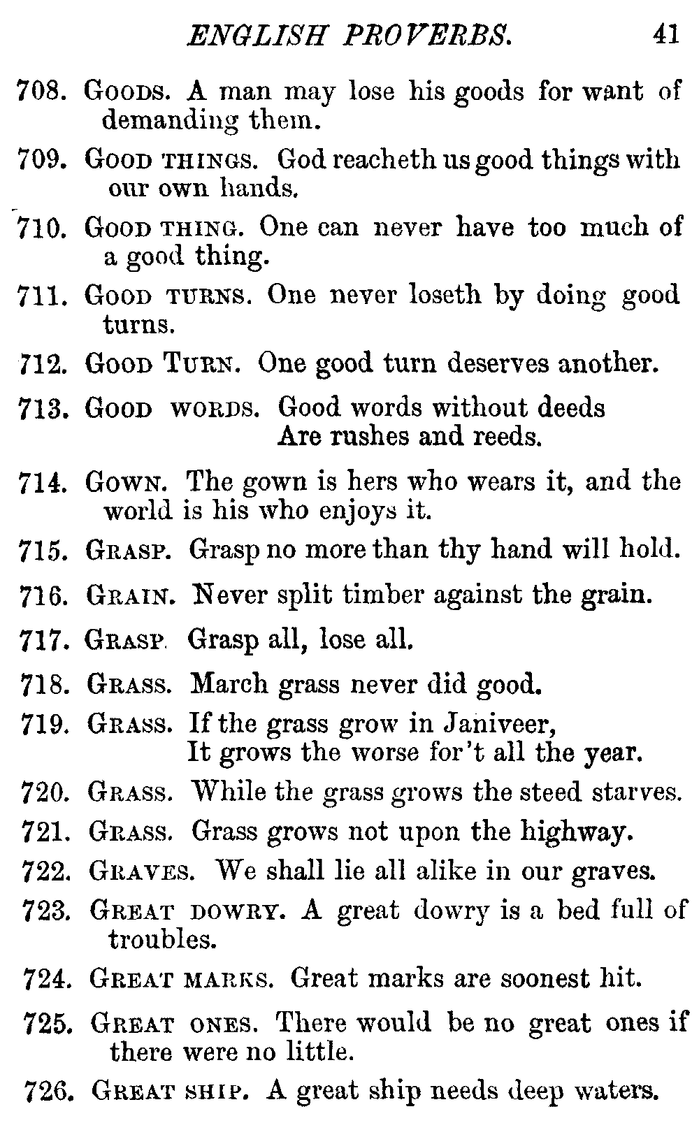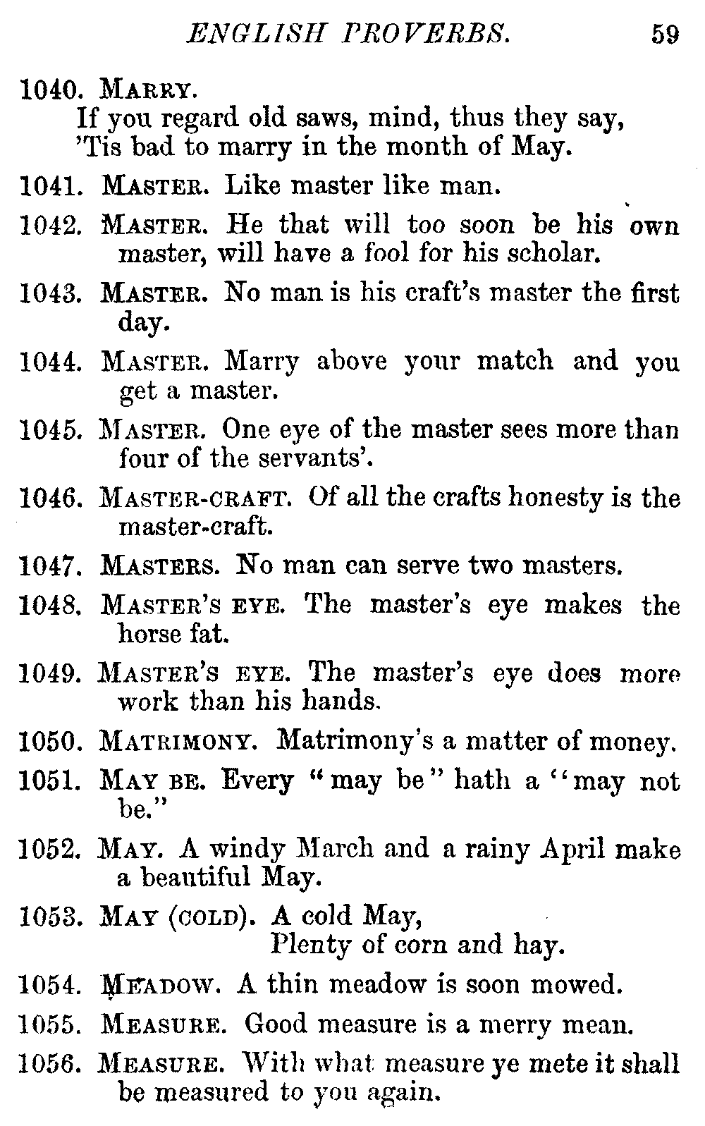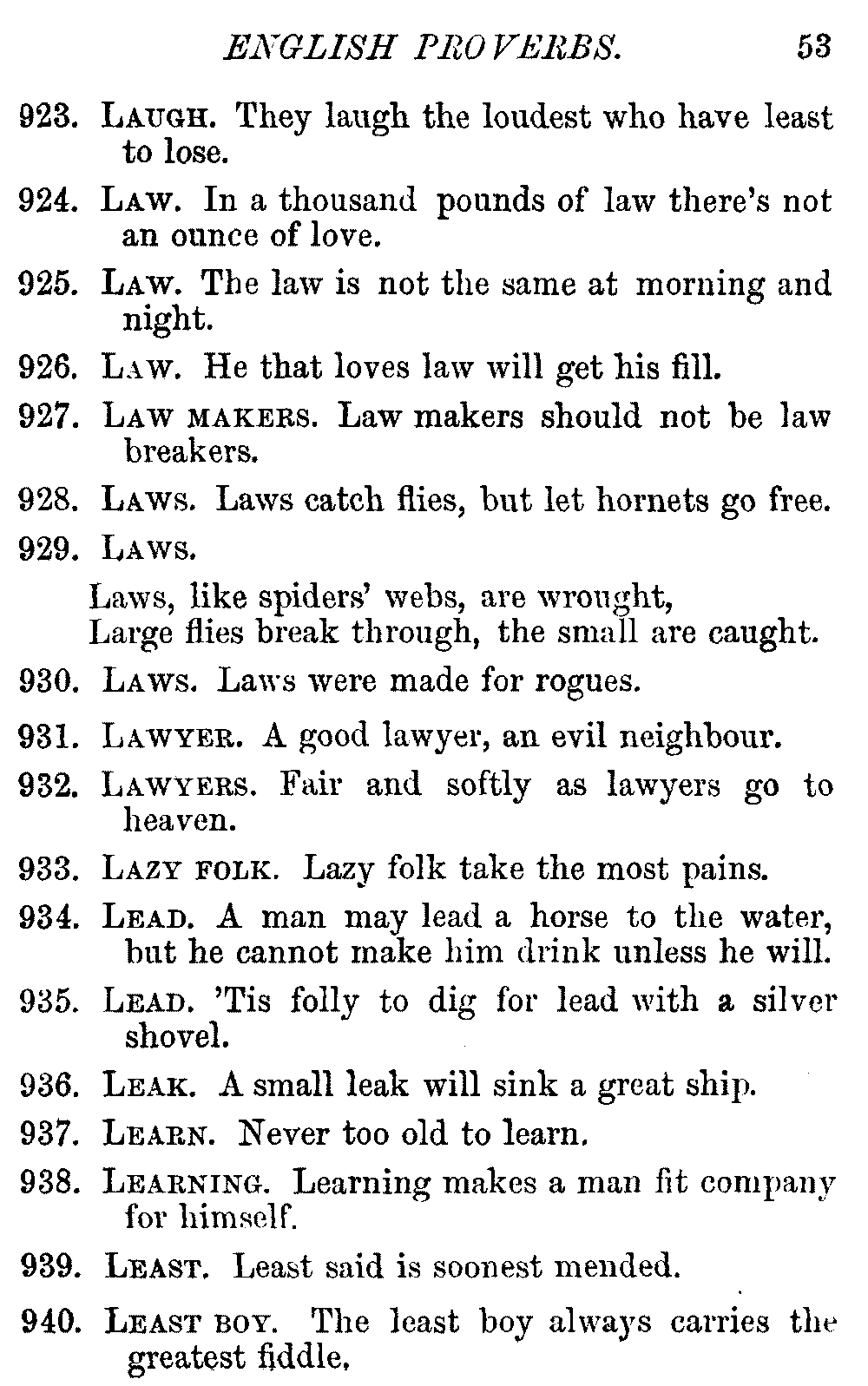 Other modern collections profess to give an "Alphabetical Index," but such an index is of little use when we find that it is framed on the rule that because a proverb begins with the article A, it should therefore be indexed under that letter. As, "A bald head is soon shaven." In another similar Index we find the proverb, "'Tis the second blow makes the fray," inserted under the letter T. In one index of this kind there are no less than twenty-two pages of A's [vii]and almost as many of The's. Indeed the whole index is compiled without the slightest regard to the subject of the proverbs. On this subject Disraeli, in his essay on the "Philosophy of Proverbs," says "The arrangement of proverbs has baffled the ingenuity of every one of their collectors. Ray, after long premeditation, has chosen a system with the appearance of an alphabetical order, but it turns out that his system is no system, and his alphabet is no alphabet. After ten years' labour the good man could only arrange his proverbs by commonplaces." In this little Dictionary, as we have already stated, the proverbs are arranged in alphabetical order, according to the leading words, and are consecutively numbered. But, in order to avoid repetition (as most of the proverbs contain, at least, two leading words), the subject words are used for the Dictionary, and the other principal words will be found in the Index, with a numerical reference to the proverb. The great advantage of this arrangement is, that if only one important word of a proverb be remembered, that word can be turned to in the Dictionary, and, if not found there, will certainly be in the Index. Nearly two thousand of the leading words are thus indexed—enough to make it almost impossible to miss finding what is wanted. This plan has also the effect [viii]of bringing together the proverbs on kindred subjects, which is often a matter of importance to writers, and is, moreover, most amusing to those who only read the book to while away a leisure hour. Ready reference is further facilitated in the Index by the addition of associated words. If one word only had been given, the reader might have had to refer to eleven proverbs before he found the one he required; as, for example, in the case of Dog.