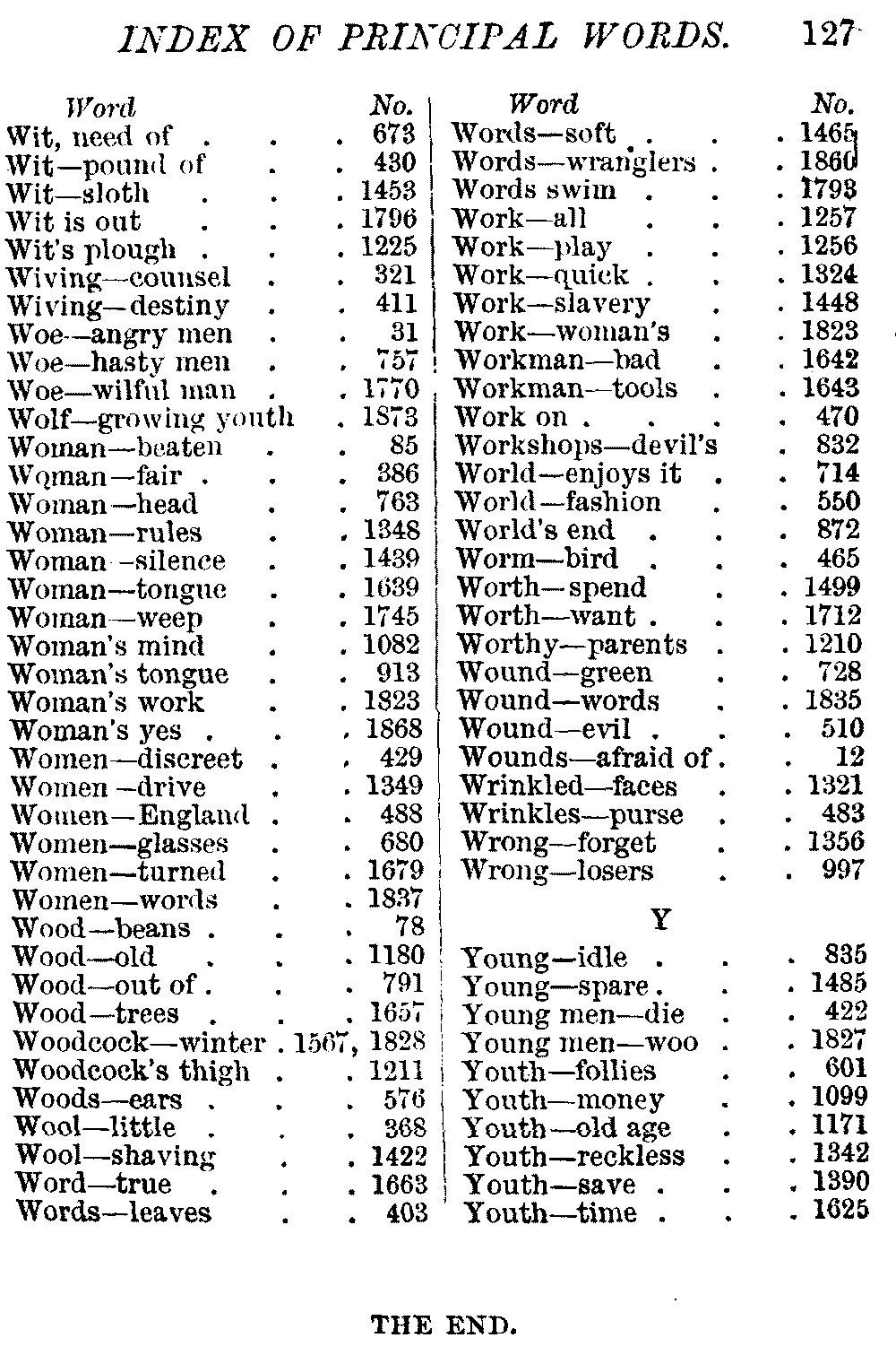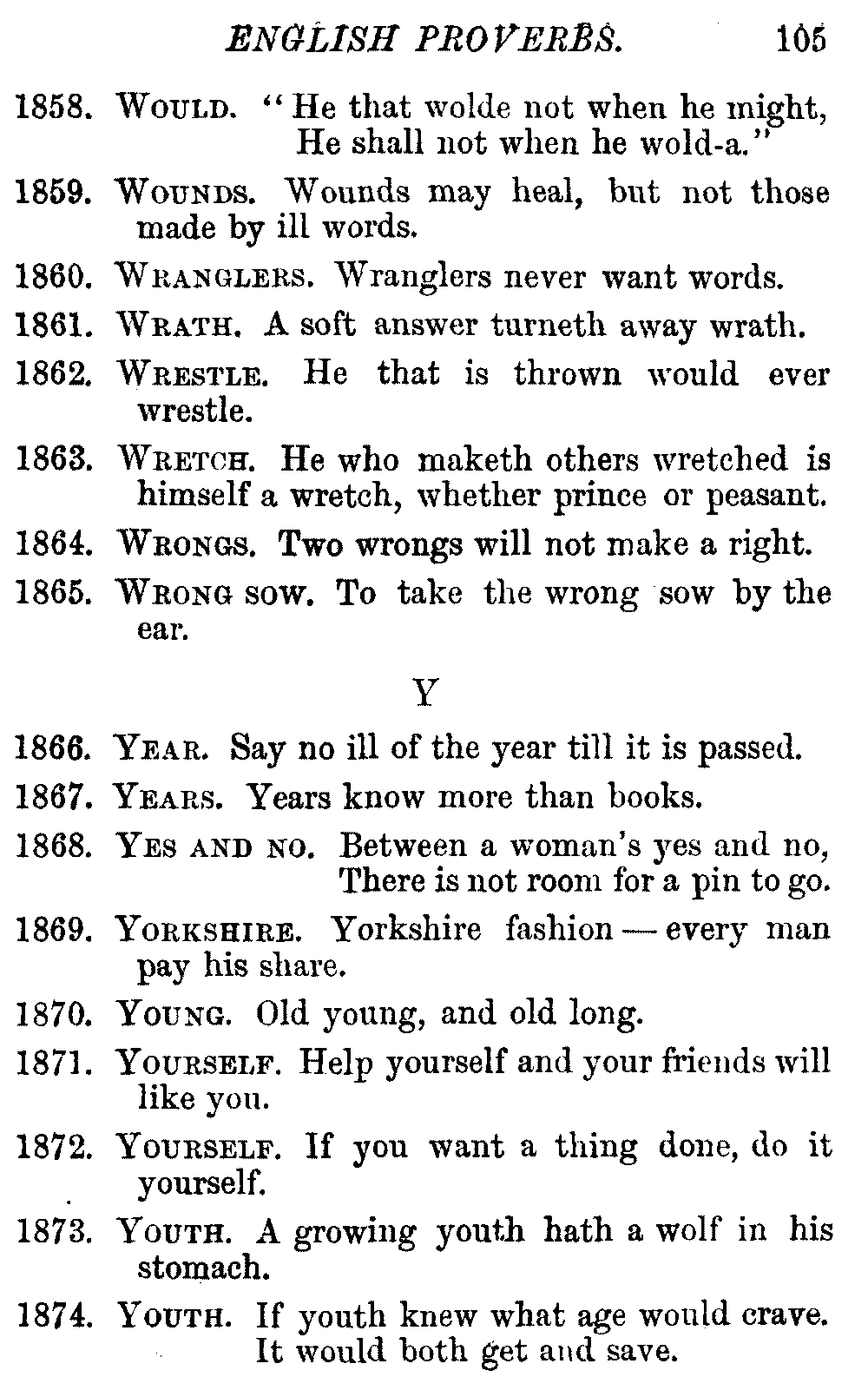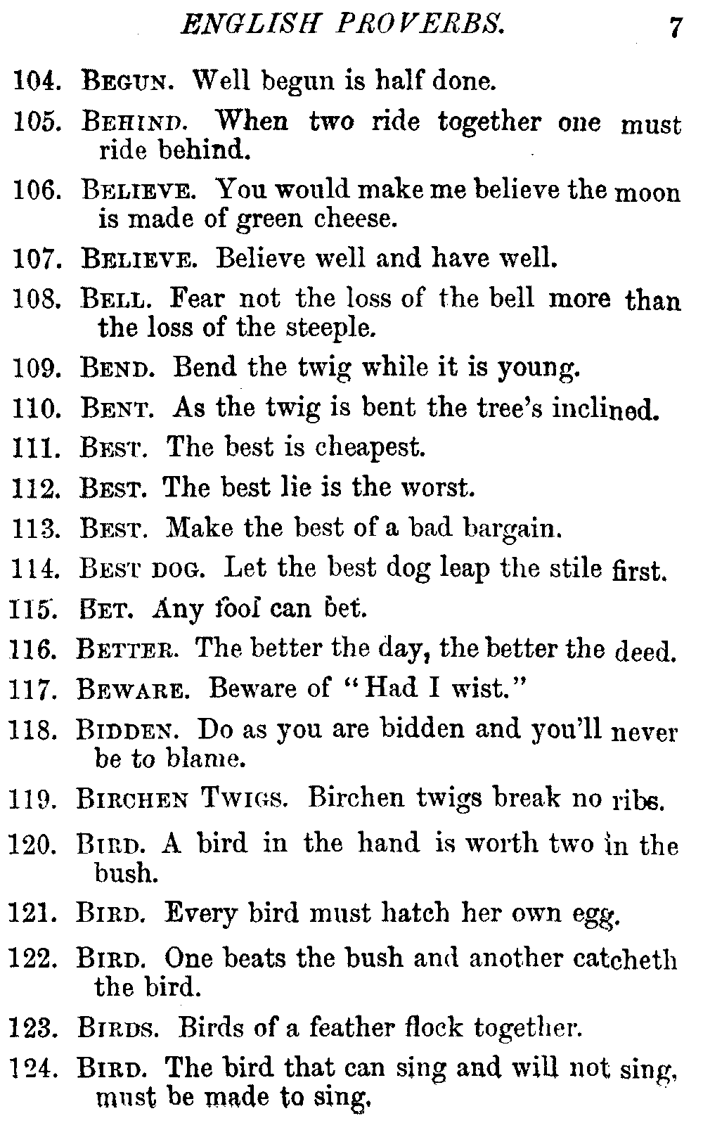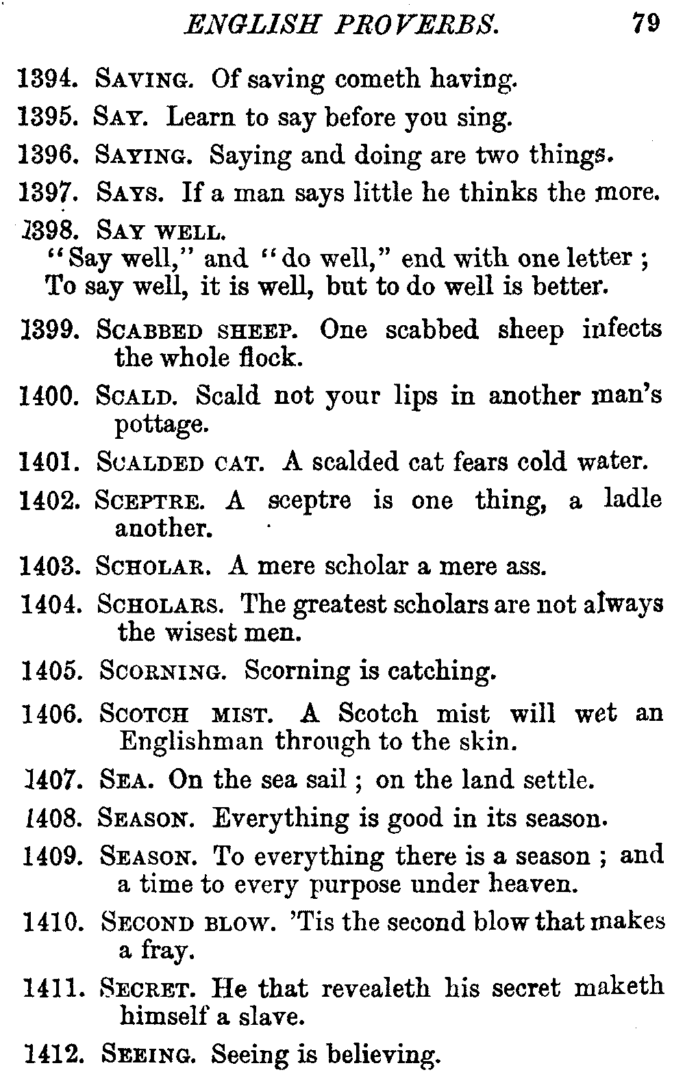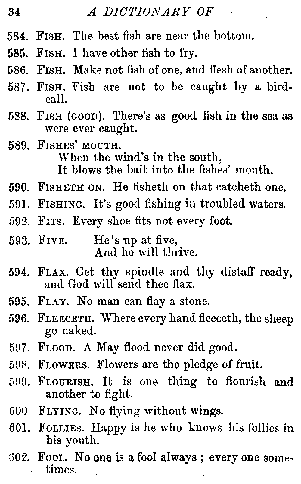 Other modern collections profess to give an "Alphabetical Index," but such an index is of little use when we find that it is framed on the rule that because a proverb begins with the article A, it should therefore be indexed under that letter. As, "A bald head is soon shaven." In another similar Index we find the proverb, "'Tis the second blow makes the fray," inserted under the letter T. In one index of this kind there are no less than twenty-two pages of A's [vii]and almost as many of The's. Indeed the whole index is compiled without the slightest regard to the subject of the proverbs. On this subject Disraeli, in his essay on the "Philosophy of Proverbs," says "The arrangement of proverbs has baffled the ingenuity of every one of their collectors. Ray, after long premeditation, has chosen a system with the appearance of an alphabetical order, but it turns out that his system is no system, and his alphabet is no alphabet. After ten years' labour the good man could only arrange his proverbs by commonplaces." In this little Dictionary, as we have already stated, the proverbs are arranged in alphabetical order, according to the leading words, and are consecutively numbered. But, in order to avoid repetition (as most of the proverbs contain, at least, two leading words), the subject words are used for the Dictionary, and the other principal words will be found in the Index, with a numerical reference to the proverb. The great advantage of this arrangement is, that if only one important word of a proverb be remembered, that word can be turned to in the Dictionary, and, if not found there, will certainly be in the Index. Nearly two thousand of the leading words are thus indexed—enough to make it almost impossible to miss finding what is wanted. This plan has also the effect [viii]of bringing together the proverbs on kindred subjects, which is often a matter of importance to writers, and is, moreover, most amusing to those who only read the book to while away a leisure hour. Ready reference is further facilitated in the Index by the addition of associated words. If one word only had been given, the reader might have had to refer to eleven proverbs before he found the one he required; as, for example, in the case of Dog.