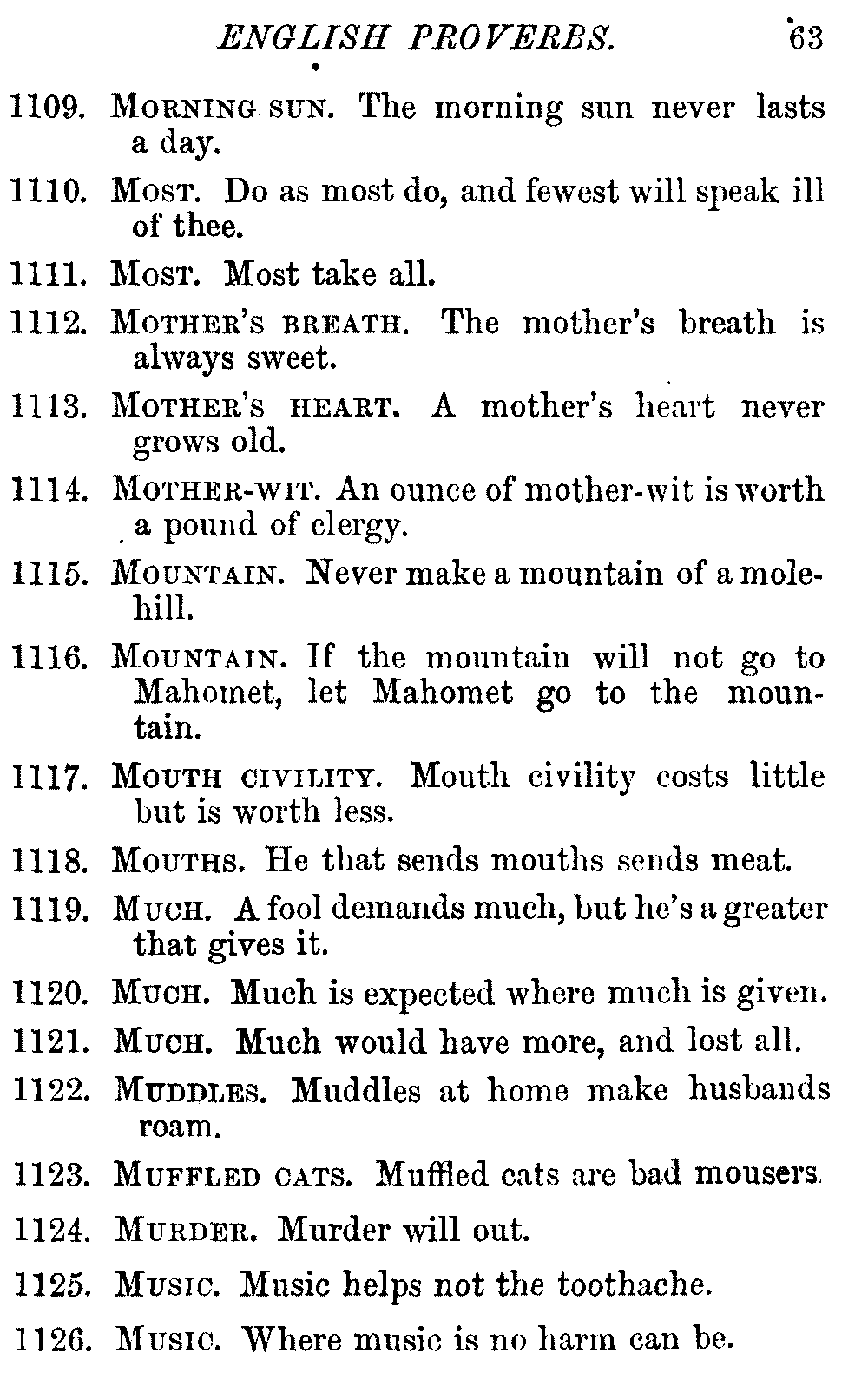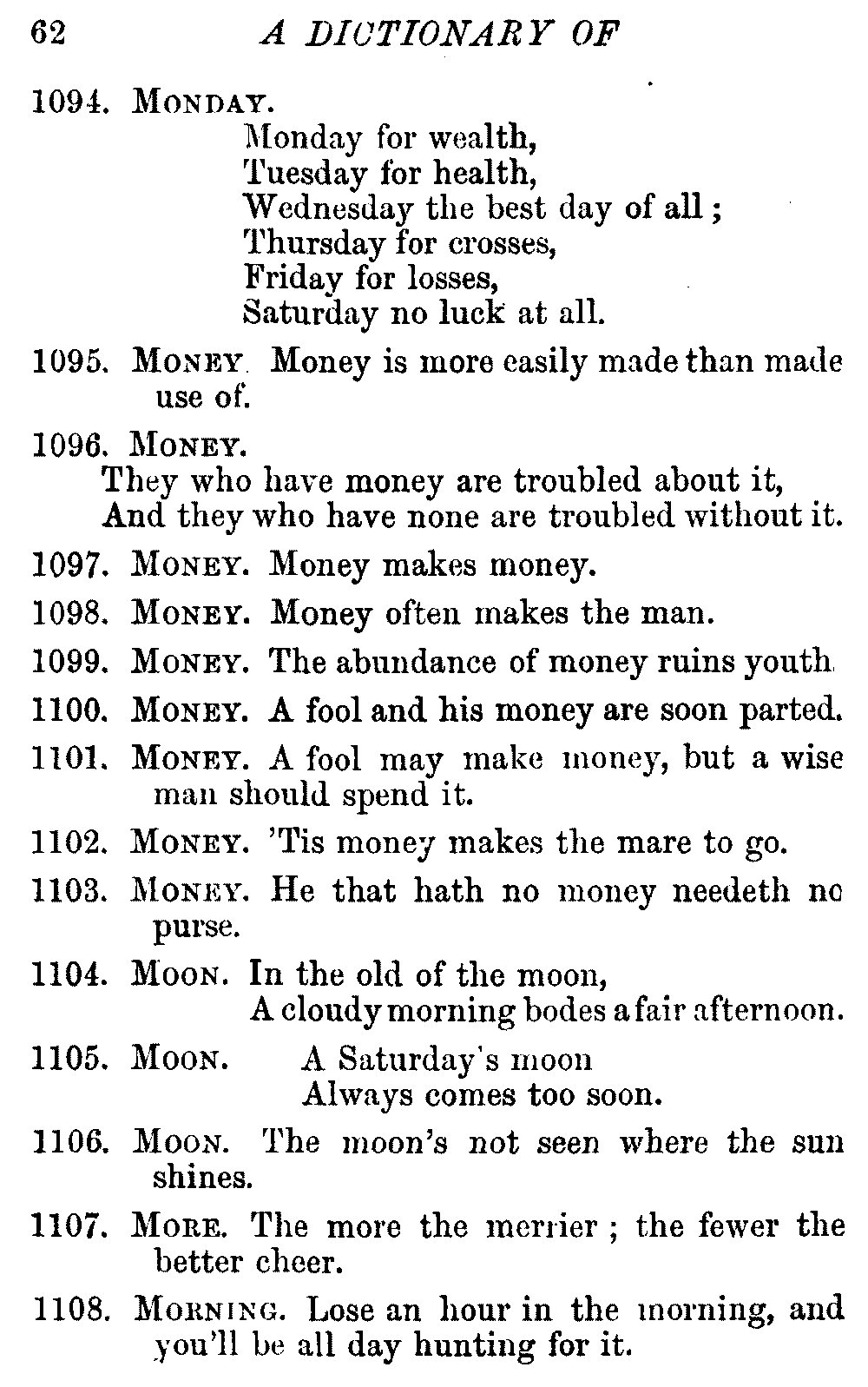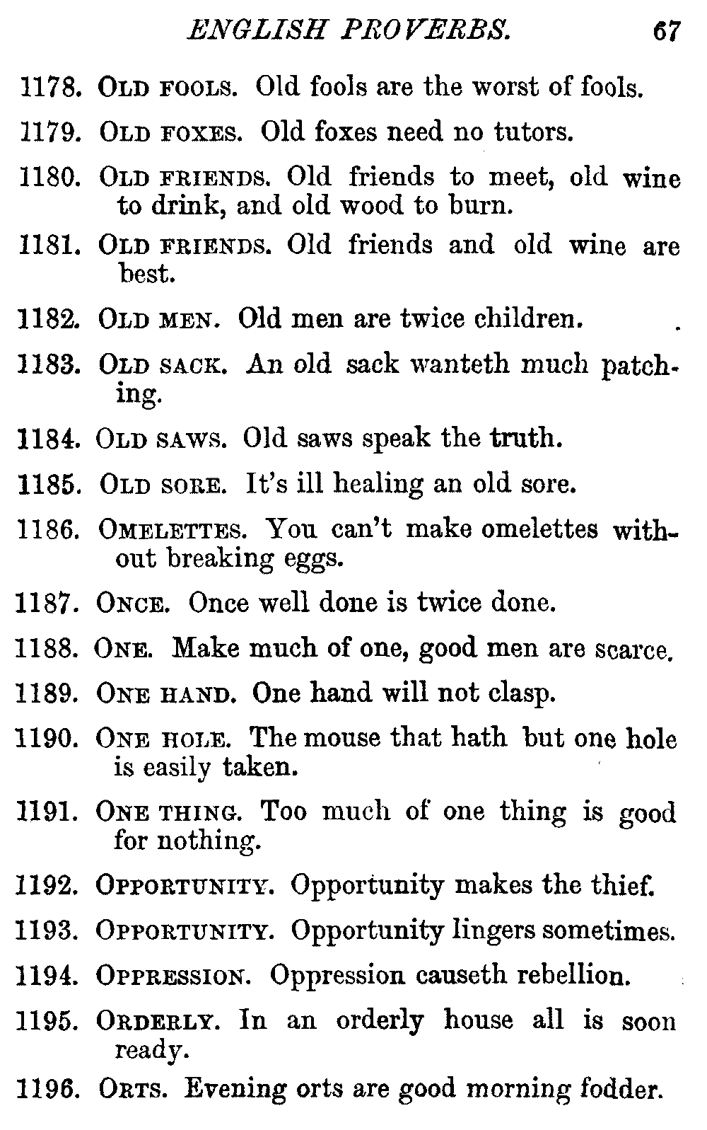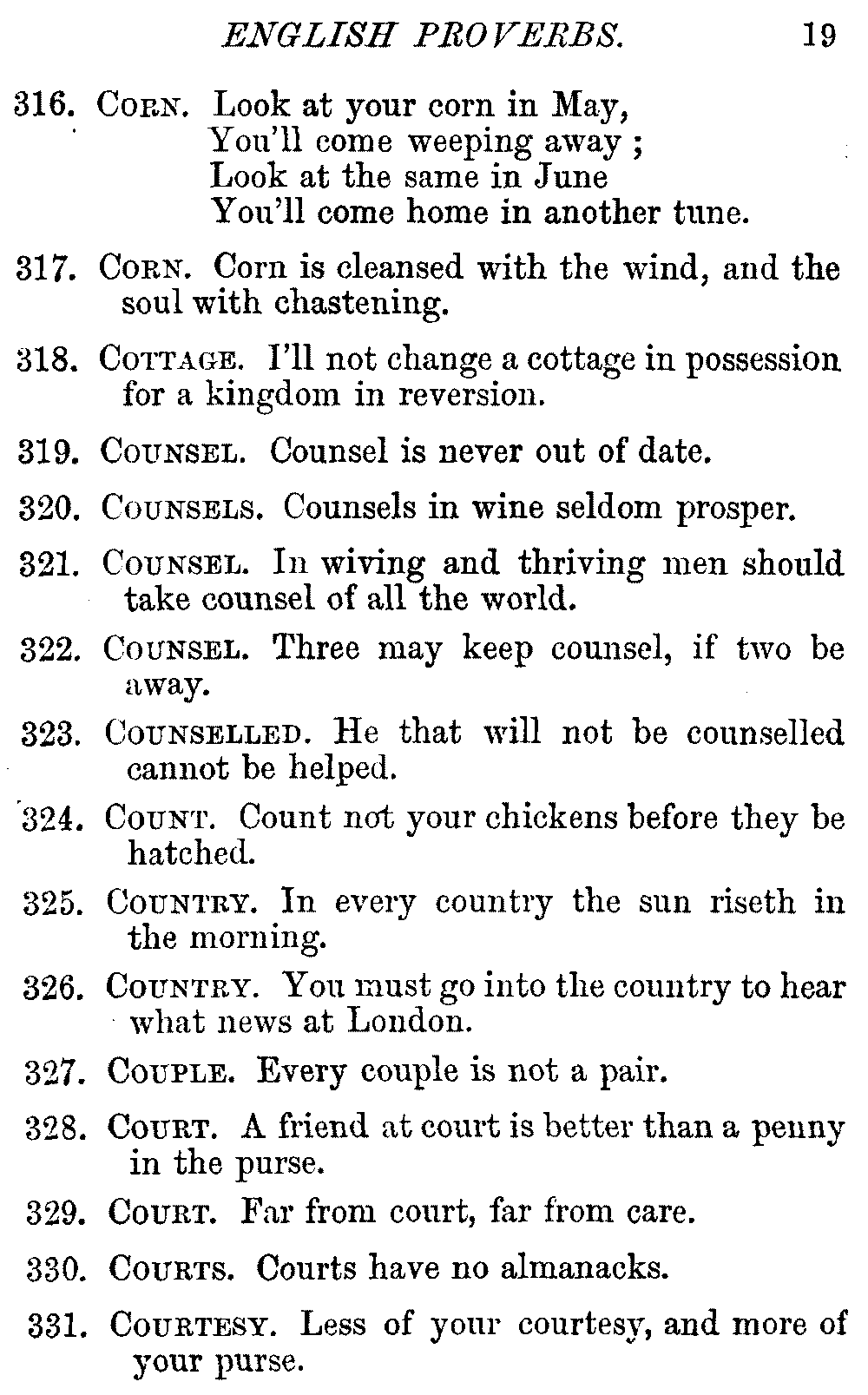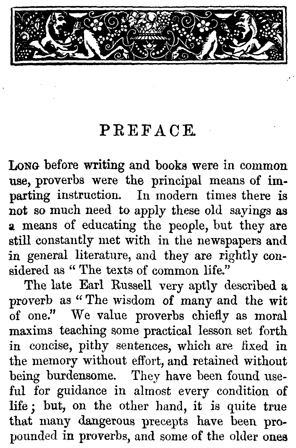 The late Earl Russell very aptly described a proverb as "The wisdom of many and the wit of one." We value proverbs chiefly as moral maxims teaching some practical lesson set forth in concise, pithy sentences, which are fixed in the memory without effort, and retained without being burdensome. They have been found useful for guidance in almost every condition of life; but, on the other hand, it is quite true that many dangerous precepts have been propounded in proverbs, and some of the older ones [vi]gave such questionable advice, or were couched in such objectionable language, that they have been very properly omitted from every collection intended, as this is, for general use. Other old proverbs have become obsolete, and as their meaning is now obscure, they have not been included in the Dictionary.