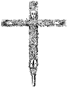 Charged with worshipping a cross, he says:—“As for him who affirms that we are the priesthood of a cross, we shall claim him as our co-religionist. A cross is in its material a sign of wood; amongst yourselves also the object of worship is a wooden figure. Only, whilst with you the figure is a human one, with us the wood is its own figure. Never mind for the present what is the shape, provided the material is the same; the form, too, is of no importance, if so be it be the actual body of a god. If, however, there arises a question of difference on this point, what, let me ask, is the difference between the Athenian Pallas or the Pharia Ceres, and wood formed into a cross, when each is represented by a rough stock without form, and by the merest rudiment of a statue of unformed wood? Every piece of timber which is fixed in the ground in an erect position is a part of a cross, and indeed the greater portion of its mass. But an entire cross is attributed to us, with its transverse beam, of course, and its projecting seat. Now you have the less to excuse you, for you dedicate to religion only a mutilated imperfect piece of wood, while others consecrate to the sacred purpose a complete structure. The truth however, after all, is that your religion is all cross, as I shall show. You are indeed unaware that your gods in their origin have proceeded from this hated cross. Now every image, whether carved out of wood or stone, or molten in metal, or produced out of any other richer material, must needs have had plastic hands engaged in its formation. Well then, this modeller, before he did anything else, hit upon the form of a wooden cross, because even our own body[Pg 17] assumes as its natural position the latent and concealed outline of a cross. Since the head rises upwards and the back takes a straight direction and the shoulders project laterally, if you simply place a man with his arms and hands out-stretched, you will make the general outline of a cross. Starting then from this rudimental form and prop, as it were, he applies a covering of clay, and so gradually completes the limbs and forms the body, and covers the cross within with the shape which he meant to impress upon the clay; then from this design, with the help of compasses and leaden moulds, he has got all ready for his image which is to be brought out into marble, or clay, or metal, or whatever the material be of which he has determined to make his god. This then is the process: after the cross-shaped frame the clay; after the clay the god. In a well-understood routine the cross passes into a god through the clayey medium. The cross then you consecrate, and from it the consecrated deity begins to derive its origin. By way of example let us take the case of a tree which grows up into a system of branches and foliage, and is a reproduction of its own kind, whether it springs from the kernel of an olive, or the stone of a peach, or a grain of pepper which has been duly tempered under ground. Now if you transplant it or take a cutting off its branches for another plant, to what will you attribute what is produced by the propagation? Will it not be to the grain, or the stone, or the kernel? Because as the third stage is attributable to the second, and the second in like manner to the first, so the third will have to be referred to the first, through the second as the mean. We need not stay any longer in the discussion of this point, since by a natural law every kind of produce throughout nature refers back its growth to its original source; and just as the product is comprised in its primal cause, so does that cause agree in character with the thing produced. Since then, in the production of your gods, you[Pg 18] worship the cross which originates them, here will be the original kernel and grain from which are propagated the wooden materials of your idolatrous images. Examples are not far to seek. Your victories you celebrate with religious ceremony as deities, and they are more august in proportion to the joy they bring you. The frames on which you hang up your crosses—these are as it were the very core of your pageants. Thus in your victories the religion of your camp makes even crosses objects of worship; your standards it adores, your standards are the sanction of its oaths, your standards it prefers before Jupiter himself. But all that parade of images and that display of pure gold, are as so many necklaces of the crosses. In like manner also in the banners and ensigns, which your soldiers guard with no less sacred care, you have the streamers and vestments of your crosses. You are ashamed, I suppose, to worship unadorned and simple crosses.”