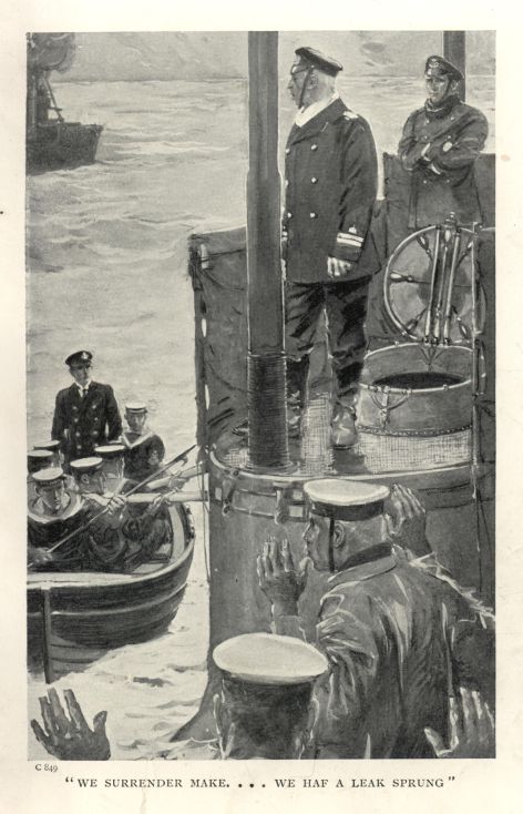 "Thanks for letting me see them, Herr Kapitan," he remarked, "but now I must ask you to order your crew below and consider yourself a prisoner of war. I warn you that at any attempt at resistance your ship will be sent to the bottom."