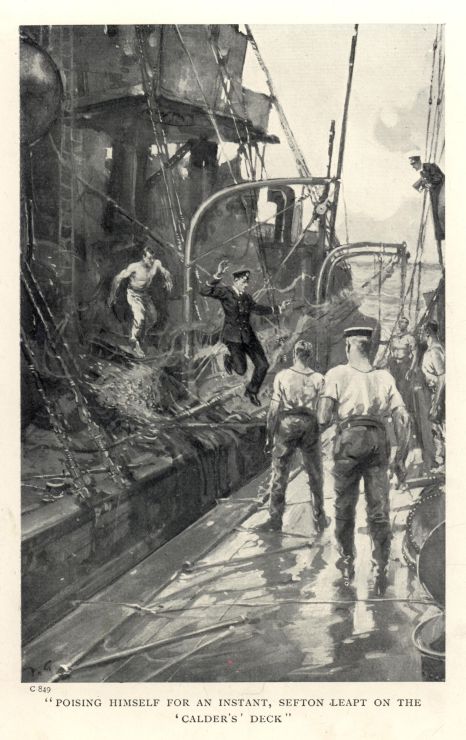 "Poising himself for an instant, Sefton leapt on the 'Calder's' deck"
