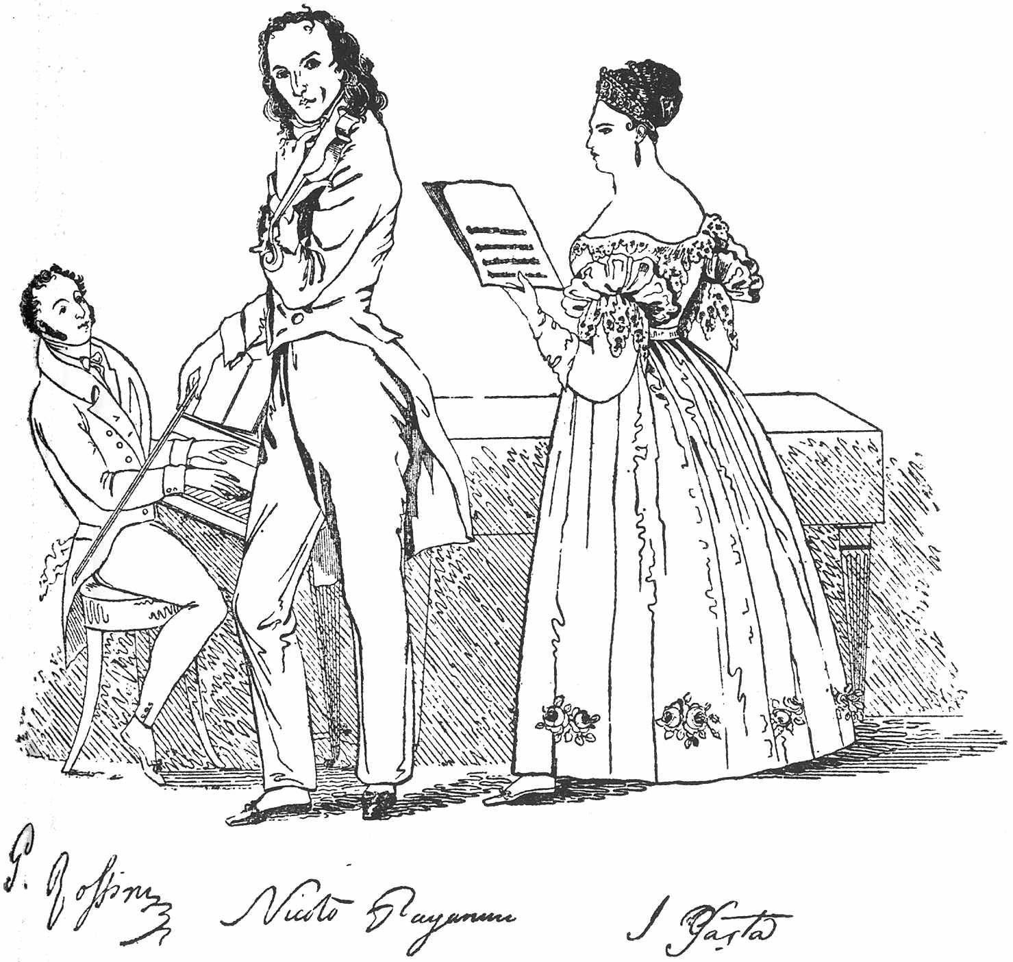 (Paganini will cause his violin to be heard.) He was received with no less enthusiasm than at Milan. Paganini then returned to Genoa, but soon left for Venice.[33] There he formed an union with Antonia Bianchi, the young singer he introduced at Genoa, who became his companion, sang at his concerts, and shared his triumphs.