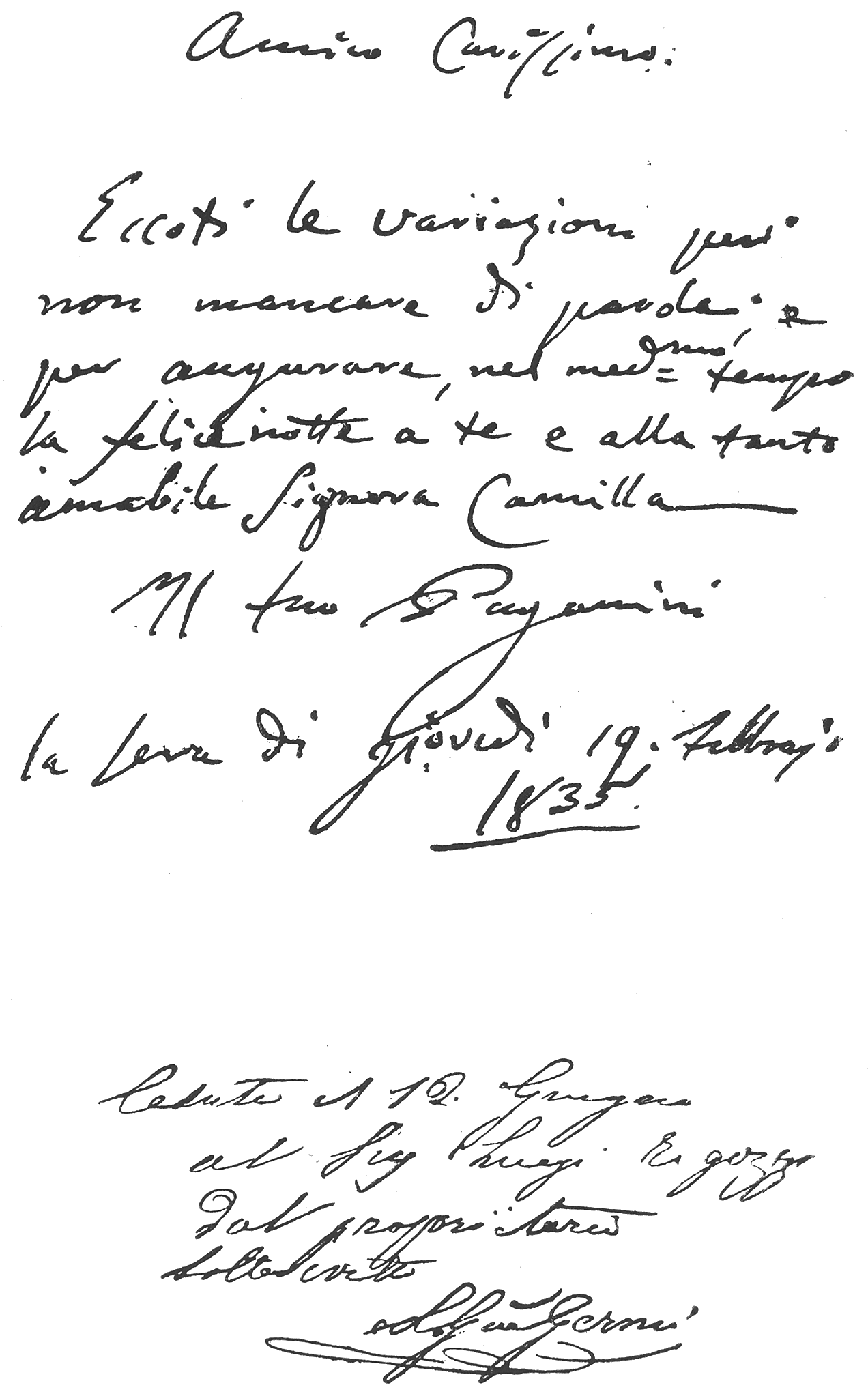 Dr. Burney, in his account of Italian Opera in London during the last half of the eighteenth century, names a Signor and Signora Paganini as engaged for the season of 1760-61. They came from Berlin, and the Doctor is ungallant enough to say that the lady, known as "The Paganini," was not young. She made her début on November 22, 1760, in Galuppi's "Il Mondo della Luna," in a buffa part, and was very captivating. At her benefit, when another opera by Galuppi was given—"Il Filosofo di Campagna,"—such a crowd assembled as had never been seen on any other occasion. Not one third of those who presented themselves at the Opera-house were able[3] to obtain admission. "Caps were lost, and gowns torn to pieces, without number or mercy, in the struggle to get in. Ladies in full dress, who had sent away their carriages, were obliged to appear in the streets and walk home without caps or attendants." "Luckily the weather was fine," adds the Doctor, who witnessed this uncommon spectacle. "The Paganini" thus anticipated the extraordinary triumphs of the more famous artist of half a century later. Signor Paganini, the husband, was only "a coarse first man," and sang almost without a voice. Next comes Ercole Paganini, born at Ferrara, about 1770, the composer of several operas, produced at La Scala, Milan, and at Florence, from 1804 to 1810. A tenor singer named Paganini appeared in opera at Florence in 1830, was decidedly successful and became highly popular in Genoa in 1836. After Francesco Lamperti was appointed (in 1850) professor of singing at the Conservatorio, Milan, among the good pupils he turned out was one named Paganini, of whom, however, no particulars are forthcoming. In 1865, Cesare Paganini, a theoretical writer, published a treatise at Florence; and in November, 1898, Signora Franceschati-Paganini was the Brünnhilde in a performance of "Götterdämmerung," at Bologna. Then there was Dr. Paganini, who was perhaps the brother in whose charge young Nicolo was allowed to go to Lucca in 1798. Whomsoever he may have been, this Dr. Paganini died in 1835, which event gave rise to a rumour that the great violinist was dead—a rumour happily untrue. This Dr. Paganini was not a fiddle-player, but a fiddle-fancier.[4] He possessed a violin ornamented with mother-o'-pearl and ebony, which had belonged to a Shah of Persia, the favourite violin of Lord Byron (so it was said), one that had belonged to Stanislaus of Poland, father-in-law of Louis XV., one that had been played upon by Charles IV. of Spain (the enthusiast who had quartet performances at six in the morning, and who scorned to "keep time,") and another, once the property of that monarch's favourite, Don Manuel de Godoy, Duke of Alcudia.