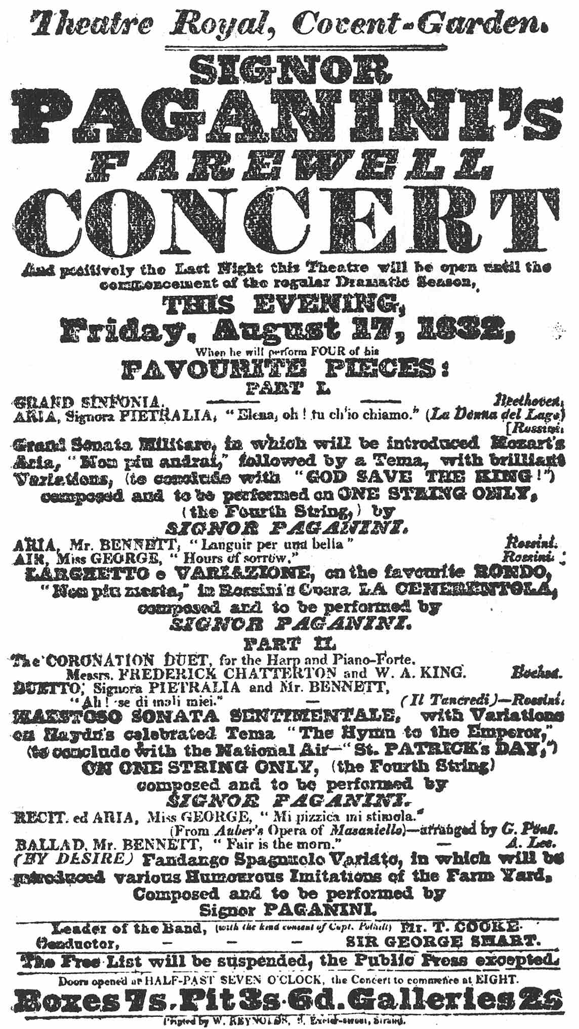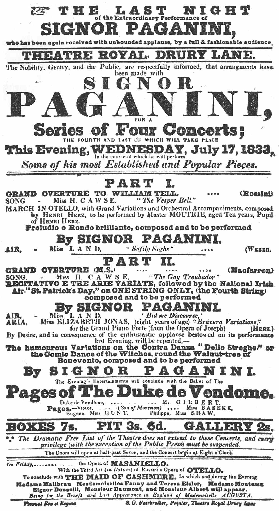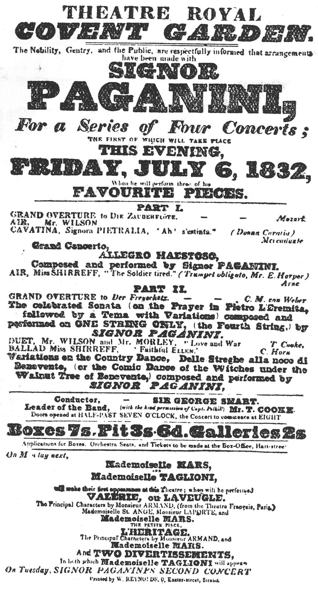 In 1825, Paganini was again at Naples, where he gave a concert, causing his name to be announced in the bills as—