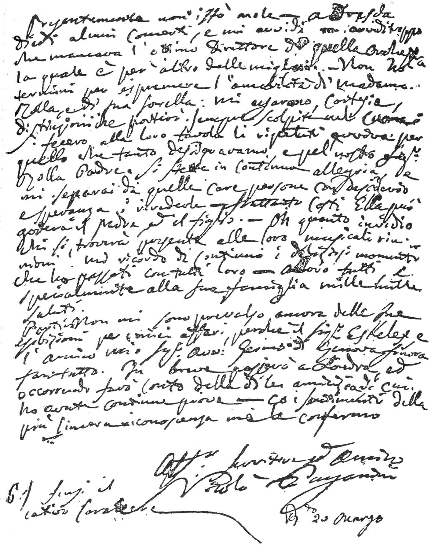 When Nicolo with his father arrived at Rolla's house, the famous violinist was ill in bed. His wife showed the visitors into an apartment adjoining, and went to inform her husband of their arrival, but he was disinclined to receive the strangers. On a table in the room where they were waiting lay a violin, and a composition in manuscript—Rolla's latest concerto. Paganini, prompted by his father, took up the violin, and played the concerto through. Astonished at the performance, Rolla asked what virtuoso was in the next room, and on being told it was only a boy he had heard, would not credit the statement without the evidence of his own eyes. To the father's entreaty Rolla replied that he could teach the boy nothing; it would waste his time[11] to remain with him. He must go to Ferdinando Paer, who would teach him composition.