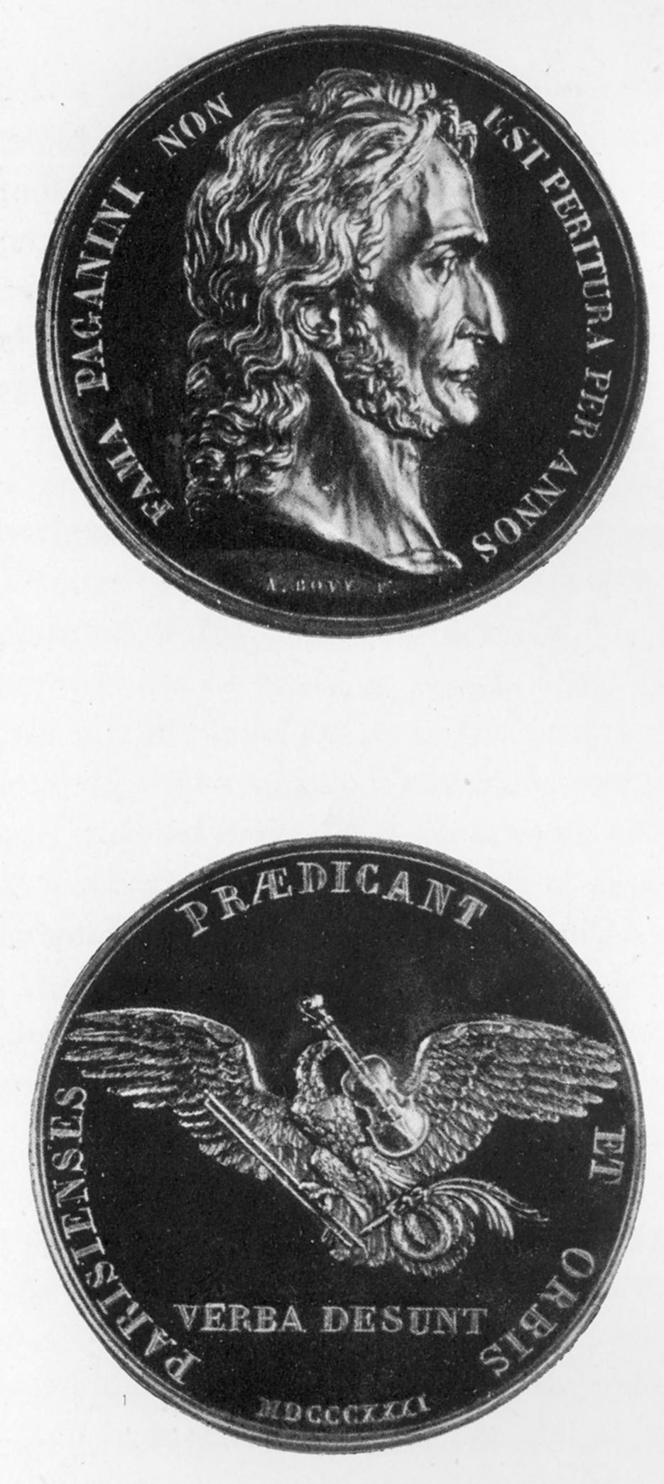 The Court Gazette announced that His Majesty, as a testimony of his admiration, had sent Paganini a diploma, appointing him one of the Emperor's chamber musicians, and exempting him from the usual fees of office; this was accompanied by a splendid gold snuff-box set with[39] brilliants. The chief magistrate of Vienna presented Paganini with the gold medal of San Salvador; and, to crown all, a medal was struck in Paganini's honour. This, the work of J. Lang, has on the face a portrait in relief of the violinist, with the inscription:—