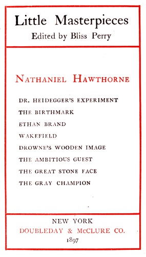 "Dr. Heidegger's Experiment," with which the present volume opens, is Hawthorne's earliest treatment of the elixir of immortality theme, which haunted him throughout his life and was the subject of the unfinished romance which rested upon his coffin. He handles it daintily, poetically here, with an irony at once exquisite and profound. "The Birthmark" represents another favorite theme: the rivalry between scientific passion and human affection. It is not wholly free from the morbid fancy which Hawthorne occasionally betrays, and which allies him, on one side of his many-gifted mind, with Edgar Allan Poe; but the essential sanity of Hawthorne's moral, and the perfection of the workmanship, render "The Birthmark" worthy of its high place among modern short stories. "Ethan Brand" dates obviously from the sojourn at North Adams, Massachusetts, described in the "American Note-Book." Fragmentary as it is, it is one of Hawthorne's most powerful pieces of writing, the Unpardonable Sin which it portrays—the development of the intellect at the expense of the heart—being one which the lonely romancer himself had had cause to dread. The motive of the humorous character sketch entitled "Wakefield" is somewhat similar: the danger of stepping aside, even for a moment, from one's allotted place. "Drowne's Wooden Image" is a charming old Boston version of the artistic miracles made possible by love. In "The Ambitious Guest," the familiar story of the Willey House, in the Notch of the White Hills, is told with singular delicacy and imaginativeness, while "The Great Stone Face," a parable after Hawthorne's own heart, is suggested by a well-known phenomenon of the same mountainous region. Hawthorne's numerous tales based upon New England history are represented by one of the briefest, "The Gray Champion," whose succinct opening and eloquent close are no less admirable than the stern passion of its dramatic climax.