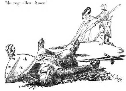 "Bij den Heer, die mij schiep!" sprak Carel, de Koning: "tenzij ge mij bekent hoe gij heet, en wie ge zijt, Heer Ridder—zoo hebt gij uw laatste dagen beleefd. Maken wij een eind aan dezen strijd: mag ik met eere doorgaan, den naam wetende van wien ik bevocht —ik zal u heen laten rijden."