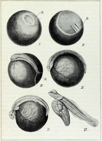 I.Ei mit Keimscheibe, k fixierte Randstelle derselben, Hinterende des Embryo. II. Ausbreitung der Keimscheibe mit Embryonal- oder Primitivwulst, k fixierte Stelle. III. Stadium mit stark nach vorn verlängerter und vortretender Embryonalanlage der Rückenteile. IV. und V. Weitere Stadien, der Dotter ist ganz von den Keimscheiben umwachsen, Kopf und Schwanz heben sich ab, letzterer wächst nach hinten in die Länge. VI. Junger Fisch mit Dottersack, in diesem die Blutgefäße und Fetttropfen.