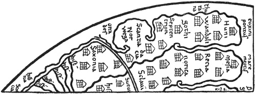 [Pg 11]Another purely legendary feature in the description of the fight is that of Freydis frightening the Skrælings by taking her breasts out of her sark and whetting the sword on them (“ok slettir á sverdit”). As it stands in the saga this incident is not very comprehensible, and appears to have been borrowed from elsewhere. Possibly, as Moltke Moe thinks, it may be connected in some way with the legend of the wood-nymph with the long breasts who was pursued by the hunter. The mention of Unipeds and “Einfötinga-land” shows that classical myths have also been adopted. The idea was, moreover, widely current in the Middle Ages. Thus in the so-called Nancy map of Claudius Clavus (of about 1426) we find “unipedes maritimi” in the extreme north-east of Greenland. In the “Heimslýsing” in the Hauksbók [F. Jónsson, 1892, p. 166] and in the “Rymbegla” [1780] “Einfötingar” are mentioned with a foot “so large that they shade themselves from the sun with it while asleep” (cf. also Adam of Bremen, vol. i. p. 189). But in the Saga of Eric the Red the incident of the Uniped and the pursuit of him are described as realistically as the encounters with the Skrælings. Einfötinga-land is also mentioned in the same manner as Skrælinga-land in its vicinity.