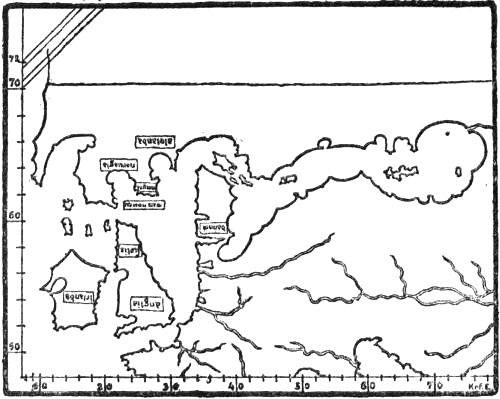 The very mention of the countries to the south-west: first the treeless and rocky Helluland (Labrador ?), then the wooded Markland (Newfoundland ?) farther south, and then the fertile Wineland south of that, may also point to local knowledge. It must be admitted that this could be explained away as having been put together from the general experience that countries in the north are treeless, but become more fertile as one proceeds southward; but the names Helluland and especially Markland have in themselves an appearance of genuineness, as also has Kjalarnes. The different saga-writers, in the Saga of Eric the Red and in the Flateyjarbók’s “Grönlendinga-þáttr,” give different explanations of the reason for the name of Kjalarnes, which shows that the name is an old one and that the explanations have been invented later (cf. vol. i. p. 324). A point which agrees remarkably well with the trend of the Labrador coast and may point to a certain knowledge of it, is that Karlsevne steers well to the south-east from Helluland; but this may possibly be[Pg 24] connected with the idea mentioned later in the saga, that Wineland became broader towards the south, and the coast turned eastwards, which was evidently due to the assumption that it was connected with Africa (cf. vol i. p. 326).