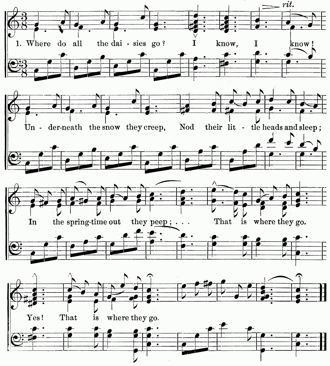 | DICK. And, if I only had a horse, I'd westward, westward take my course; With flying feet and floating mane He'd gallop with me o'er the plain; As lightly as the wind we'd pass Across the waving prairie-grass, And strange, tall blossoms, blue and red, Would nod about my horse's head. ELSIE. And, if I had some wings to fly, I'd southward soar along the sky, And see the Southland all aglow With roses, when with us there's snow; And flutter down to rest me, where The starry myrtle scents the air, And humming-birds dart out and in The blossoms of the jessamine; Where his green mate the parrot calls, And oranges, like golden balls, Hang on the boughs, I'd spend the hours In gathering figs, and plucking flowers. LITTLE SUSIE. Oh, if you want to, and you can, I'm willing you should roam; But I'm dear mother's little girl, I'll stay with her at home. MARIAN DOUGLAS.