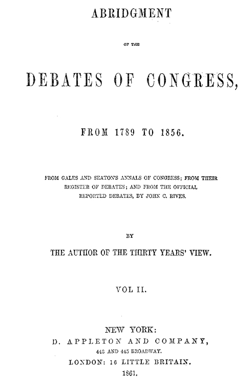 The Project Gutenberg EBook of Abridgment of the Debates of Congress, from 1789 to 1856, Vol. II (of 16), by Thomas Hart Benton This eBook is for the use of anyone anywhere at no cost and with almost no restrictions whatsoever. You may copy it, give it away or re-use it under the terms of the Project Gutenberg License included with this eBook or online at www.gutenberg.org Title: Abridgment of the Debates of Congress, from 1789 to 1856, Vol. II (of 16) Author: Thomas Hart Benton Release Date: September 23, 2012 [EBook #40851] Language: English Character set encoding: ISO-8859-1 *** START OF THIS PROJECT GUTENBERG EBOOK DEBATES OF CONGRESS, 1789-1856, VOL 2 *** Produced by Curtis Weyant, Josephine Paolucci and the Online Distributed Proofreading Team at http://www.pgdp.net. (This file was produced from scans of public domain works at the University of Michigan's Making of America collection.)