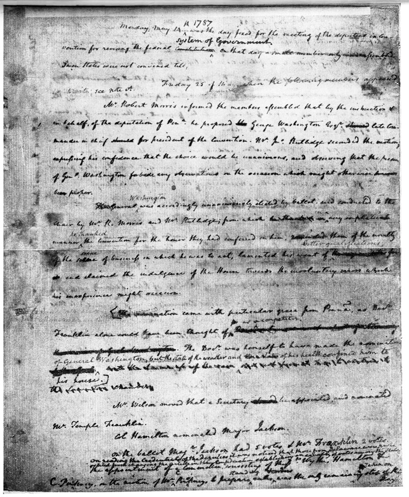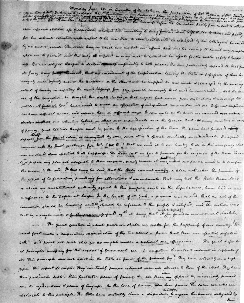 In the years after the convention Madison made a few alterations and additions in his journal, with the result that in parts there is much interlineation and erasure, but after patient study the meaning is always perfectly clear. Three different styles of Madison's own penmanship at different periods of his life appear in the journal, one being that of his old age within five years of his death. In this hand appears the following note at the end of the journal: "The few alterations and corrections made in the debates which are not in my handwriting were dictated by me and made in my presence by John C. Payne."[2] The rare occasions where Payne's penmanship is distinguishable are indicated in the notes to this edition.