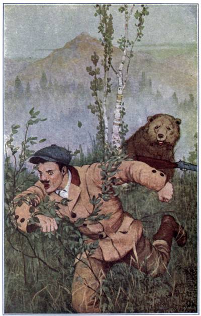 Suddenly I stopped before an extra high log, and gathering myself together, I jumped high over it. I landed upon the upturned belly of an old she bear. There was a sound like the escape of gas from a rubber bag. I passed the cow like a streak of lightning. When I had run a considerable[Pg 252] distance I turned my head and saw the bear running in the opposite direction. I did not stop, however, and I got to the ranch nearly an hour before the old cow.
