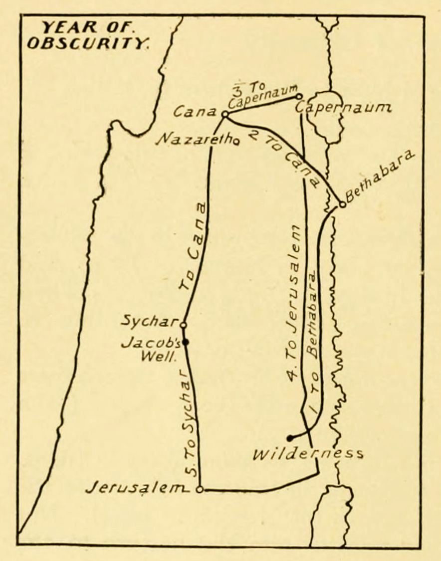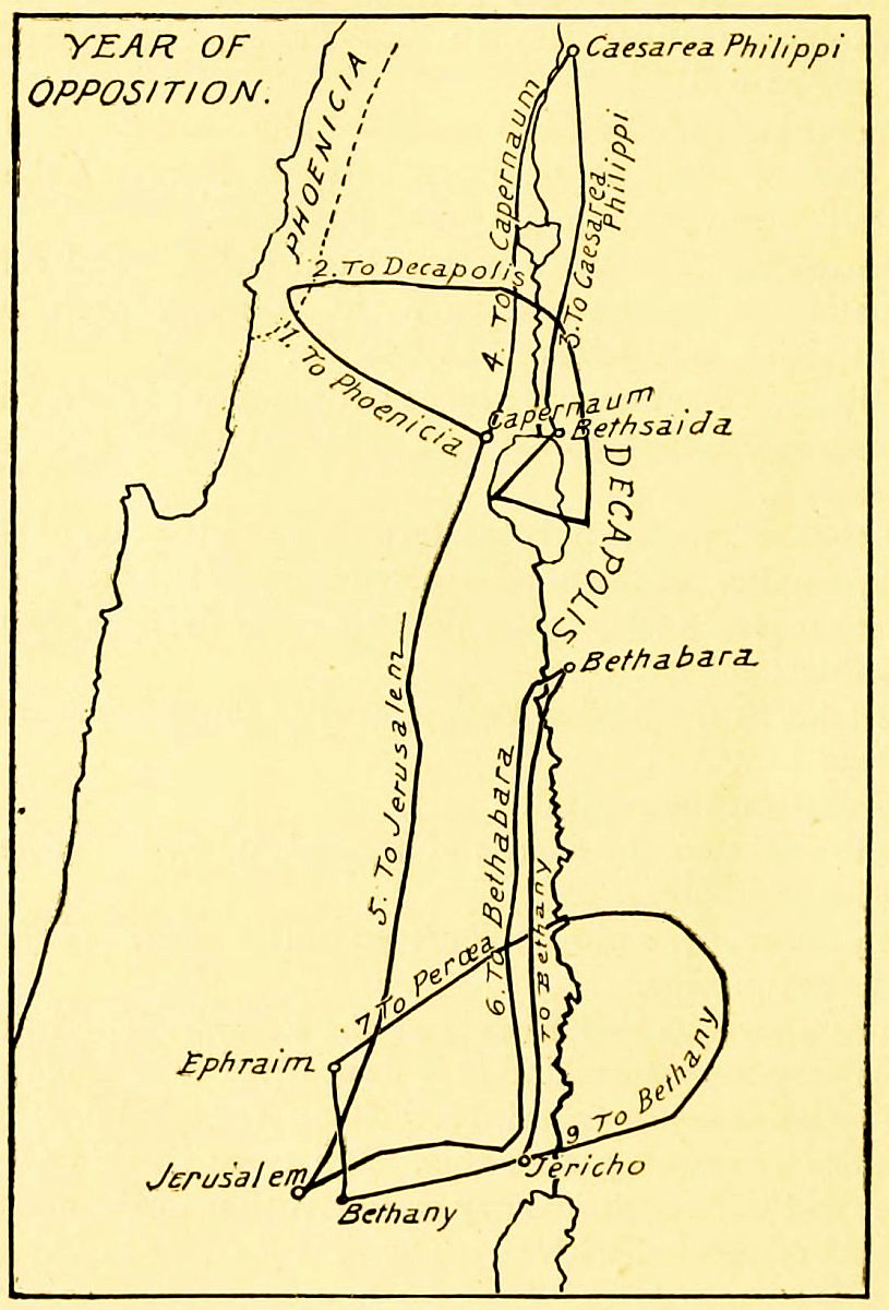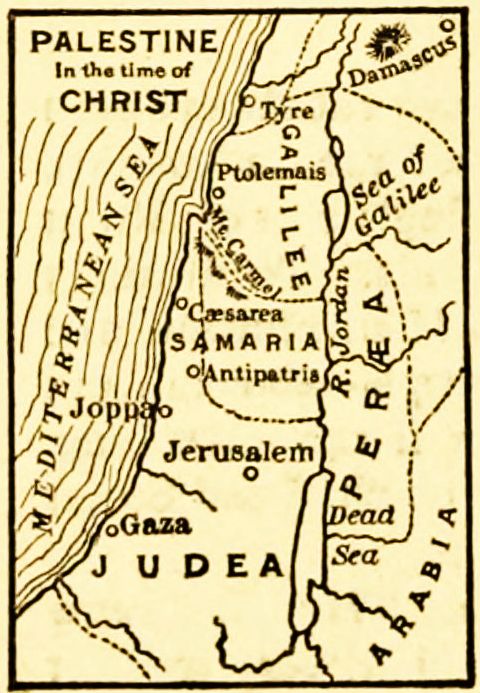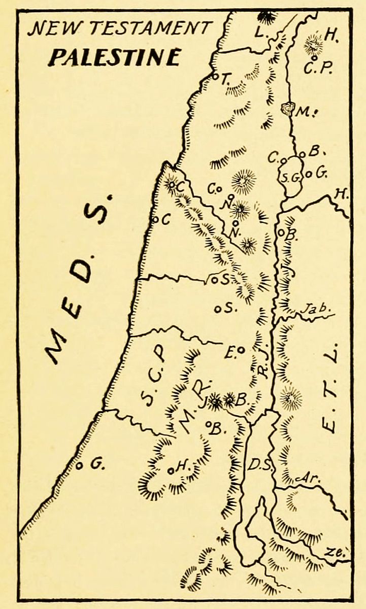 2. The central region was Samaria. See its location. (John 4. 3, 4.) It was, strictly speaking, not a province but a district around the cities of Shechem and Samaria, not extending either to the sea or river, and of uncertain limits, inhabited by a composite people,[15] partly Israelite, partly heathen, in their origin. Note the claim of its people (John 4. 12) and their expectation. (John 4. 25.) Observe how they were regarded by the Jews. (John 4. 9; 8. 48.) Notice that Christ paid no regard to this caste prejudice. (John 4. 10.)