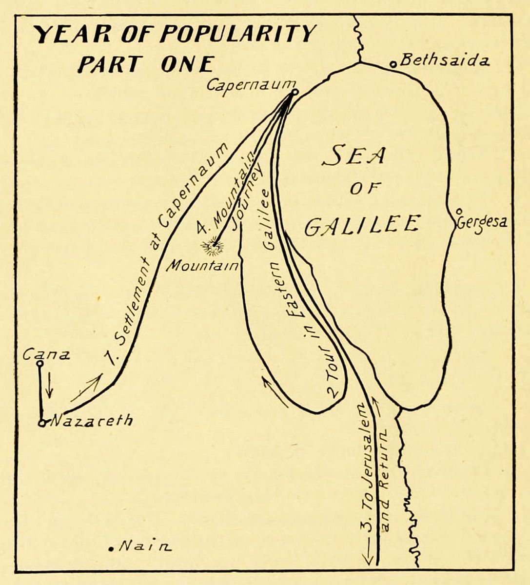 1. In Galilee we note: 1.) Nazareth, due west of the southern end of the Sea of Galilee, the early home of Jesus (Matt. 2. 23; Luke 2. 51). 2.) Nain, south of Nazareth, where he wrought a miracle (Luke 7. 11). 3.) Cana, north of Nazareth, where the first miracle was wrought (John 2. 1). 4.) Capernaum, on the Sea of Galilee, the home of Jesus during most of his ministry, and the scene of many miracles (Luke 4. 31; Mark 2. 1).