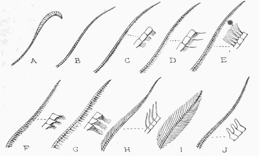 Fig. 2 represents some forms of antennæ found in moths. A, {3}thickened and spreading out towards the tip (dilate); B, simple, thread-like (filiform) structure, without teeth, hairs, or bristles; C, fringed with fine hairs (ciliate); D, fringed with fine hairs, and with longer bristles at the joints (setose ciliate); E, the fringe in tufts (fasciculate); F, toothed, with fine hairs on the teeth (dentate ciliate); G, toothed with hairs in tufts from the teeth (dentate fasciculate); H, I, with double rows of hair scales (bipectinate); in I the projections are continued to the tip, and are themselves fringed with fine hairs, giving the antennæ a very feather-like appearance—the term "plumose" is sometimes used to describe this form of antennæ; in H the pectinations do not reach the apical fourth, which is simple. J, the lamellate, that is, the undersides of the rings or joints are made up of minute plates.