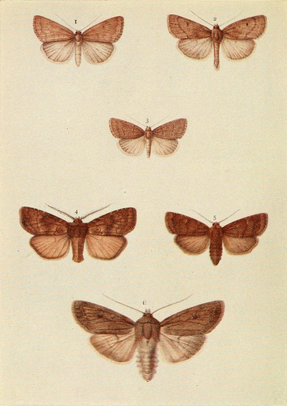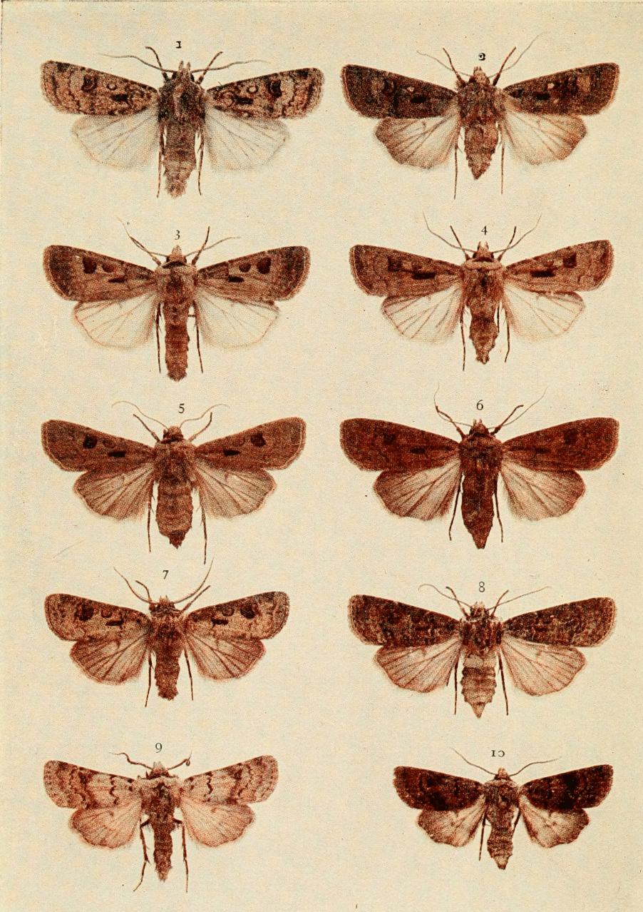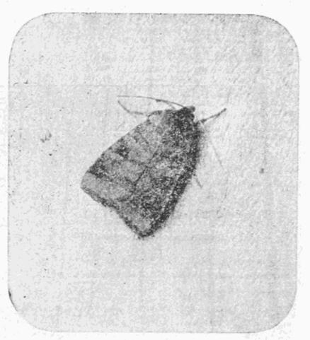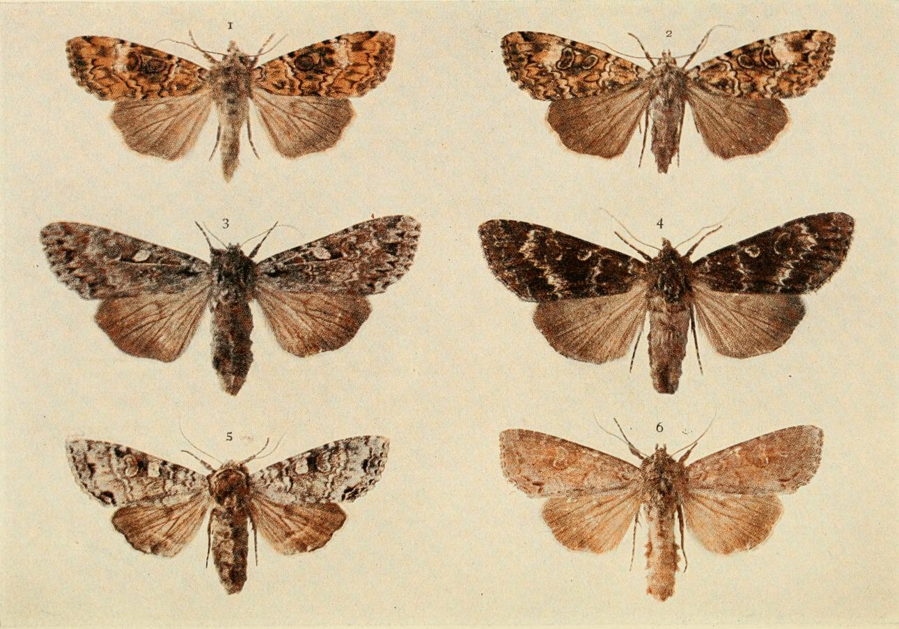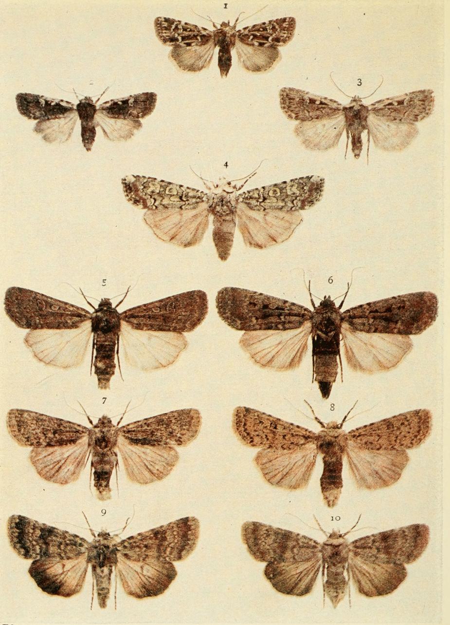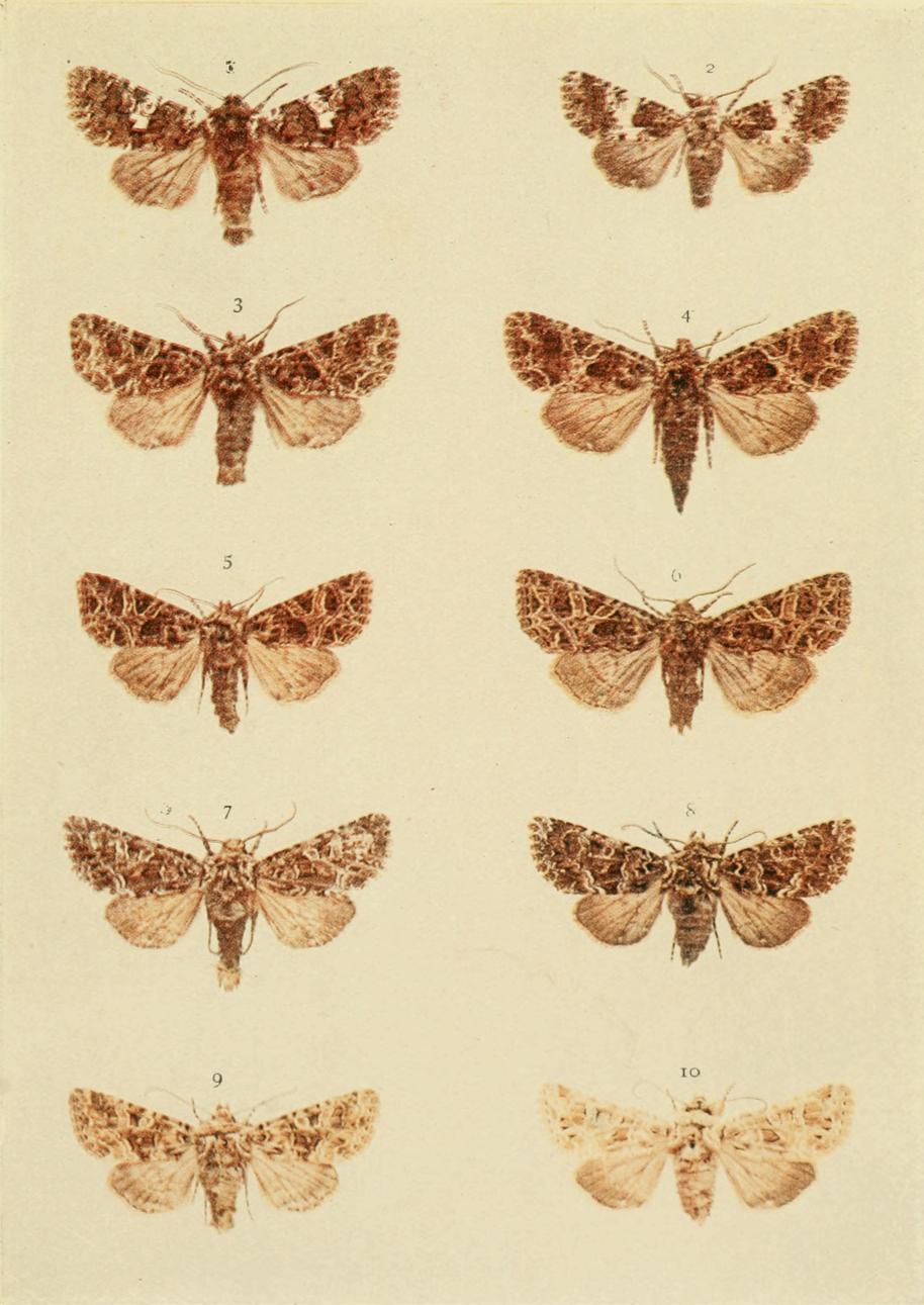 The four specimens shown on Plate 3 represent the more or less ordinary form of this moth. The pale pinkish grey, or reddish brown, fore wings are sometimes tinged with greenish in the paler forms; the irregular shaped band crossing the {18}central area of the wings is olive green, usually dark, and generally edged with whitish. This band is sometimes entire (typical), but more frequently it is broken about the middle. The outer third of these wings is more or less greenish or mottled with green, and a mark near the tip is whitish.